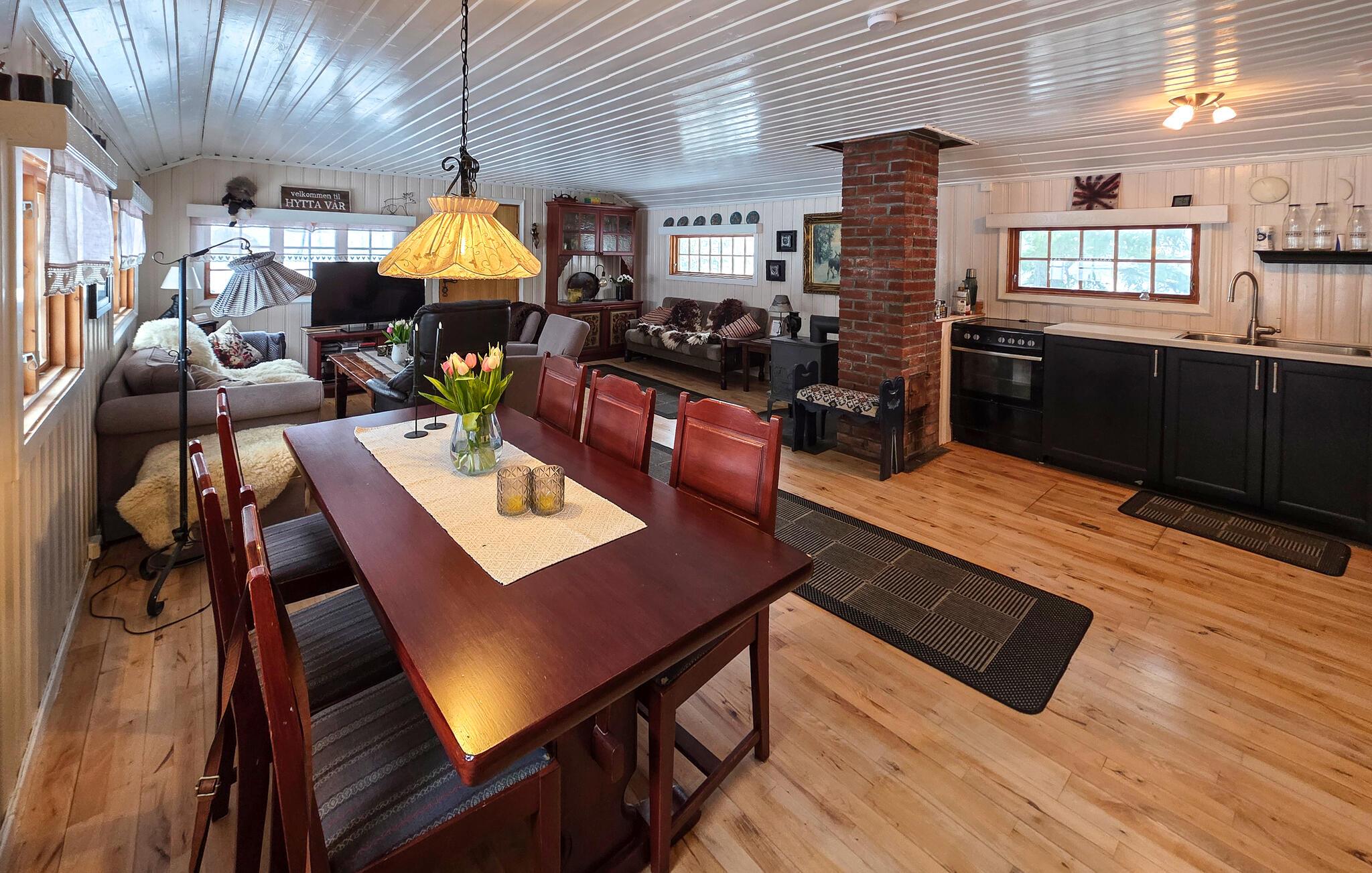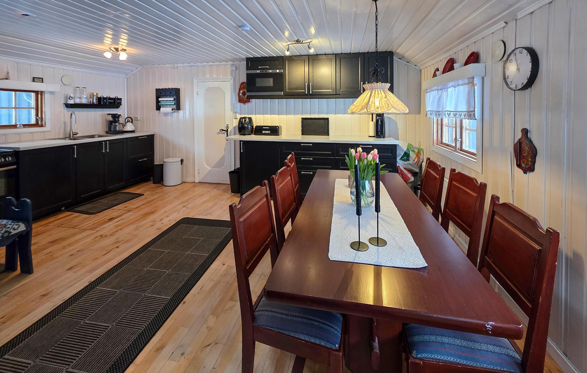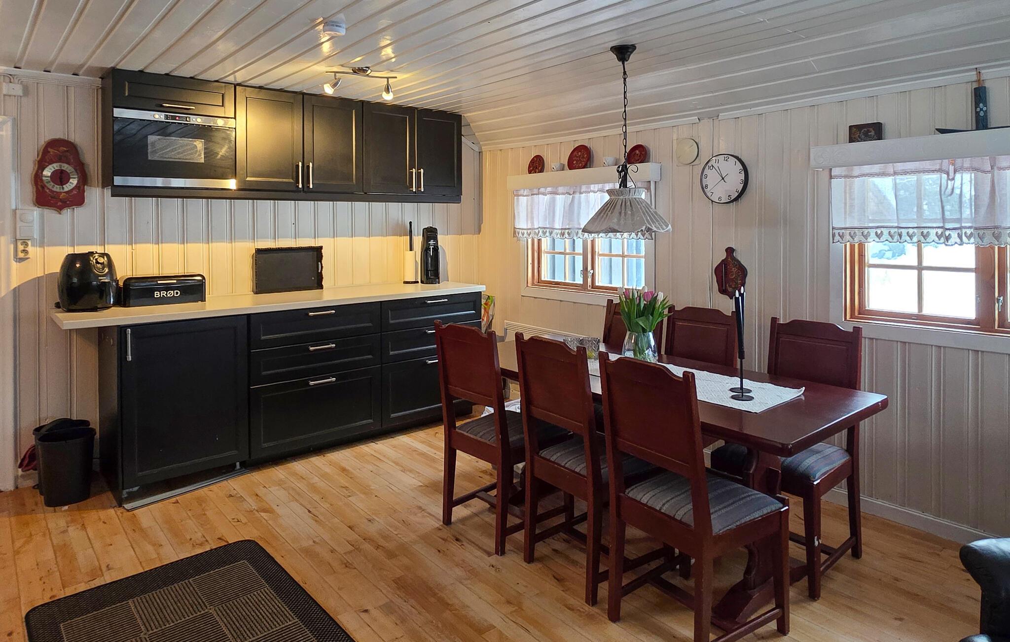 Stig inn og kjenn på den varme, autentiske atmosfæren i denne hytta nær Sundsbarmvatnet. Den åpne stueavdelingen er innredet med komfortable sofaer og rustikke tremøbler. Kos deg ved vedovnen og lytt til knitringen fra peisen. Slå deg ned ved spisebordet og nyt måltidene sammen. Det funksjonelle kjøkkenet har alt du trenger for å tilberede måltidene dine. Etter en aktiv dag kan du nyte den beroligende varmen i badstuen med trepanel og slappe av i musklene.