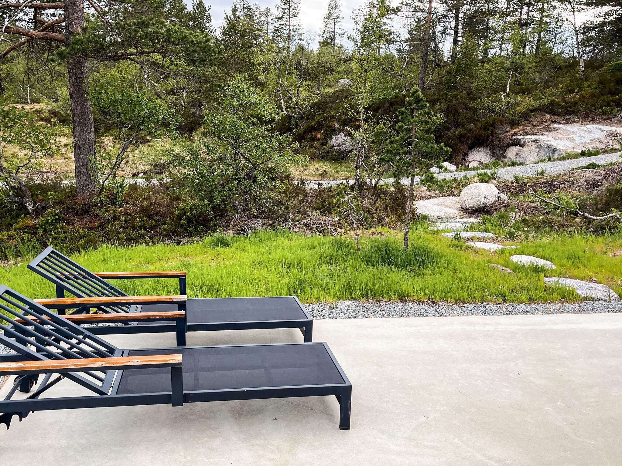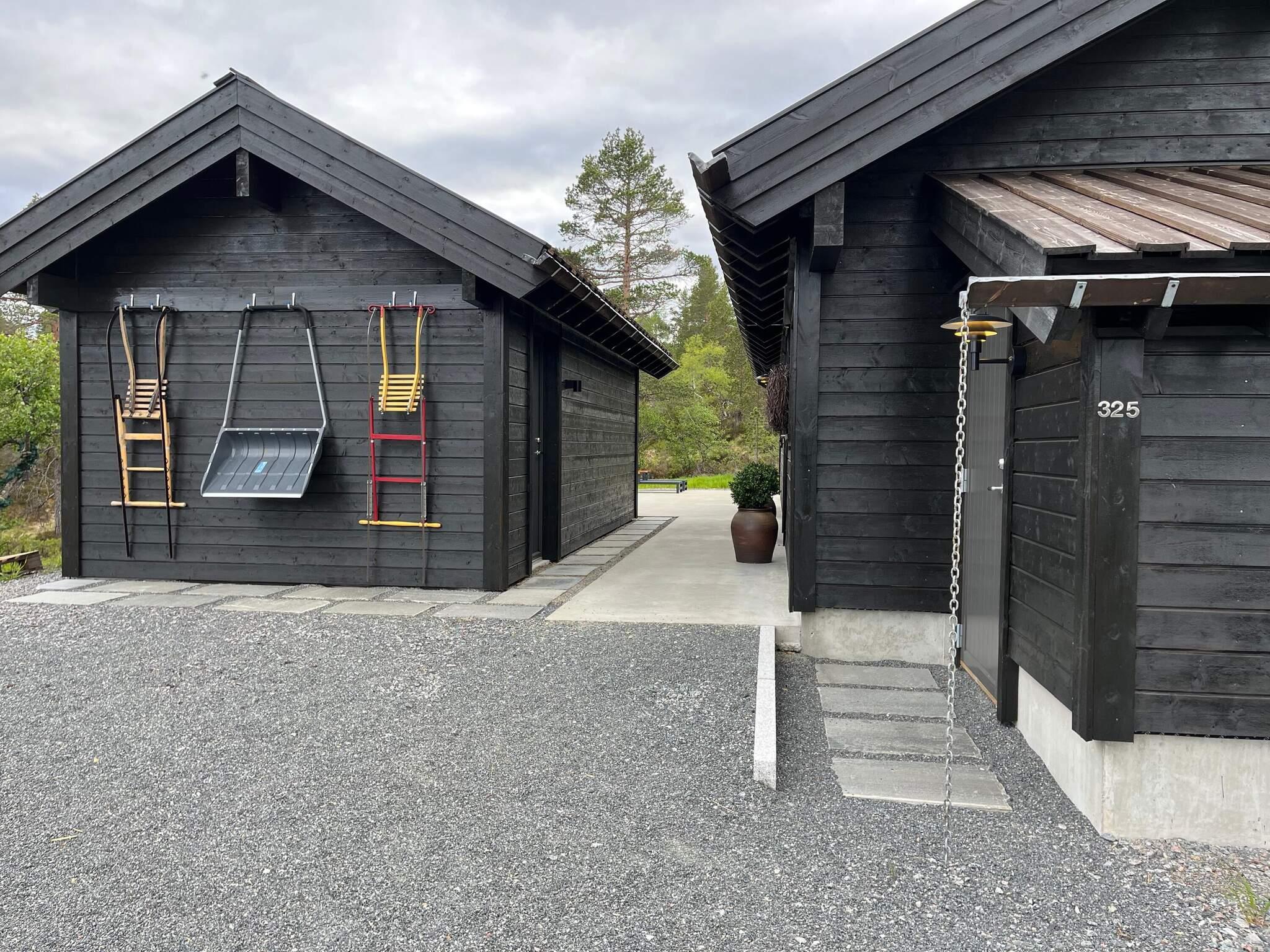 Stort, flott uteområde/terrasse rundt hytta. I en stor bod finner du grill, hagemøbler og annet utstyr.