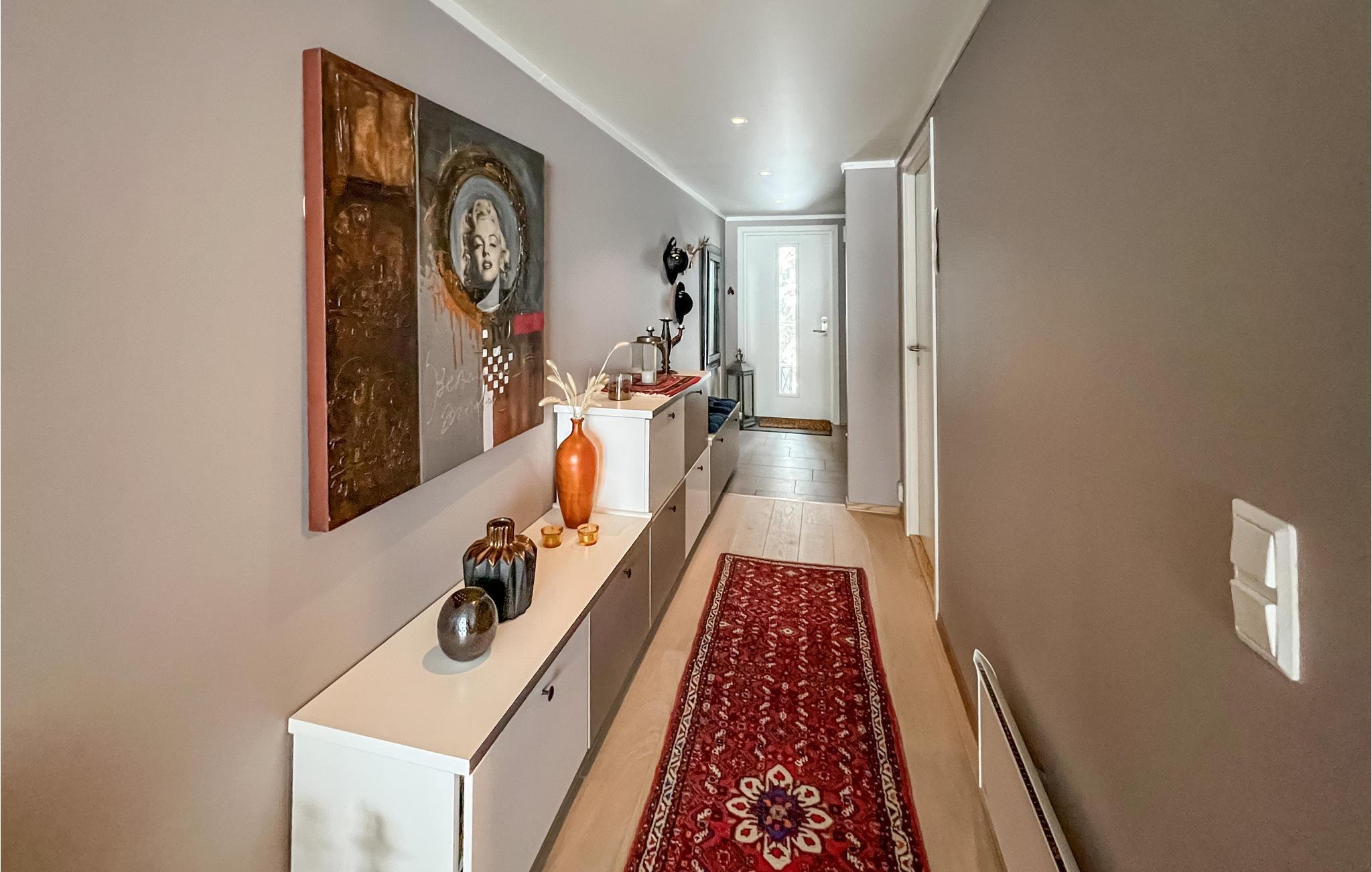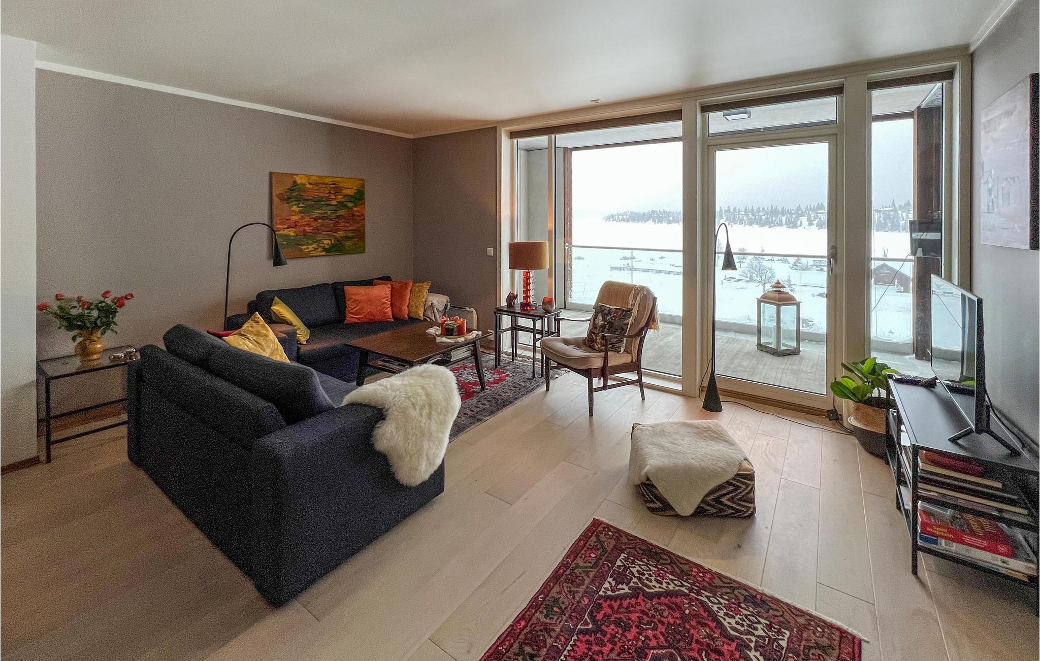 Omgitt av natur og nær Sjusjøen med gode bade- og fiskemuligheter, kan du virkelig stresse ned og oppleve en helbredende nedtrapping i denne vakre leiligheten. Den moderne og omsorgsfullt innredede boligen med vinduer fra gulv til tak og et gjennomtenkt fargevalg innbyr til morsomme spillkvelder, felles matlaging og hyggelige måltider. På kjøligere dager stråler vedovnen ut koselig varme og komfort. Gå ut på balkongen om morgenen for å puste inn den friske morgenluften og la blikket vandre over det eventyrlige landskapet. Ta en spasertur til innsjøen og tilbring en avslappende stund ved vannet.