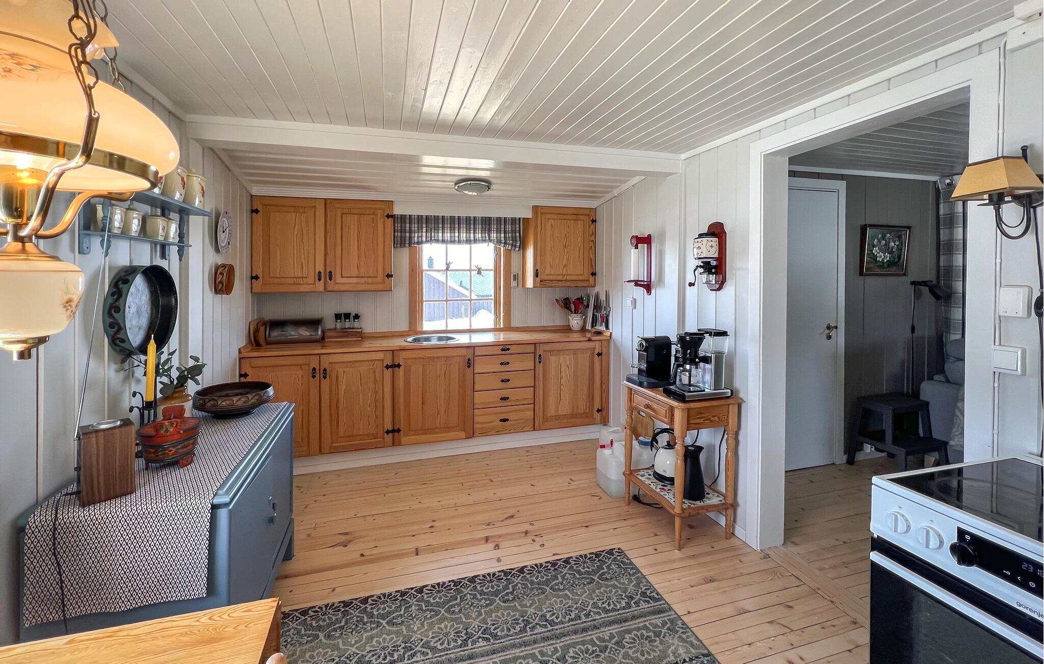 Dette feriehuset er det ideelle tilfluktsstedet for deg som søker avslapning, men som samtidig setter pris på nærheten til spennende aktiviteter og severdigheter. Stig inn i den sjarmerende hytta og la deg fortrylle av den koselige atmosfæren og de omsorgsfullt utformede detaljene. Stuen med sine komfortable sitteplasser og knitrende peis innbyr til avslappende kvelder. Sett deg godt til rette i den romslige hjørnesofaen og nyt ferietiden. Det åpne kjøkkenet gir deg muligheten til å tilberede deilige måltider. Nyt frokosten ved spisebordet mens morgensolen skinner inn gjennom vinduet og bader rommet i et varmt lys.