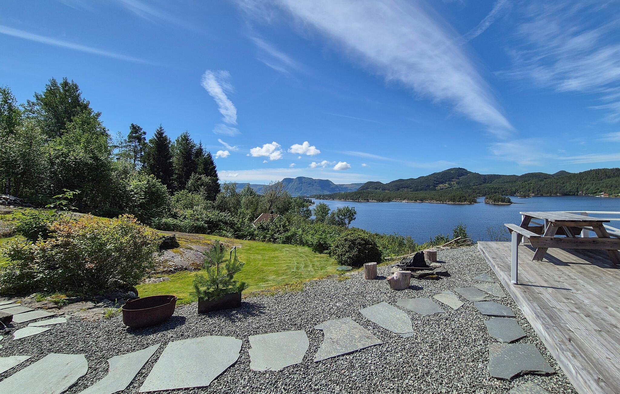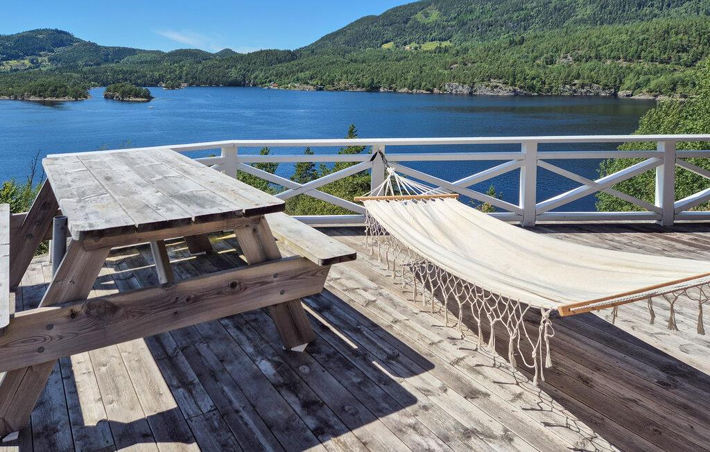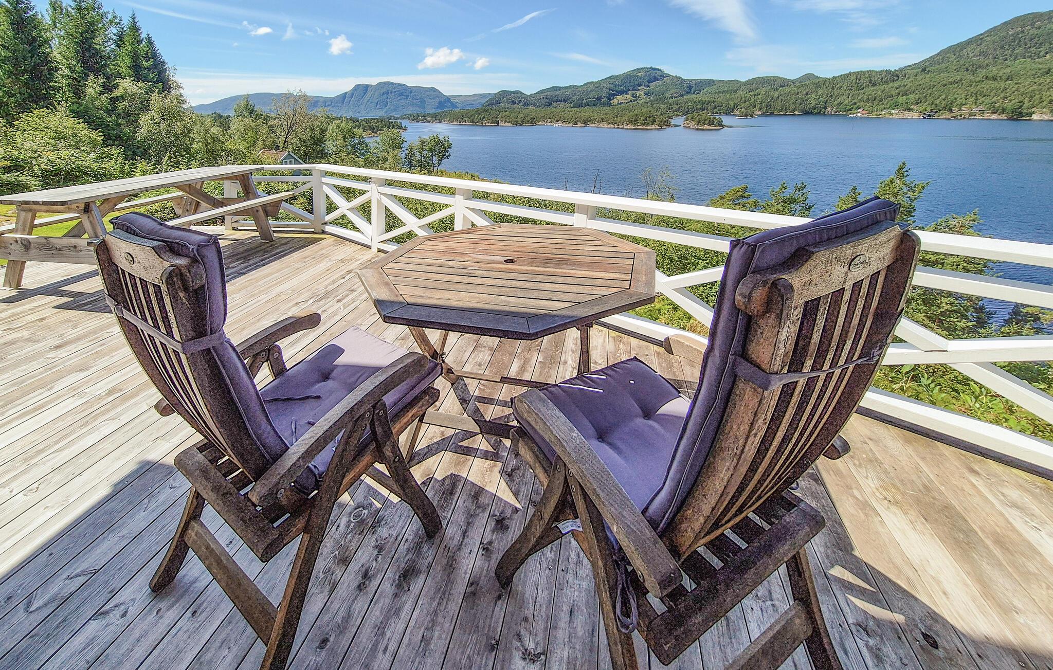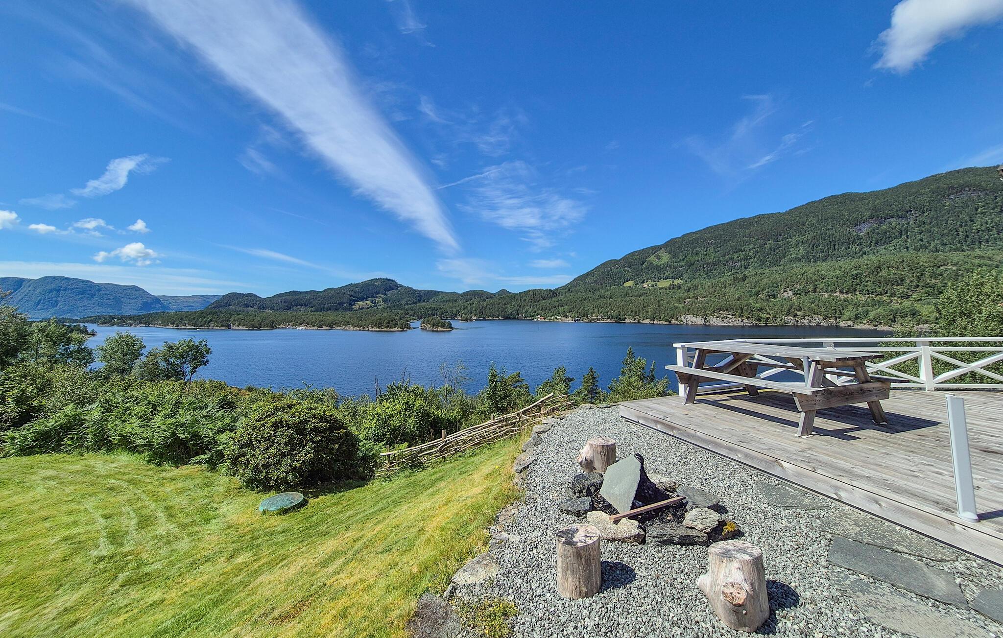 På terrassen kan du slappe av tett på naturen og nyte den fantastiske utsikten, mens en badebrygge inviterer til en forfriskende dukkert i fjorden.