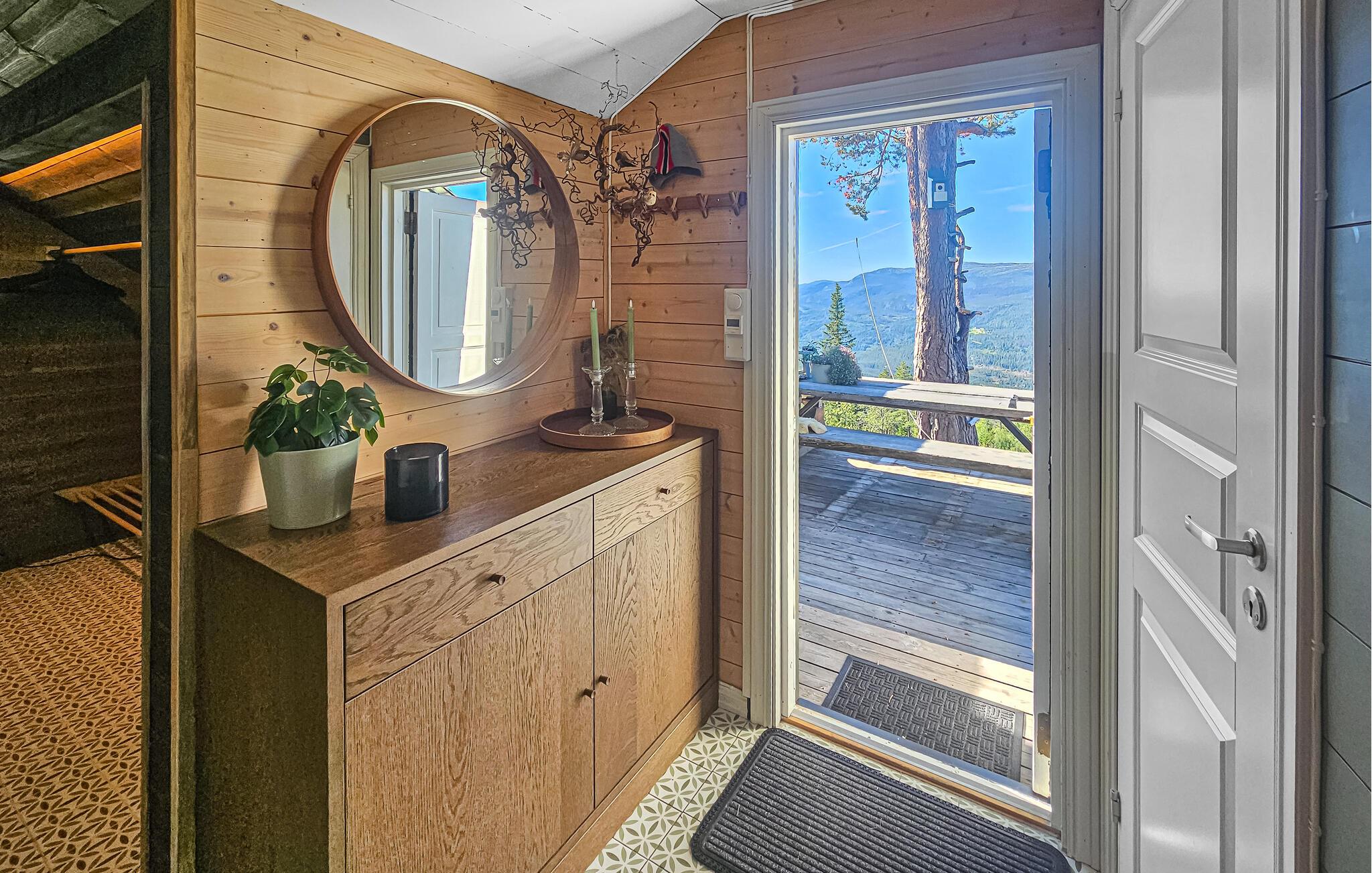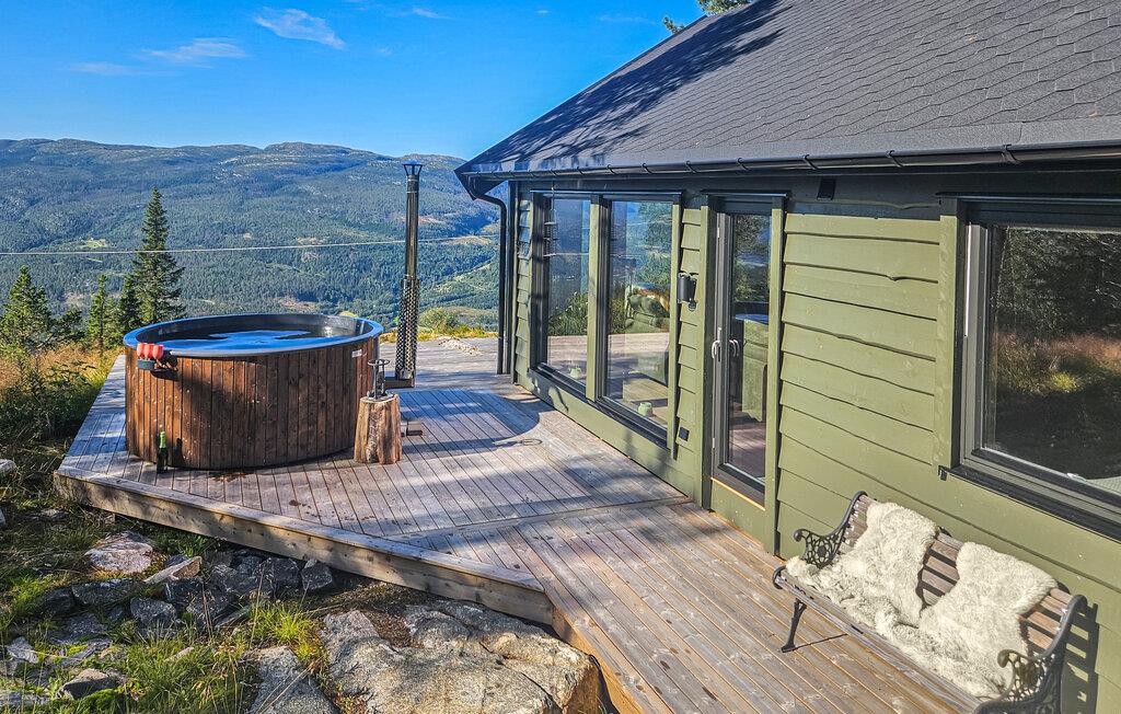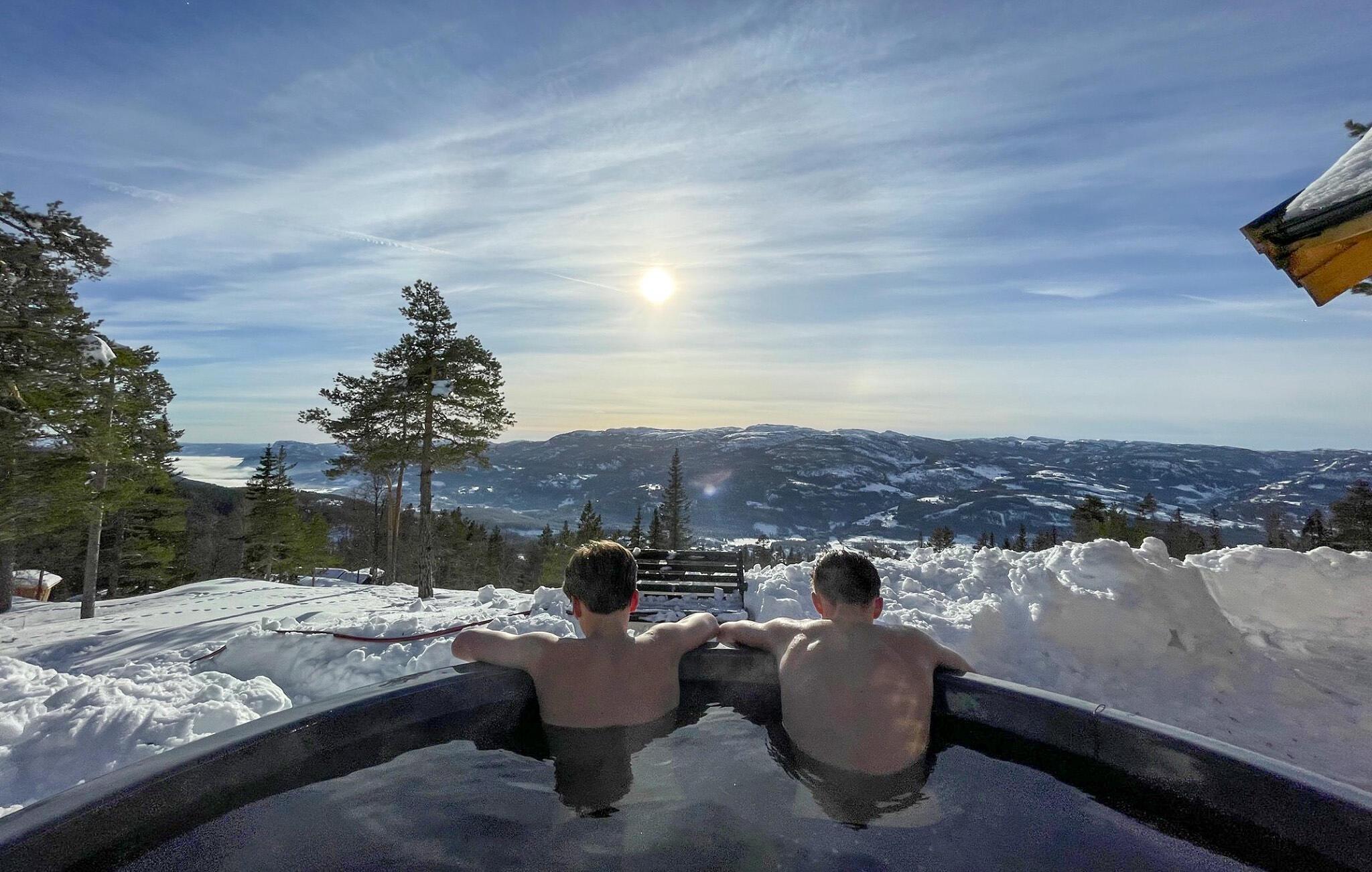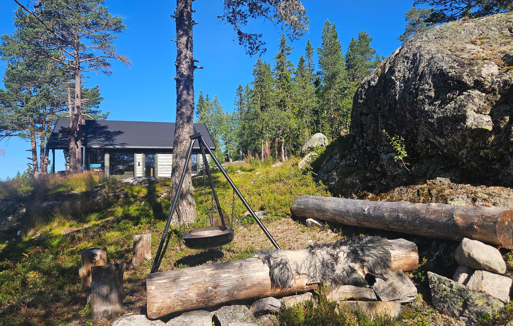 Nyt panoramautsikten over det åpne landskapet utenfor. Du kan også ta et bad i den vedfyrte badestampen og la blikket vandre over fjellandskapet.