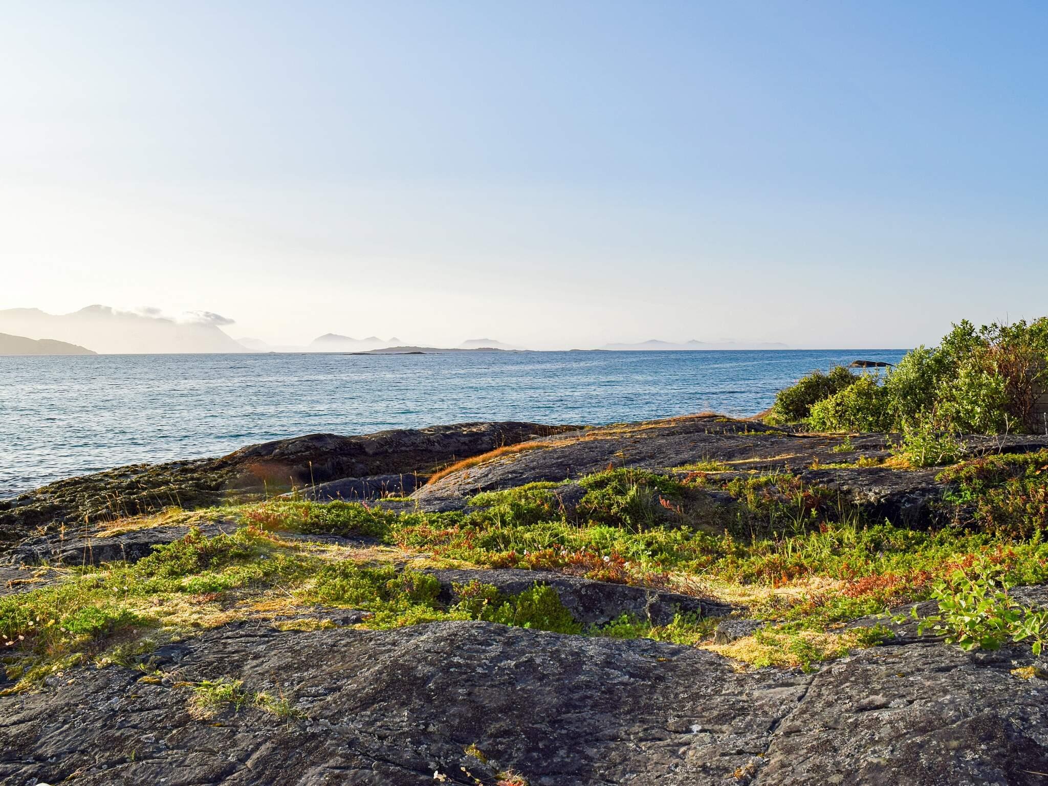 Fra stua og terrassen er det panoramautsikt mot fjorden og Hinnøyas vakre kystlandskap. Her kan du sitte på kveldene og nyte stillheten og den friske havluften, og høre bølgene som slår mot stranden. I de lyse vår- og sommernettene er midnattsola en flott opplevelse her ute ved havet, og på berget nedenfor hytta kan man bli sittende til langt på natt og nyte det praktfulle skuet.