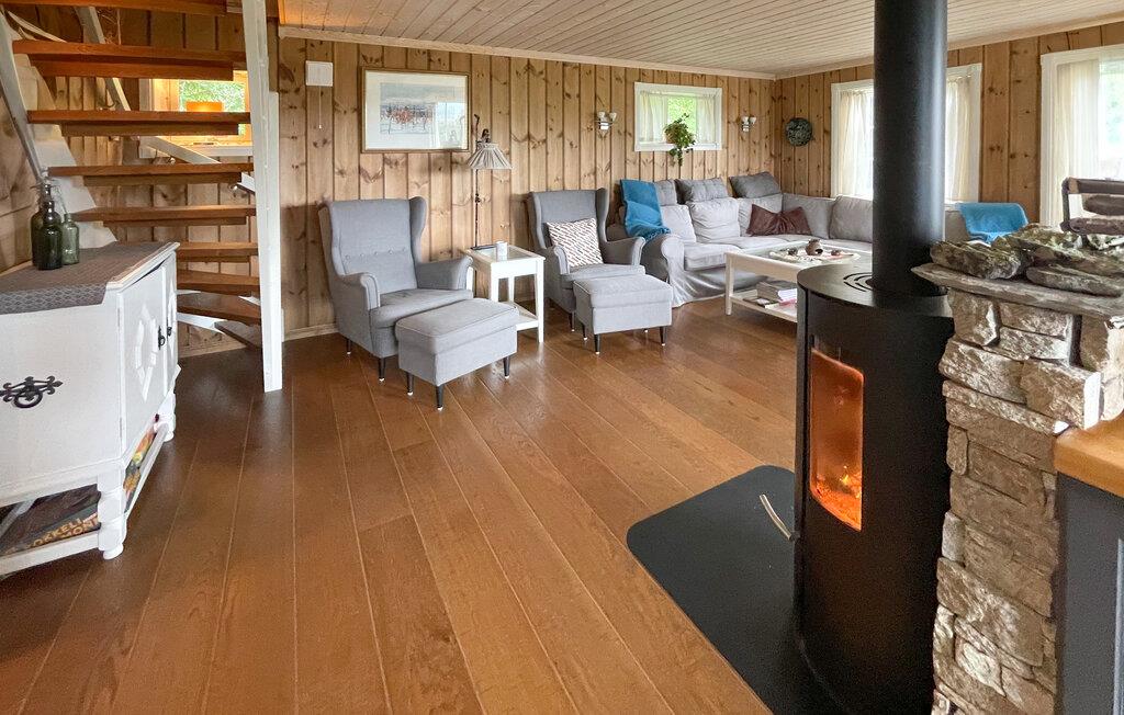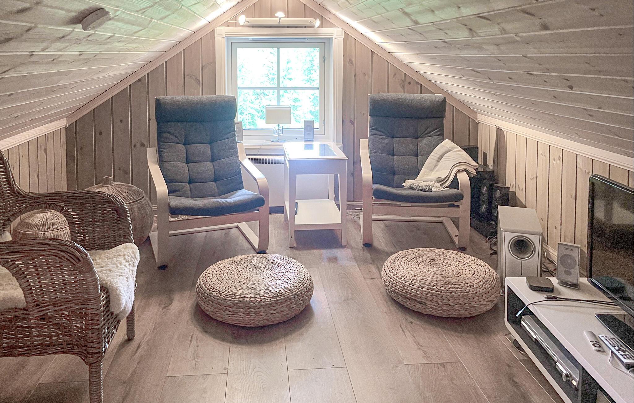 Med sin åpne planløsning inviterer dette komfortable feriehuset deg til å tilbringe sosiale dager sammen med dine nærmeste. Her kan du nyte den koselige atmosfæren mens du lytter til peisens milde knitring mens du slapper av og leser, tryller frem kulinariske høydepunkter sammen og nyter koselige spillkvelder i den store sofagruppen eller ved det innbydende spisebordet. Etter en lang dag i frisk luft kan du unne deg koselige stunder i badstuen.