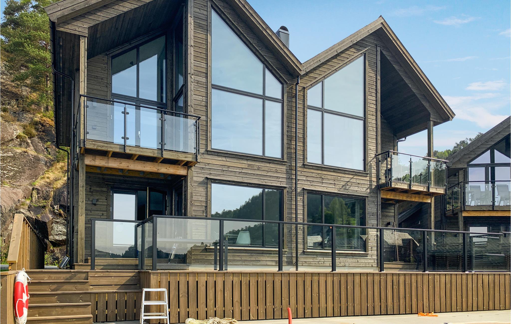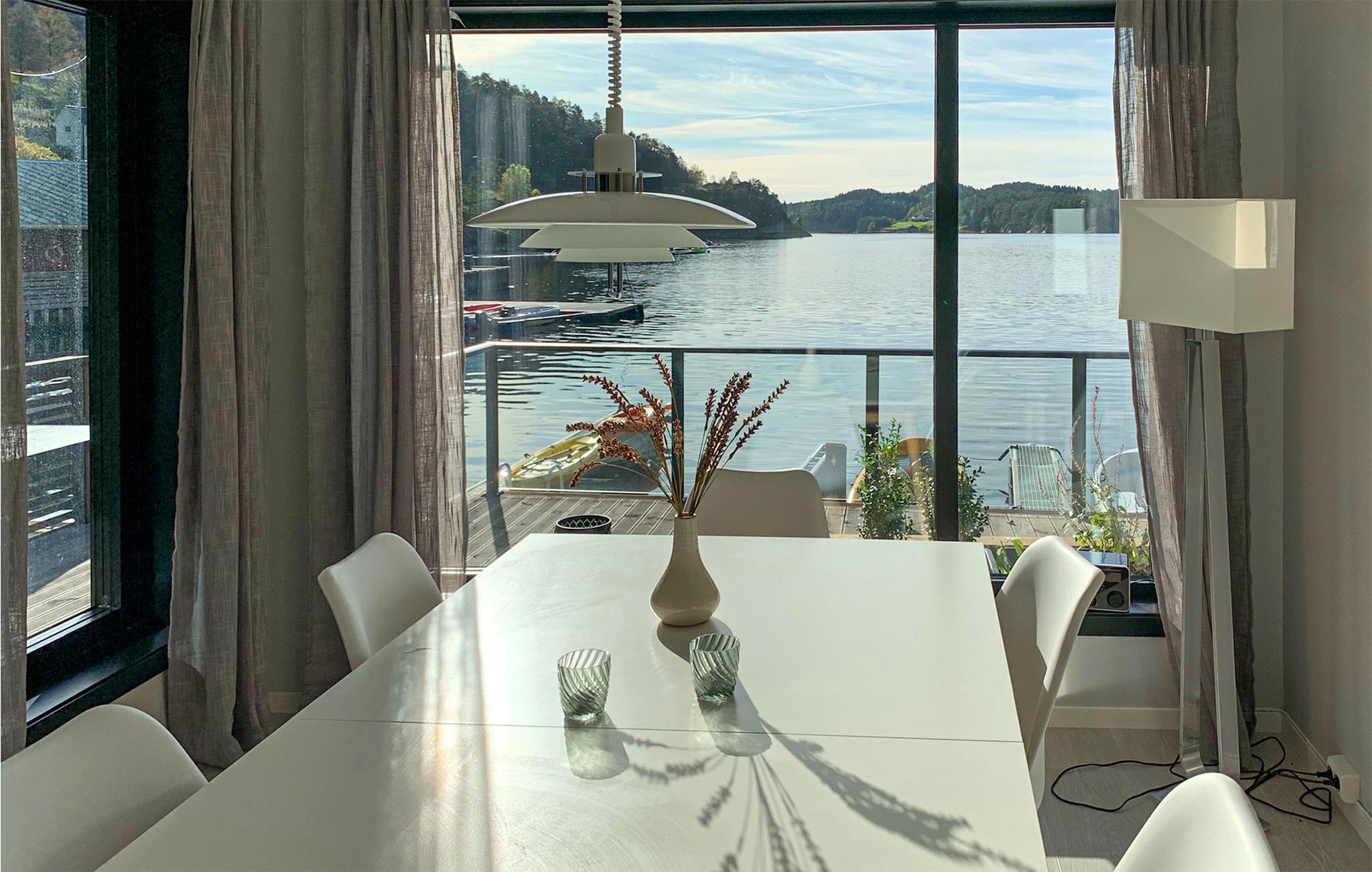 Dette moderne feriehuset ligger idyllisk til ved sjøen, med fantastisk utsikt over fjorden, og ønsker deg velkommen med en åpen terrasse med badebrygge.