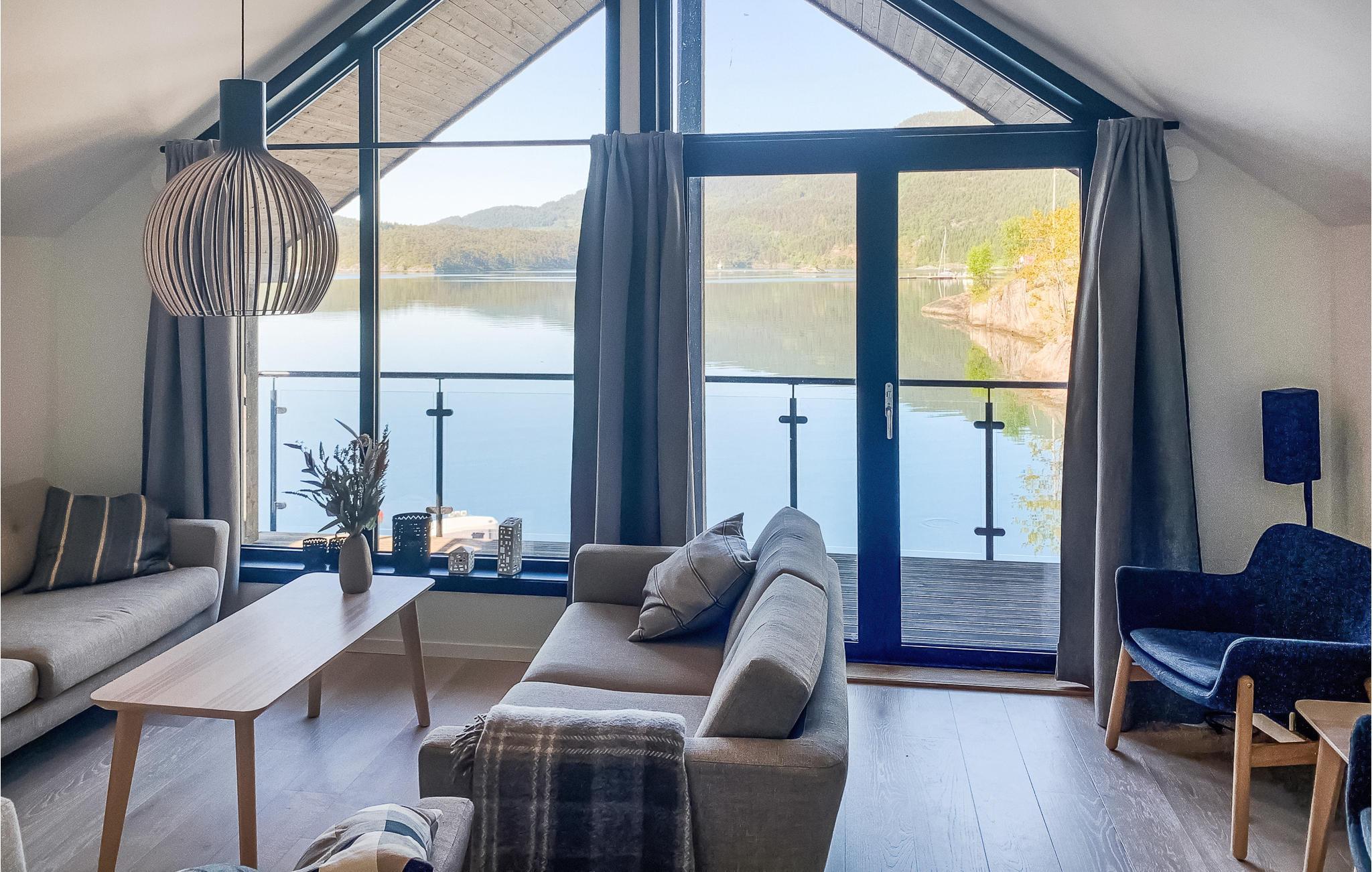 Dette moderne feriehuset ligger idyllisk til ved sjøen, med fantastisk utsikt over fjorden, og ønsker deg velkommen med en åpen terrasse med badebrygge.