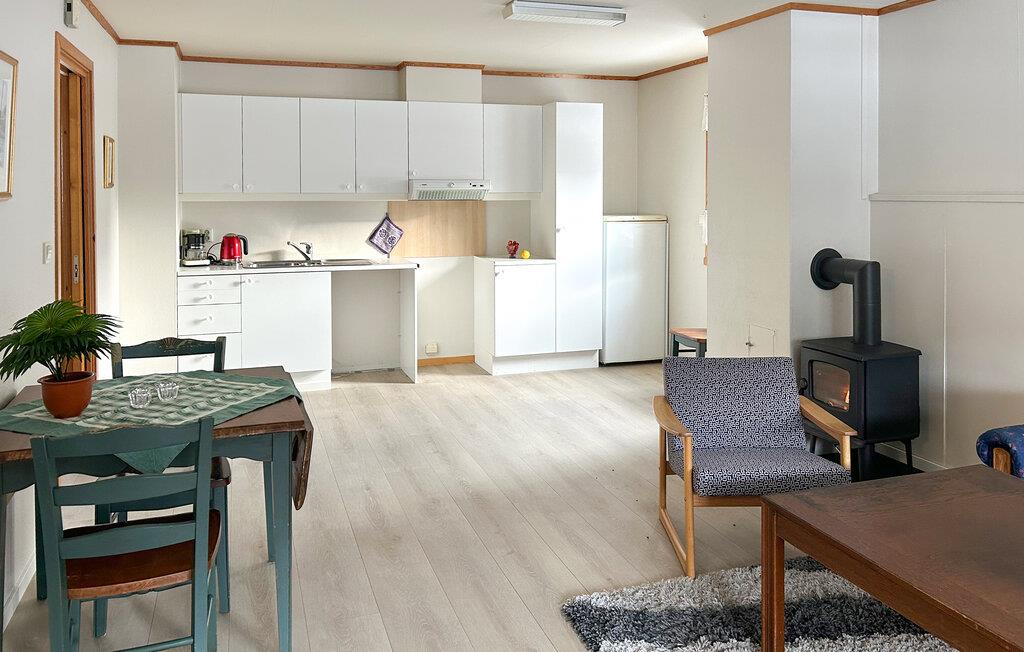 Leiligheten utstråler en koselig atmosfære, preget av mye treverk og den trivelige vedovnen. Nyt avslappende timer i stuen, lytt til favorittmusikken din eller la blikket vandre over landskapet. Organiser en liten kokkelering og spis middag i en koselig atmosfære.