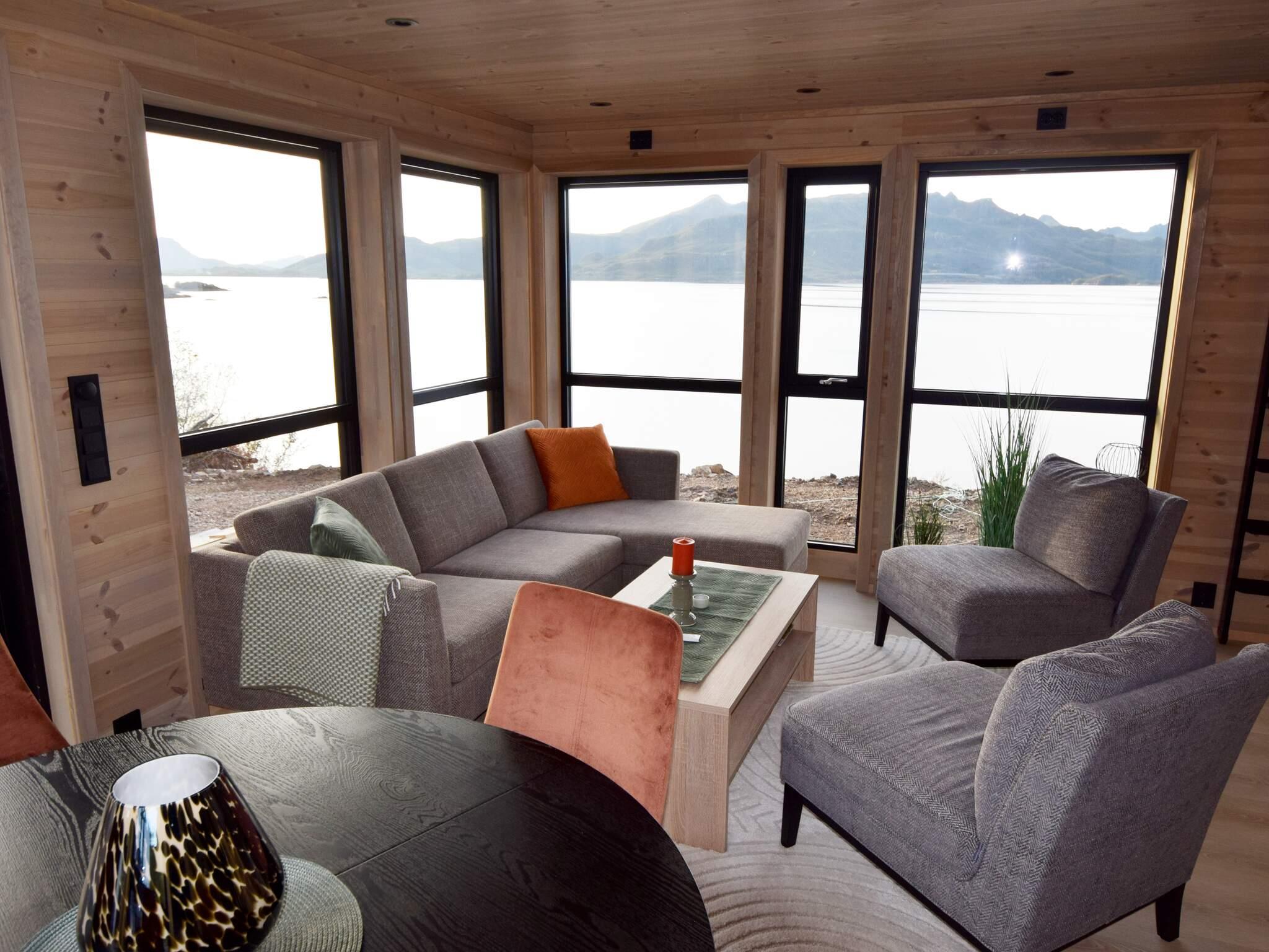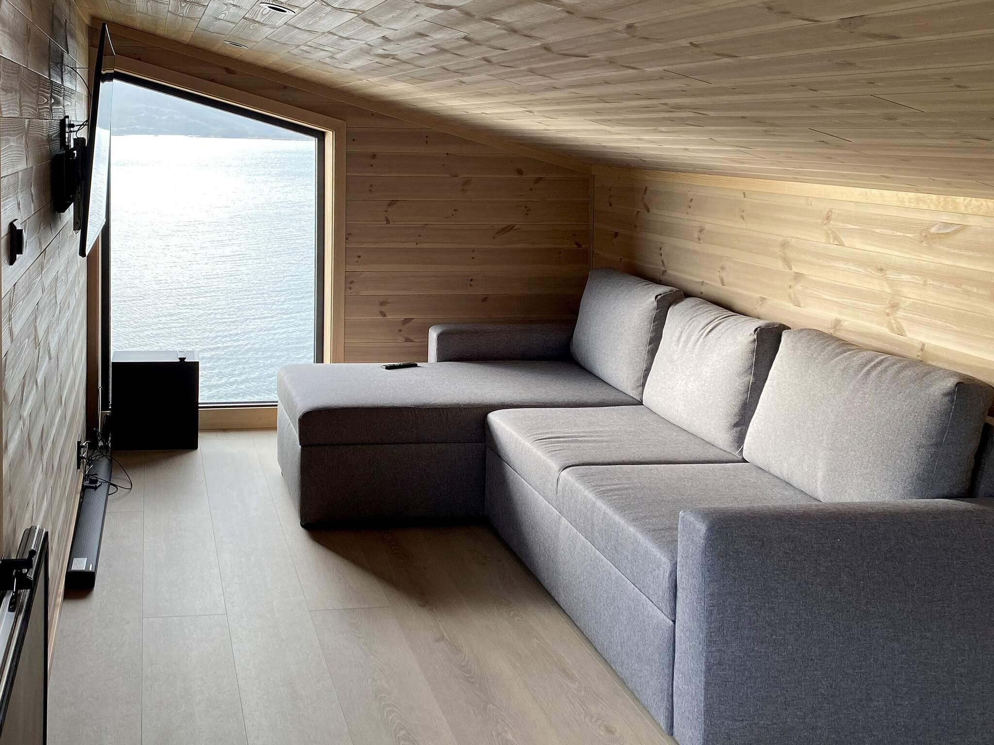 Hytta er smakfullt innredet med lyst treverk i vegger og tak. Stua og kjøkken har store vinduer vendt mot fjorden som gjør rommene lyse og trivelige. Over sofagruppen i stua er en mesanin med 2 stoler og bord. Herfra er det fantastisk utsikt mot fjorden, solnedgangen og midnattssola. 2 soverom, et med dobbeltseng og et med familiekøye med ekstra bred køyeseng nede og enkel oppe. Over soverommene er det hems med dobbel sovesofa og 2 madrasser. I stua er det TV med norske og internasjonale kanaler og en peisovn som gir behagelig varme også på kalde høst- og vinterdager. Gratis internett.