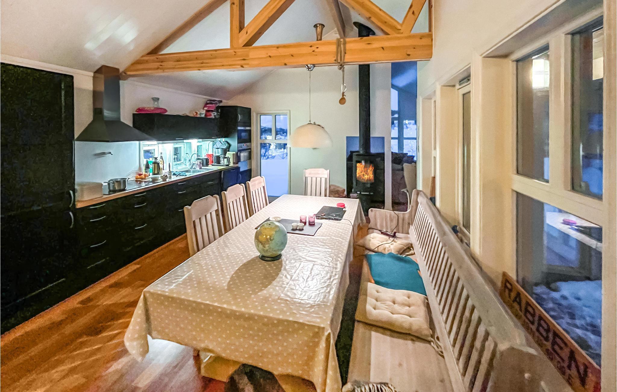 Dette er et perfekt sted å nyte lange, lyse sommerkvelder med midnattssol og kalde, vakre vinterdager med nordlys. Det vakre huset med rolig beliggenhet ved fjorden har alt du kan ønske deg. Den lyse stuen er familiens sentrale møteplass, hvor du kan gjøre deg komfortabel i sofaene og spille brettspill. Etter krevende fotturer eller dager i snøen kan du også slappe av i badstuen og legge alle hverdagens bekymringer bak deg.