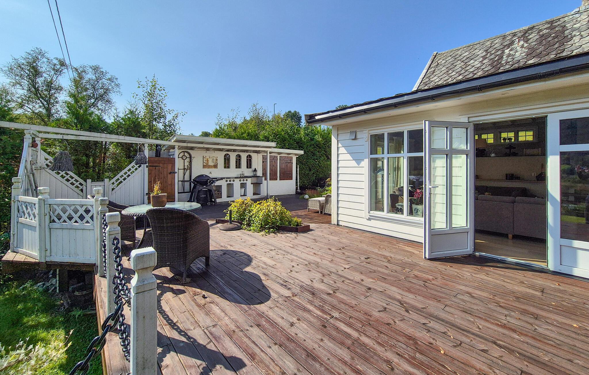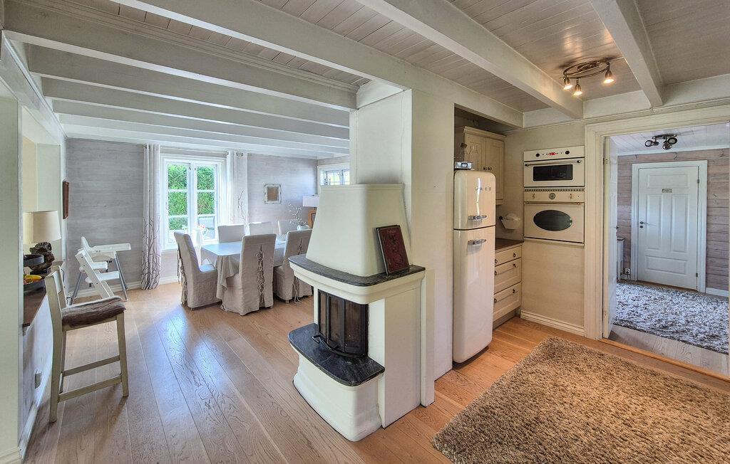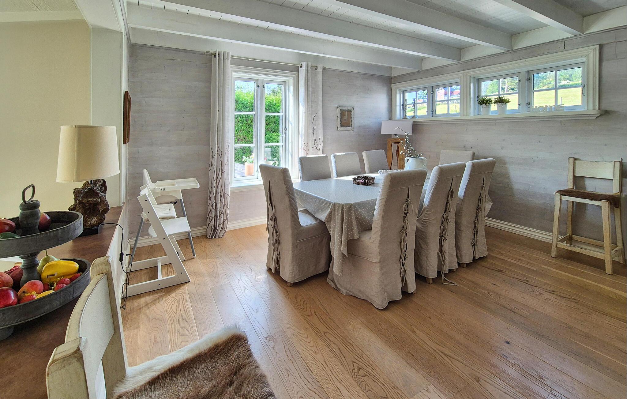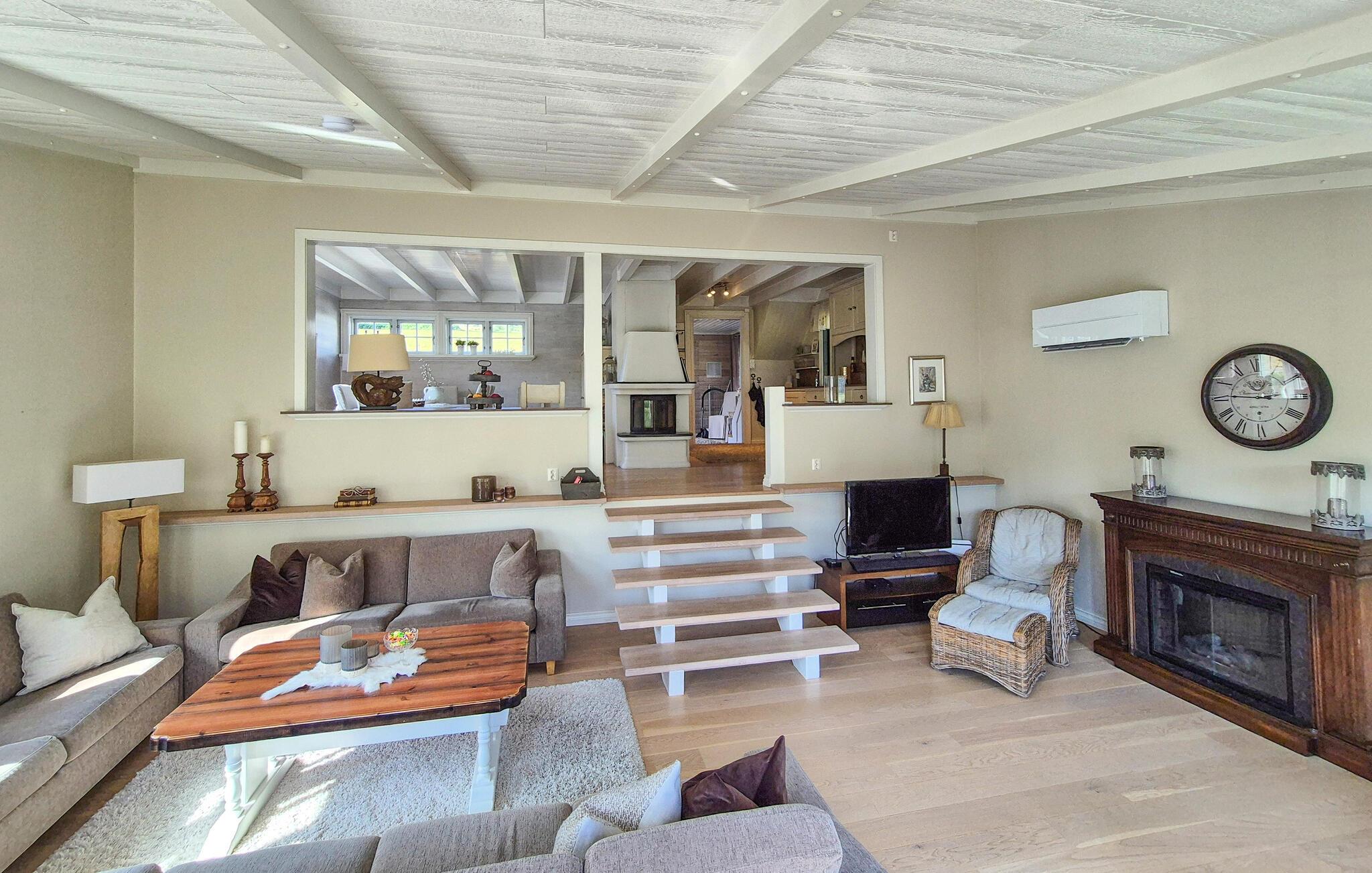 Dette barnevennlige huset tilbyr også god plass til større familier i sitt koselige og komfortable interiør. Smakfulle møbler og duse farger skaper en hyggelig atmosfære som du kan nyte under hyggelige matlagingskvelder, hyggelige måltider og avslappede lesestunder. Tenn opp i den norske vedovnen og samle dere til en god film eller en harmonisk spillkveld i den romslige sofagruppen.