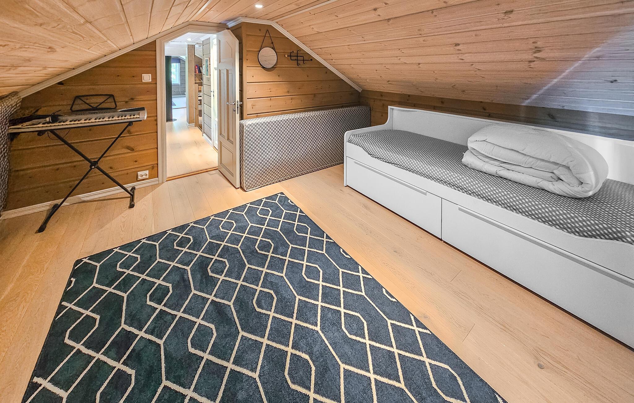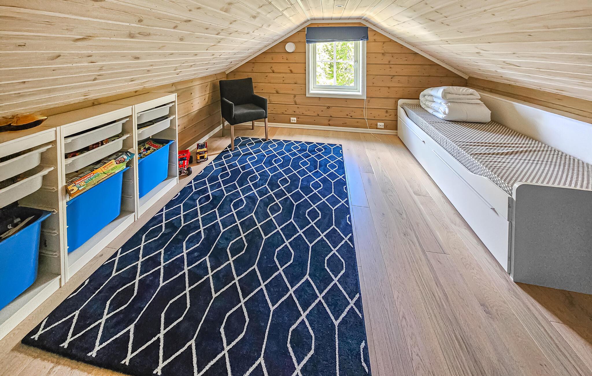 Dette romslige og komfortable feriehuset ønsker deg velkommen til en idyllisk beliggenhet ved innsjøen, og tilbyr rikelig med plass til å nyte de herlige ekstrafunksjonene med en større familie eller vennegjeng. Gled dere til hyggelige måltider med utsikt over det grønne, slå av en prat om gamle dager i den store sofagruppen, kos dere i badstuen mens andre fyrer opp i peisen for en koselig spillkveld, streamer en film eller fordyper seg i en bok i favoritthjørnet sitt.