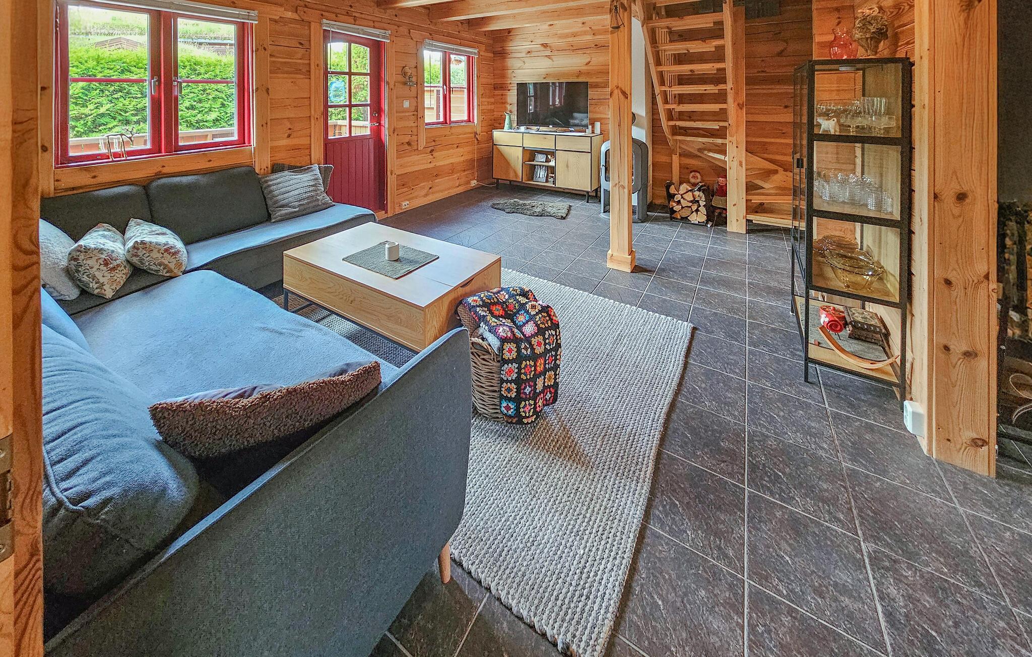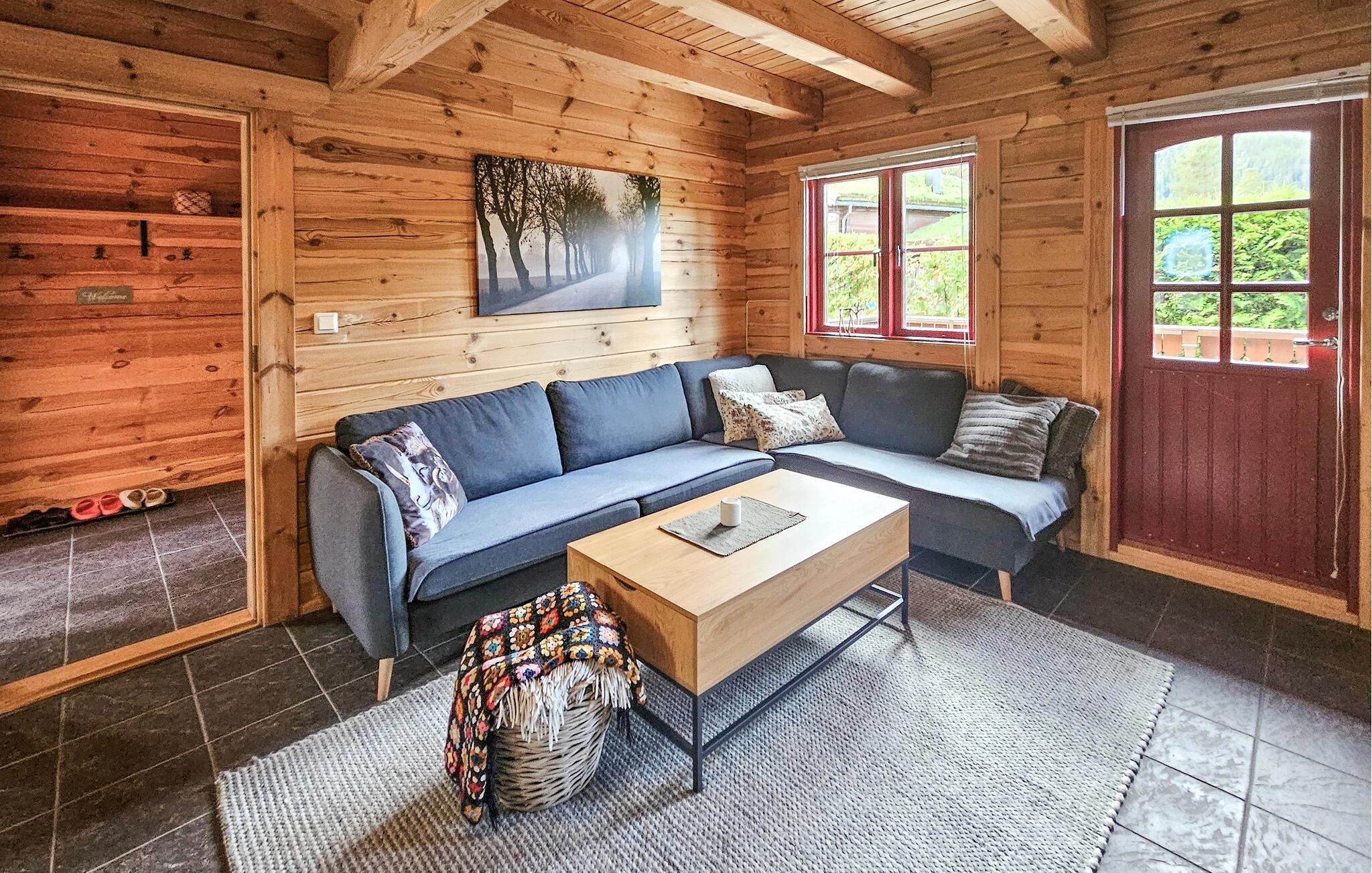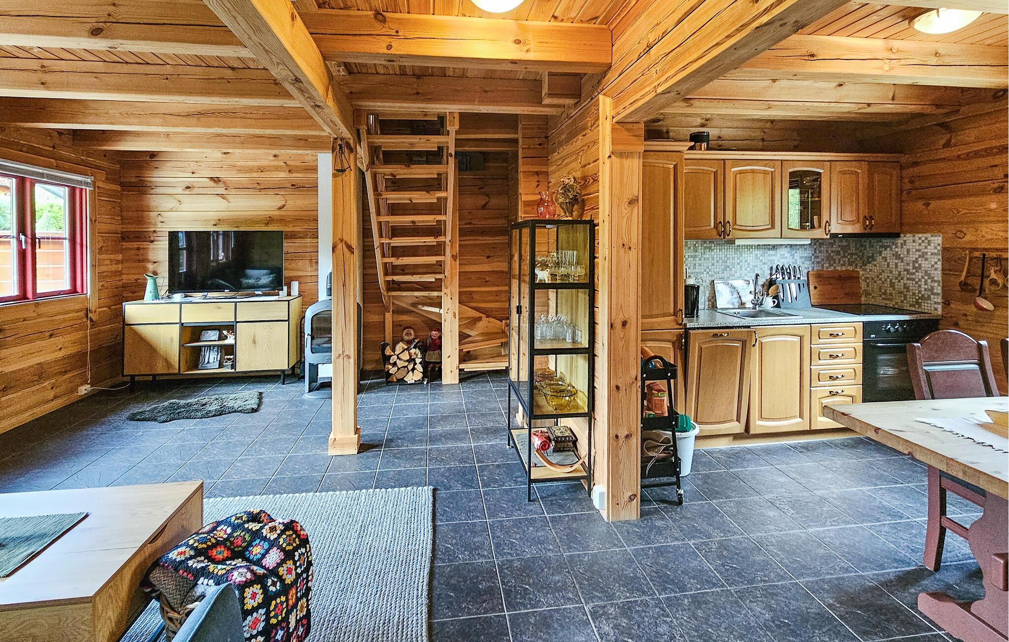 Den åpne stuen er utstyrt med en vedovn som gir koselig varme på kjølige dager. Len deg tilbake i den komfortable sofagruppen og nyt avslappende timer med familie eller venner. Bruk det velutstyrte kjøkkenet med spisebord til å tilberede måltider sammen, og nyt den rustikke atmosfæren med varmt treinteriør som utstråler hygge.