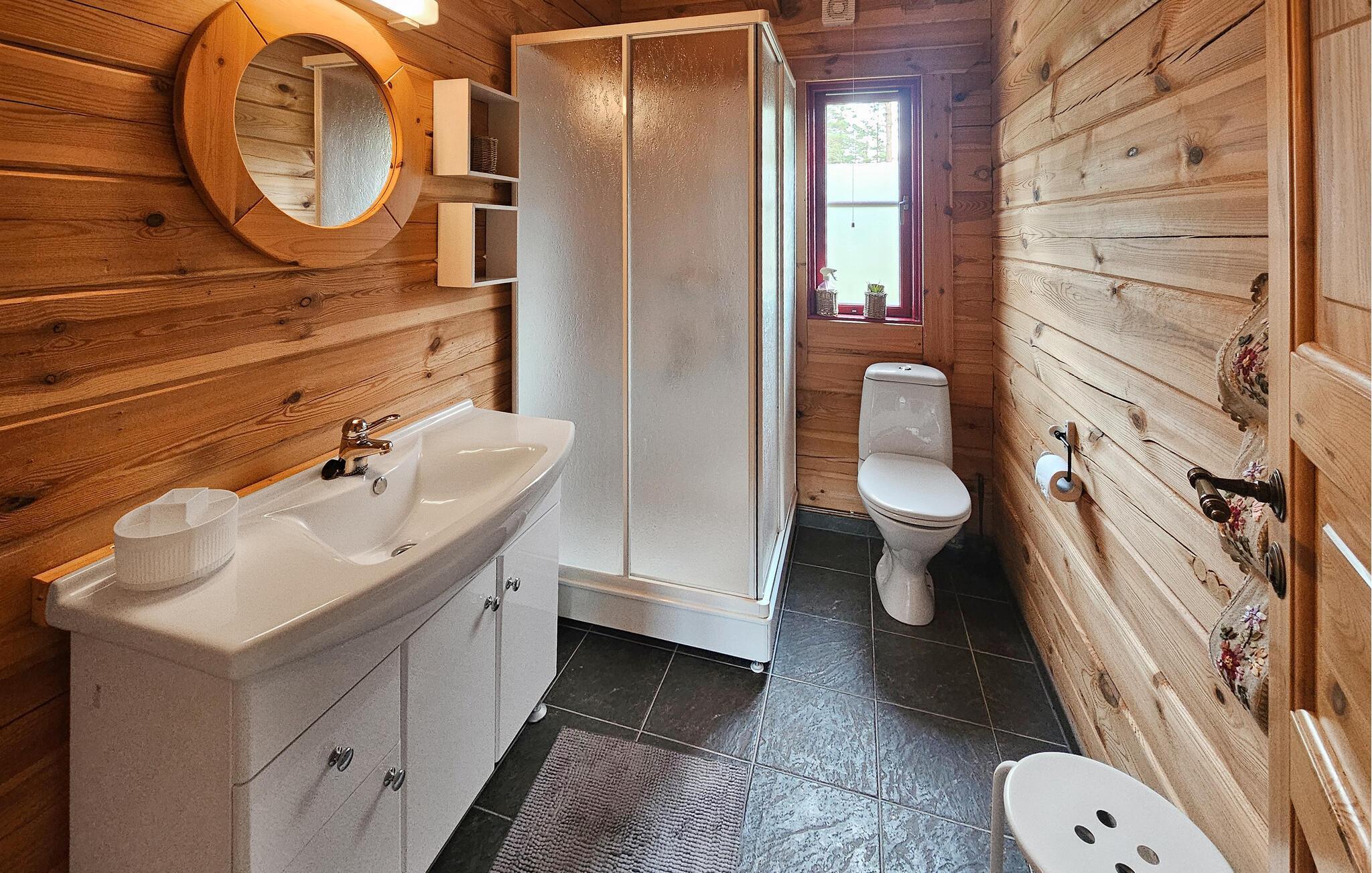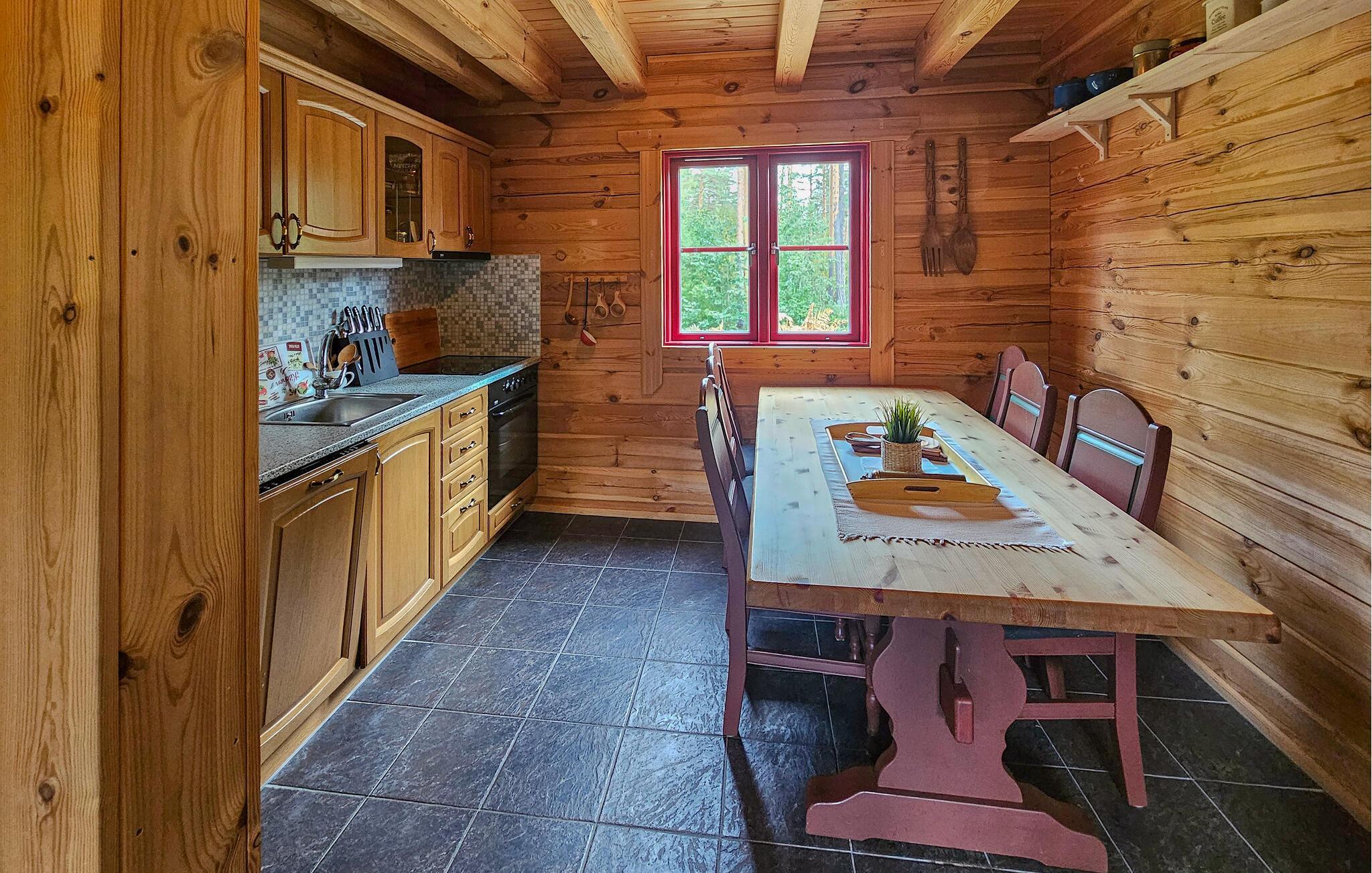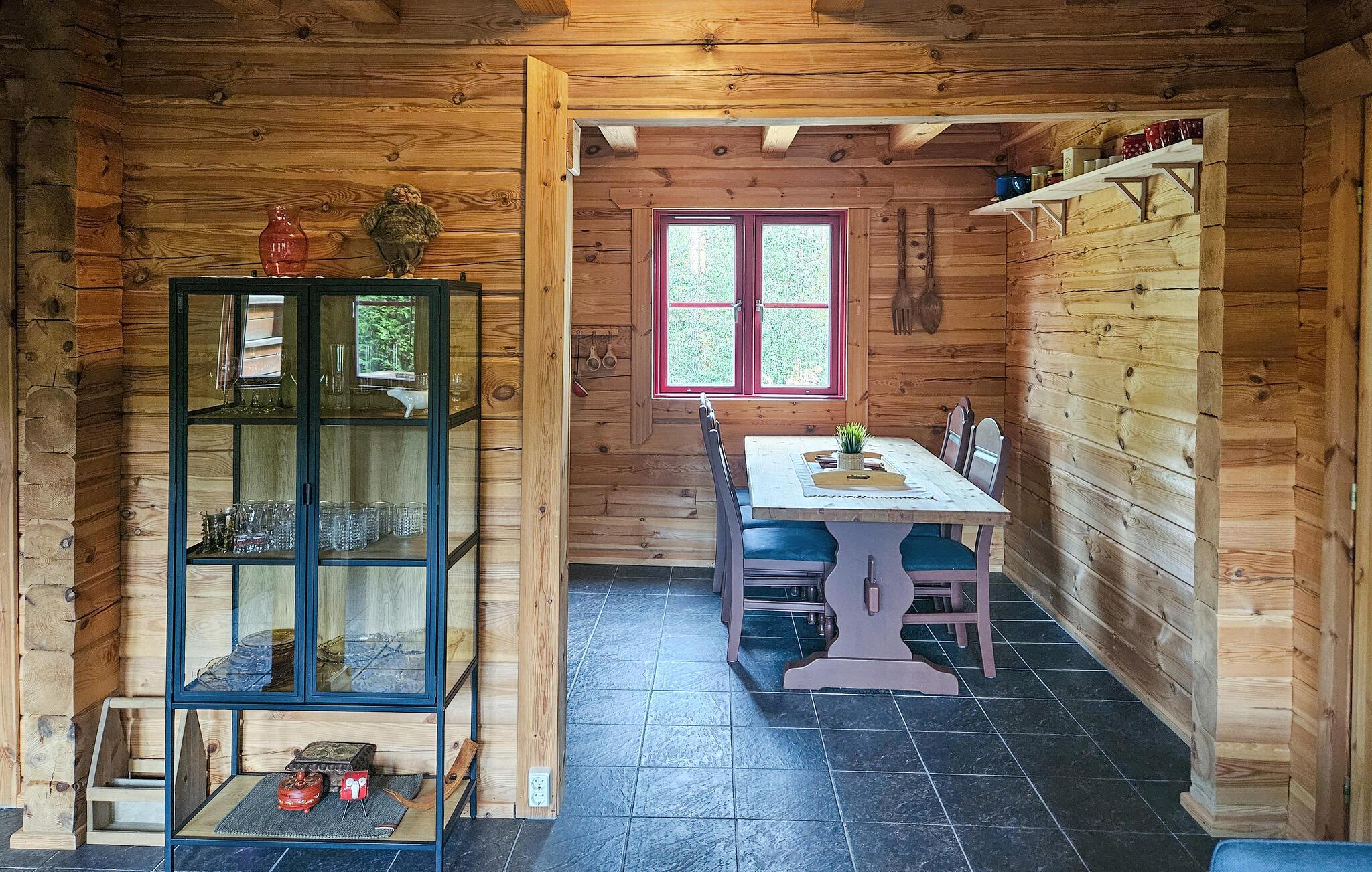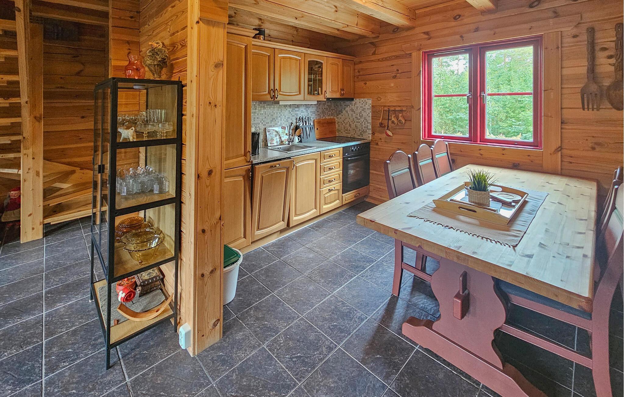 Den åpne stuen er utstyrt med en vedovn som gir koselig varme på kjølige dager. Len deg tilbake i den komfortable sofagruppen og nyt avslappende timer med familie eller venner. Bruk det velutstyrte kjøkkenet med spisebord til å tilberede måltider sammen, og nyt den rustikke atmosfæren med varmt treinteriør som utstråler hygge.
