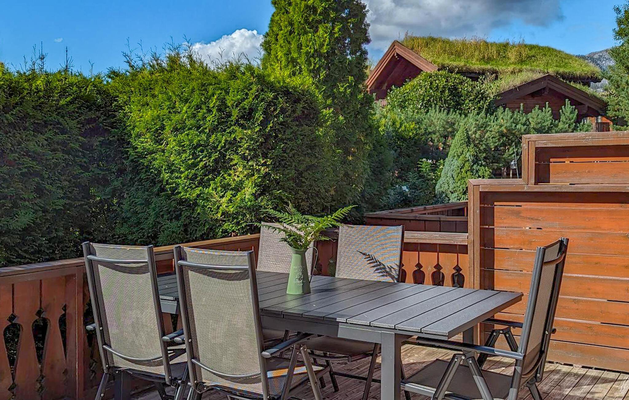 Gå ut på terrassen og slå deg ned på uteserveringen. Nyt den skjermede beliggenheten mellom grønne hekker og omgitt av et tradisjonelt hyttelandskap. La blikket vandre over den omkringliggende naturen, og bruk terrassen til solfylte timer eller koselige kvelder.