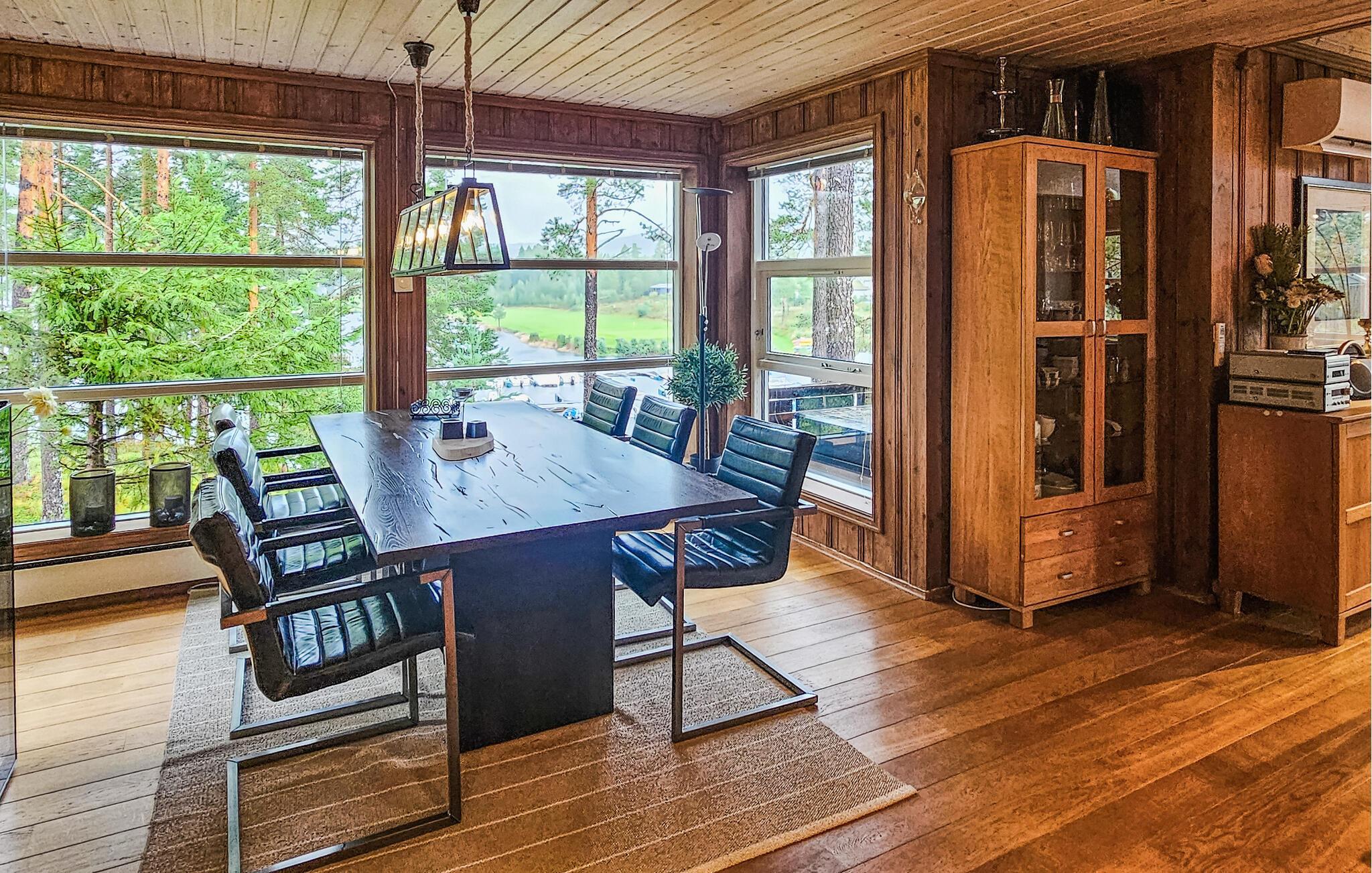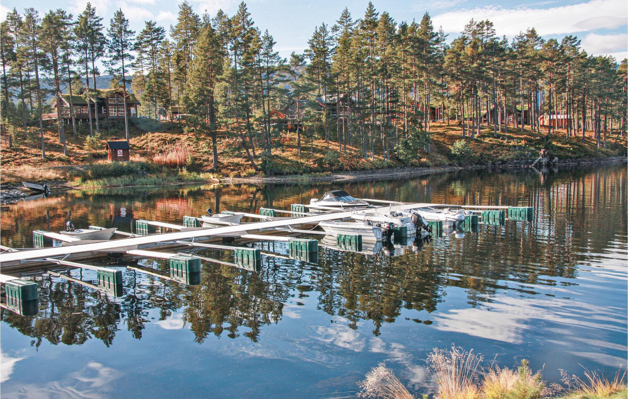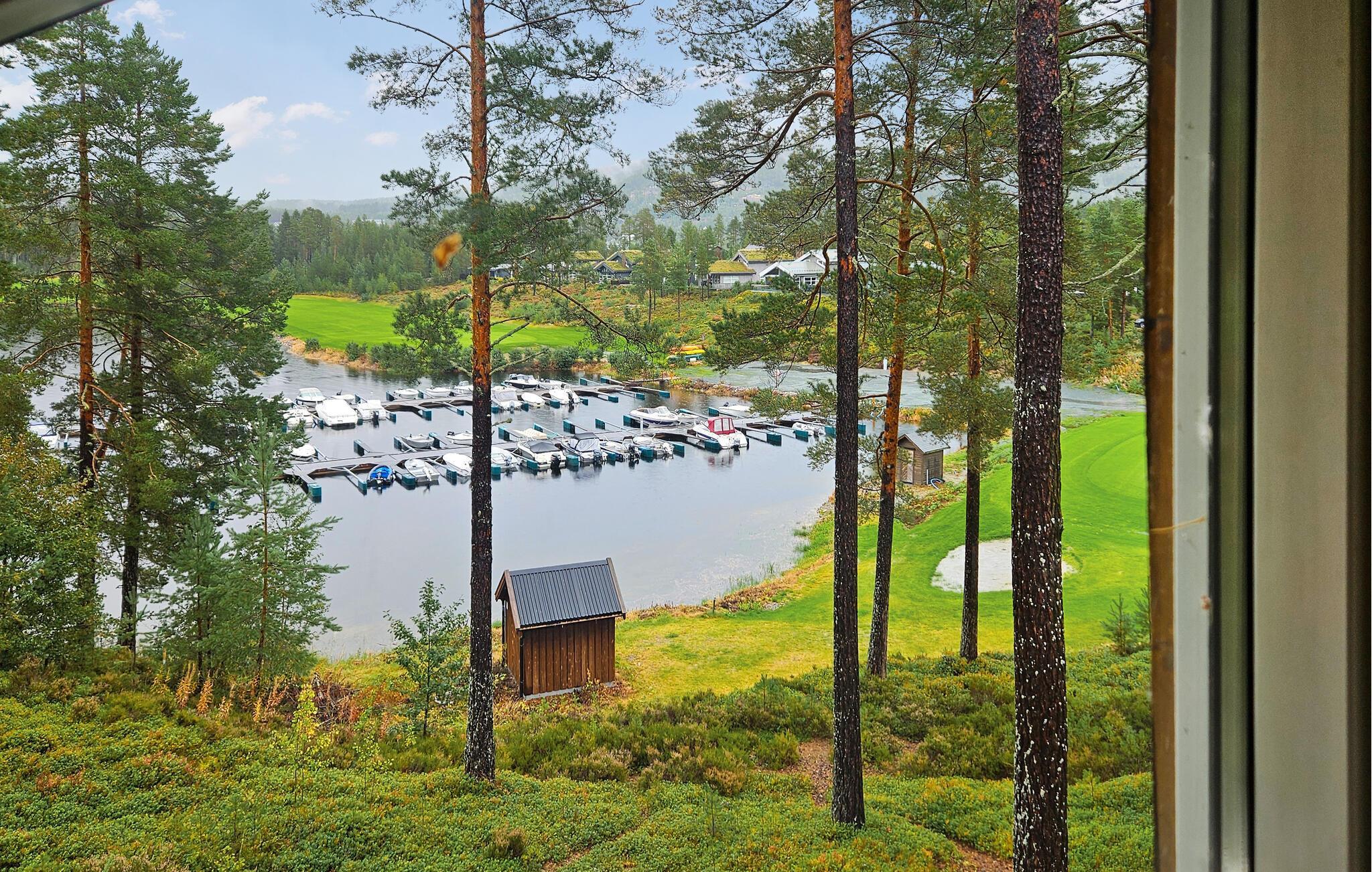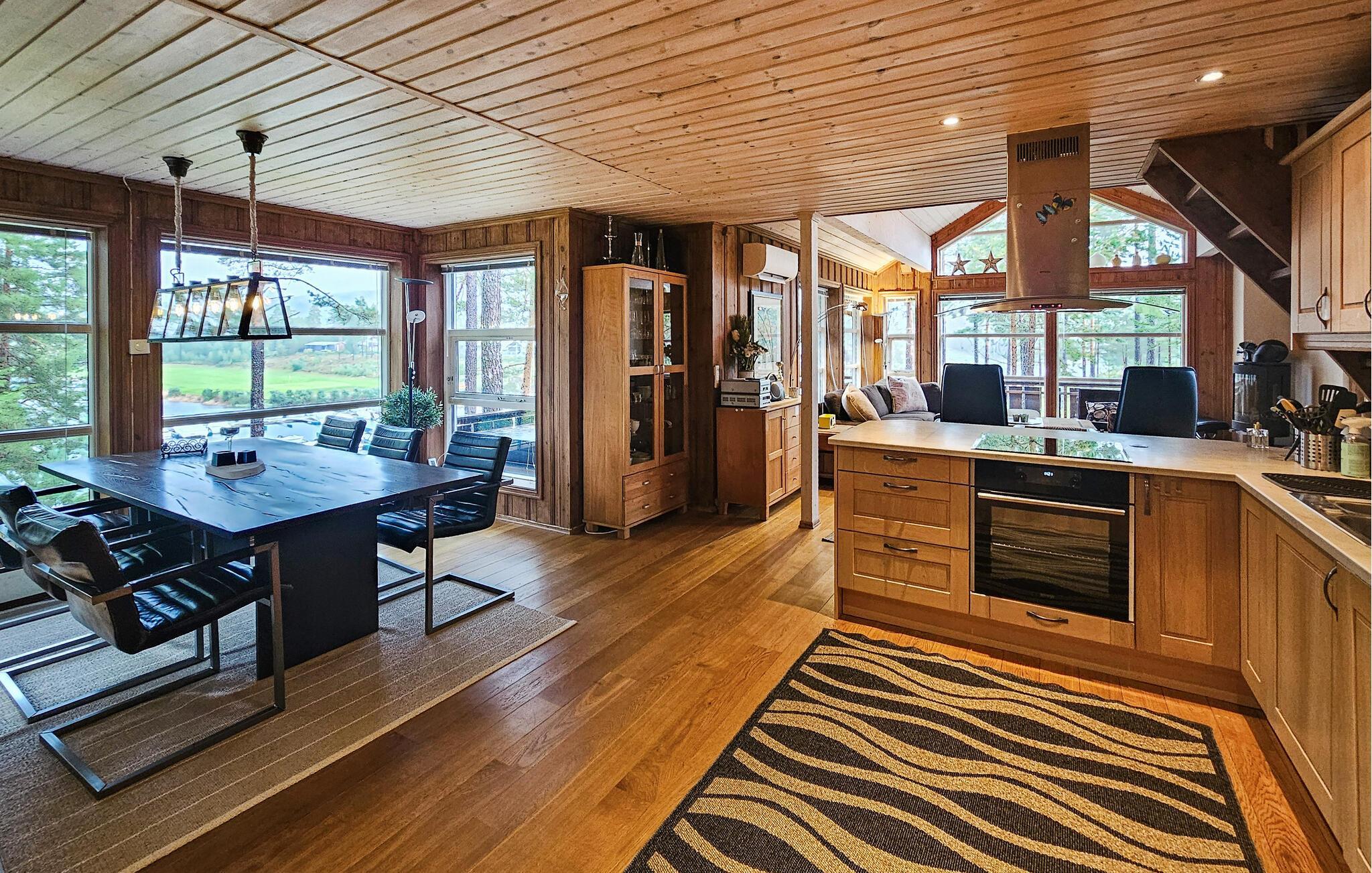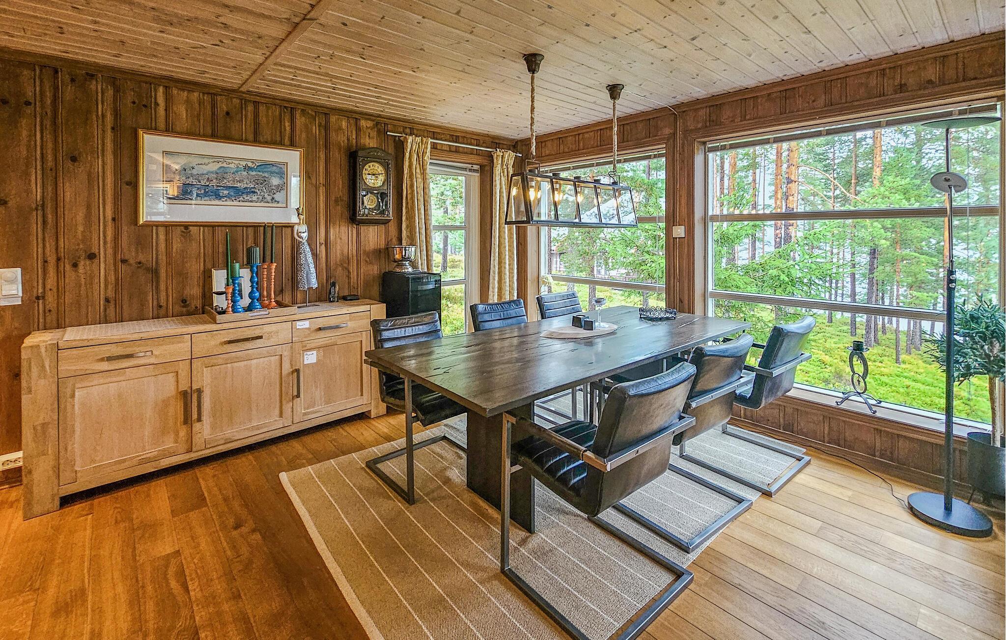 Hytta er smakfullt innredet, med vakre farger og store vinduer som slipper inn mye lys. Ved spisebordet kan du nyte den vakre utsikten over omgivelsene samt deilige måltider og legge en plan for de neste dagene. I første etasje er det en stue hvor du kan se på TV samt se ut over Nisser og båthavnen.