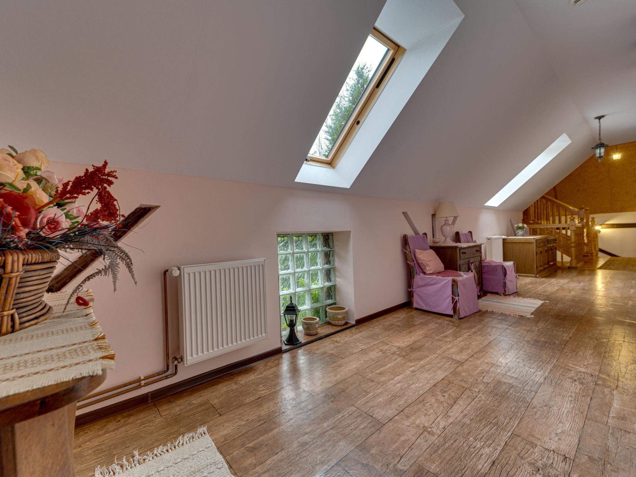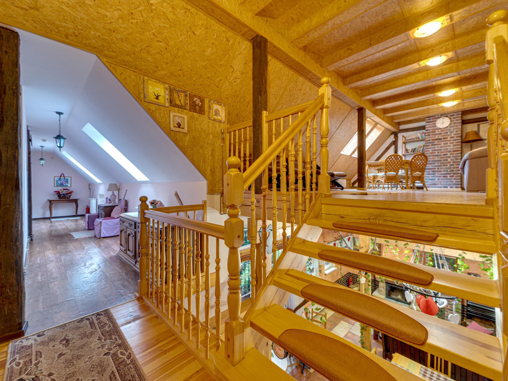 9-room house 380 m2 on 2 levels. Partly with sloping ceilings, comfortable and cosy furnishings: large entrance hall 25 m2. Open lounge 50 m2 with panoramic window with open-hearth fireplace. Open playroom 25 m2 with bar. 1 large room 40 m2 with 1 double bed and shower/WC. Exit to the garden, to the terrace. Open kitchen 35 m2 (8 hot plates, oven, dishwasher, microwave, electric coffee machine, steamer). 2 sep. WC's. Upper floor: open gallery 40 m2, with sloping ceilings with library, flat screen and radio. 2 rooms 18 m2, with sloping ceilings, each room with 2 beds (90 cm, length 200 cm), shower/WC. 1 room 18 m2, with sloping ceilings with 2 beds and bath/bidet/WC. 1 room 18 m2 with 2 beds (90 cm, length 200 cm), shower/bidet/WC and TV. Beautiful view of the garden and the countryside. Facilities: safe, mosquito net, baby cot for up to 3 year olds. Internet (WiFi). Parking at the house. Please note: suitable for families. Non-smoking house. Maximum 2 pets/ dogs allowed. Smoke alarm. Separate entrance to the bedroom on the ground floor, wheelchair-user-friendly. TV for independent Polish and German programs in individual rooms. Instead of an enclosed bedroom, some sleeping areas are located in an open-plan area (gallery, alcove, etc.). PL6821.100.1