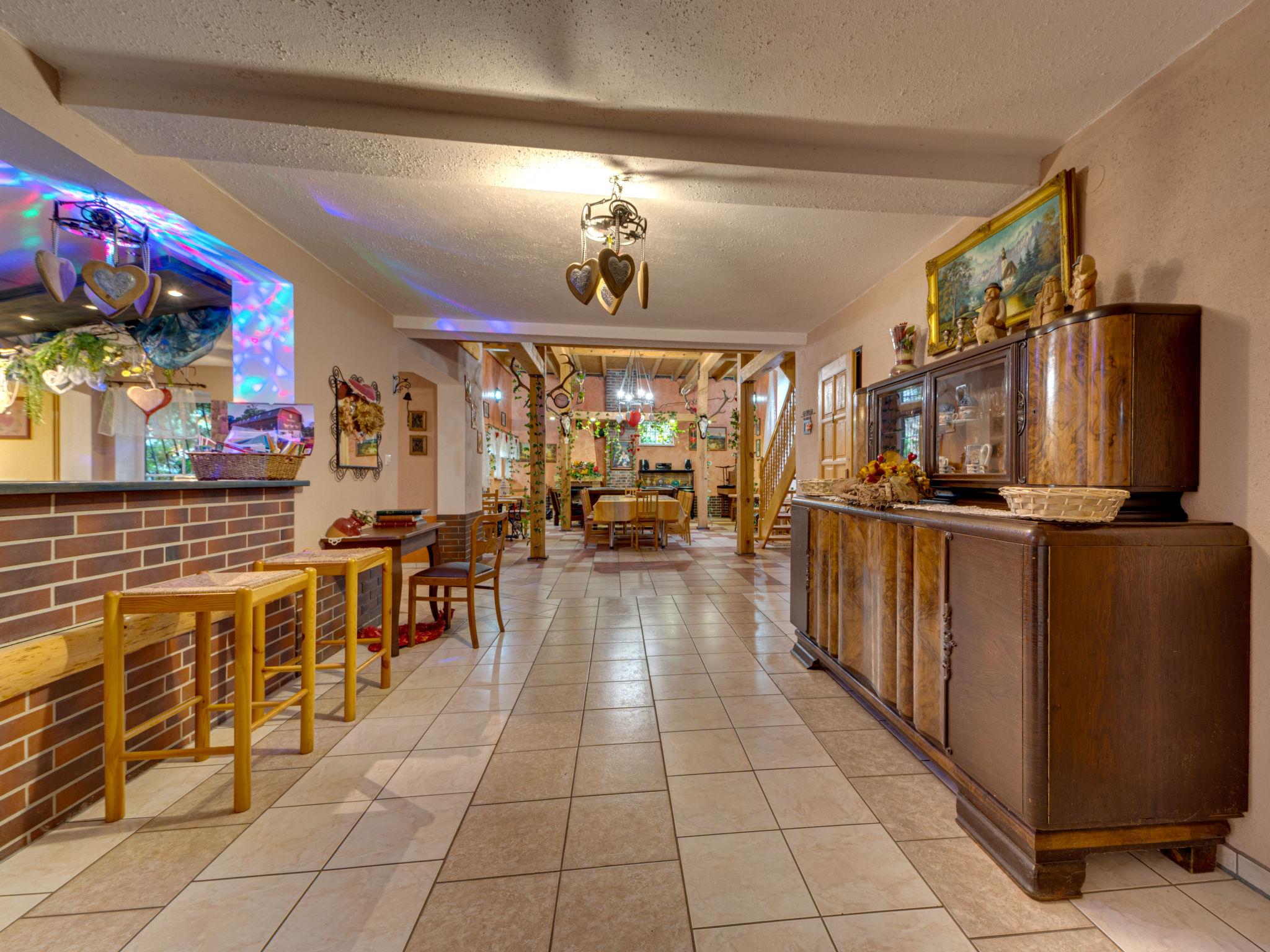Beautiful, rustic single-family house "Gosciniec Pod Dwoma Sercami", built in 1930, renovated in 2006, surrounded by trees and meadows. On the outskirts, in a quiet, sunny position, 5 km from the lake, in the countryside, in the woods. For shared use: property 1 ha (fenced), well-kept garden plants and trees, meadow 4'000 m2 (fenced), pond, swimming pool (above ground) round (5 m diameter, seasonal availability: 01.Jun. - 15.Sep.). Patio (28 m2), garden furniture, barbecue (swing). In the house: WiFi, table football, central heating system. Breakfast full board half board possible on request (extra). Parking (for 5 cars) on the premises. Shop 5 km, supermarket 5 km, bus stop 1 km, railway station 5 km, sandy beach 5 km, outdoor swimming pool 1.5 km, bathing lake 5 km. Riding stable 1.5 km. Please note: fishing [permit required]. The owner lives on the same property. Pool for bathing in the forest, approx. 1.5 km away (surface area 3 ha). A beautiful terrace pier over the pond. Riding, 1.5 km away. Fishpond (trout, tench, carp) - extra, 3 km. Complex with 20 ponds for fish-breeding (no fishing), 500 m. On request, after prior arrangement, catering: breakfast, lunch, dinner or any meal of your choice - prices, depending on the menu, are set by the meal supplier. Catering should be paid immediately after receiving the meals. Note: Youth groups are accepted only after obtaining the consent of the owner, in this case the deposit is increased to 1000 PLN.