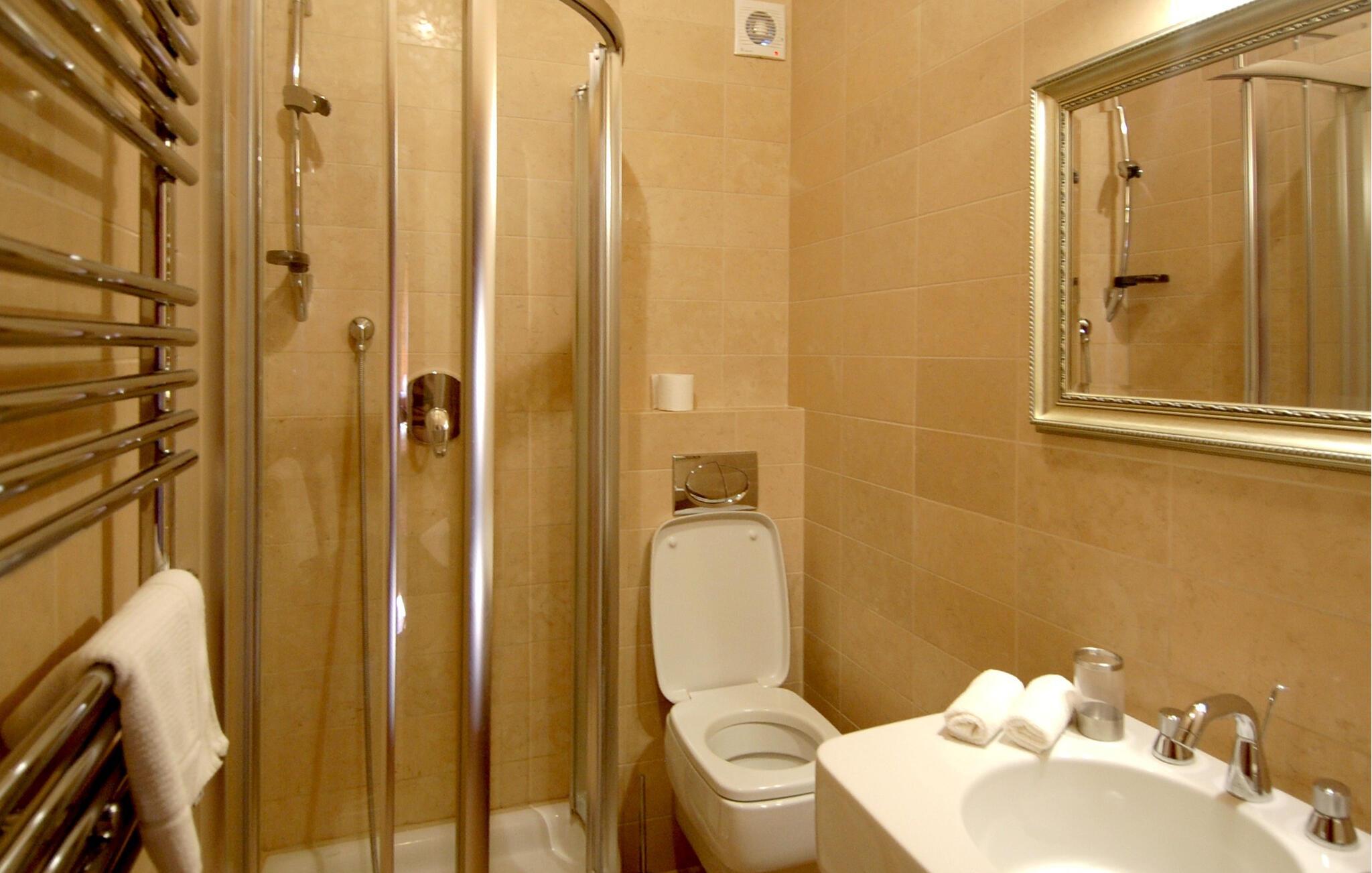 - WC med varmt og kaldt vann, Dusj