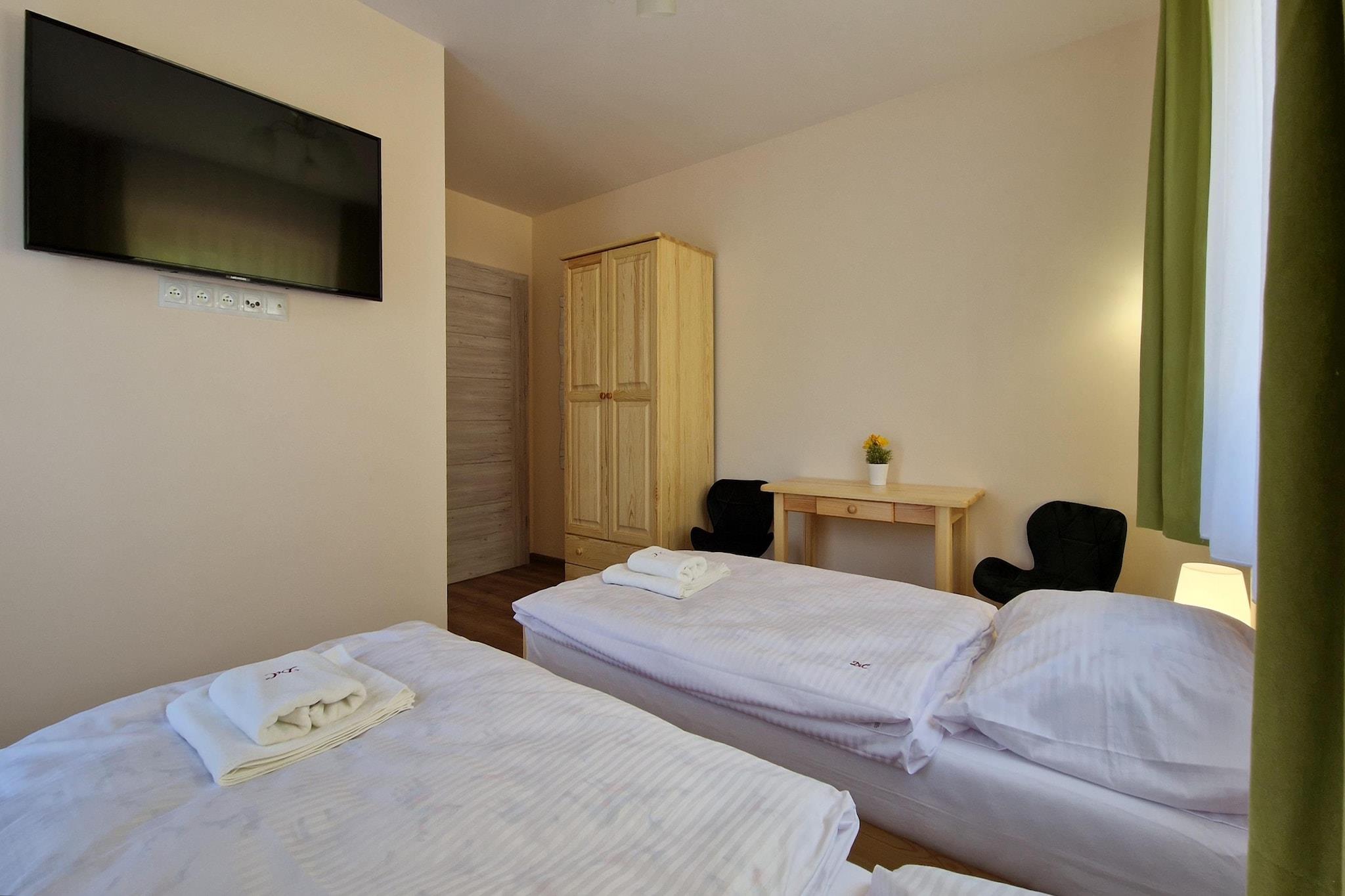 Et komfortabelt, nytt feriehus med svømmebasseng, beliggende på et pittoresk sted omgitt av fjell og skog, vekk fra sivilisasjon og bystøy. Huset ligger i Wisniowa - en landsby 30 km fra byen Rzeszów og 35 km fra flyplassen Rzeszów-Jasionka. Anlegget har et areal på 150 m2 og passer for 8 personer. Rundt det er det et rekreasjonsområde med et grill lysthus og et svømmebasseng. Rett ved siden av er det to små dammer hvor du kan fiske. Det er mange interessante turmuligheter rundt. Det er fire dobbeltrom, hver med to enkeltsenger som kan settes sammen til en dobbeltseng. I tillegg har hvert rom et separat bad med dusj. Anlegget er toetasjes. I første etasje er det to soverom og en åpen, avslappende "lesekrok". I første etasje er det en romslig vestibyle, to soverom, et lite separat toalett, et lite vaskerom og en stue med kjøkken. Ett av rommene med bad er fullt tilrettelagt for funksjonshemmede. Badet er utstyrt med alle nødvendige håndtak for funksjonshemmede. Første etasje er også tilrettelagt for funksjonshemmede i rullestol. Begge rommene i underetasjen har separate terrassedører med direkte tilgang til utsiden. Kjøkkenet og den åpne stuen er et felles sted for alle gjester. Det fullt utstyrte kjøkkenet inkluderer alle nødvendige husholdningsapparater, det vil si induksjonskomfyr, mikrobølgeovn, stekeovn, kjøleskap med fryser, oppvaskmaskin, vaskemaskin, brødrister, drypp kaffetrakter og vannkoker. Det er en hage rundt feriehuset med et stort grilllysthus, utstyrt med vask og en liten drikkekjøler. Foran huset er det et privat svømmebasseng, 8x4 m, 1,5 m dyp. Om vinteren kan du svømme i bassenget. Solsenger er også tilgjengelig. Det er også salongmøbler på terrassen. Området er fullt inngjerdet. Gjestene har 6 parkeringsplasser til disposisjon, hvorav en er bredere - for funksjonshemmede. Ved siden av inngangsporten er det også plass til containere for avfallssortering. Gratis Wi-Fi er tilgjengelig på hele anlegget. Kjæledyr er tillatt. Røyking er forbudt.