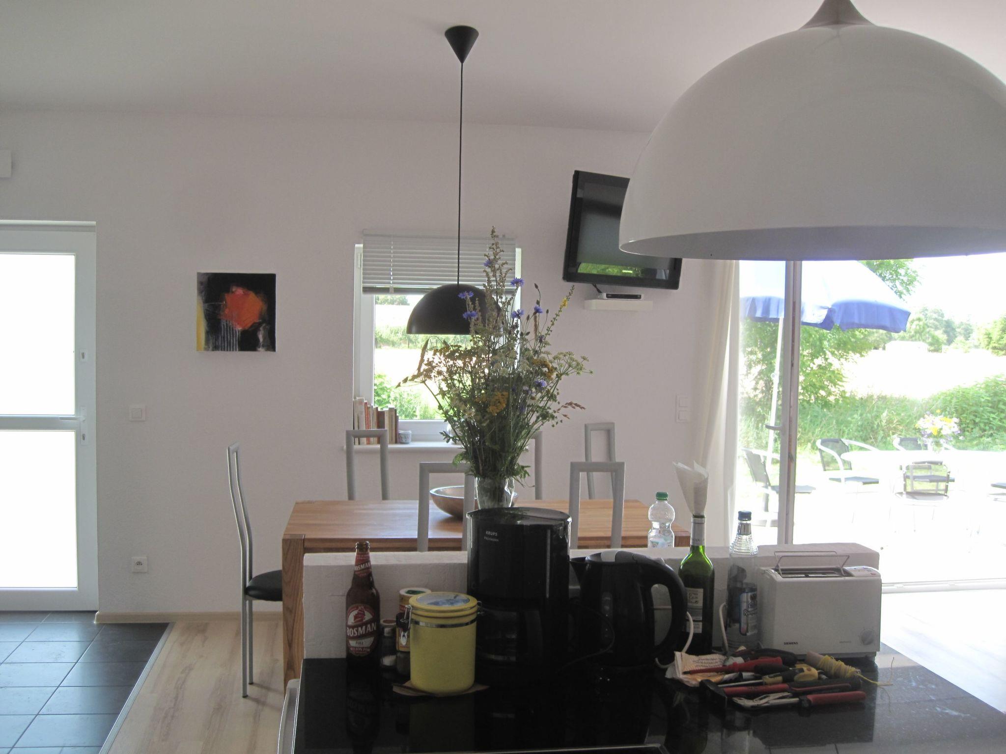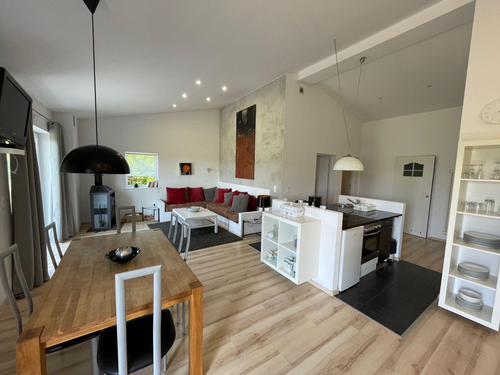 The modern, open-plan rooms are decorated with paintings by Berlin artist P. Lorenz and convey cosiness, warmth and a Mediterranean feeling. The large living area with kitchen block and dining table opens out onto the terrace and the green surroundings, making you feel like you're in an oasis.