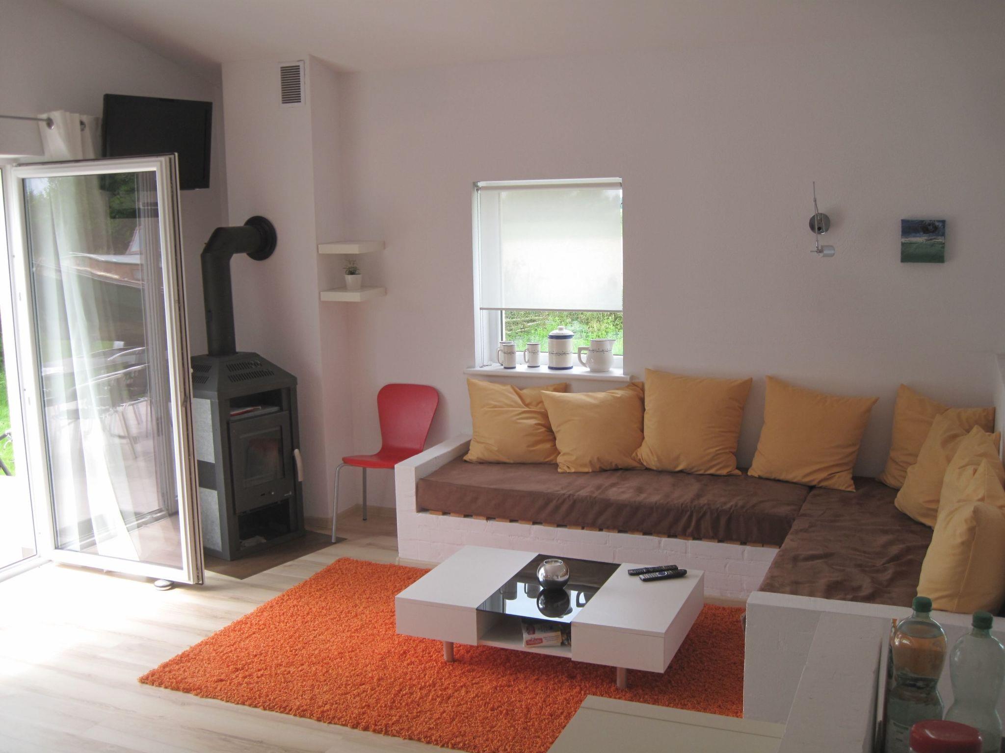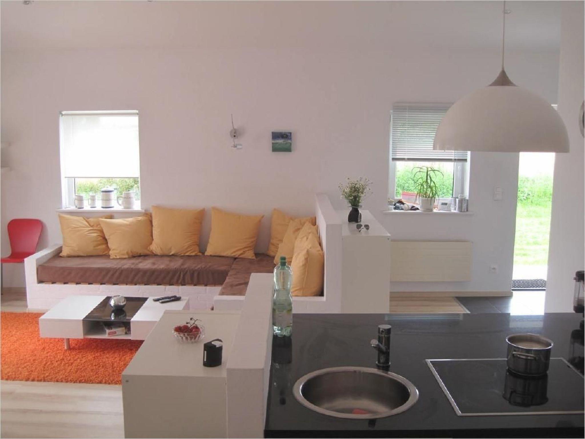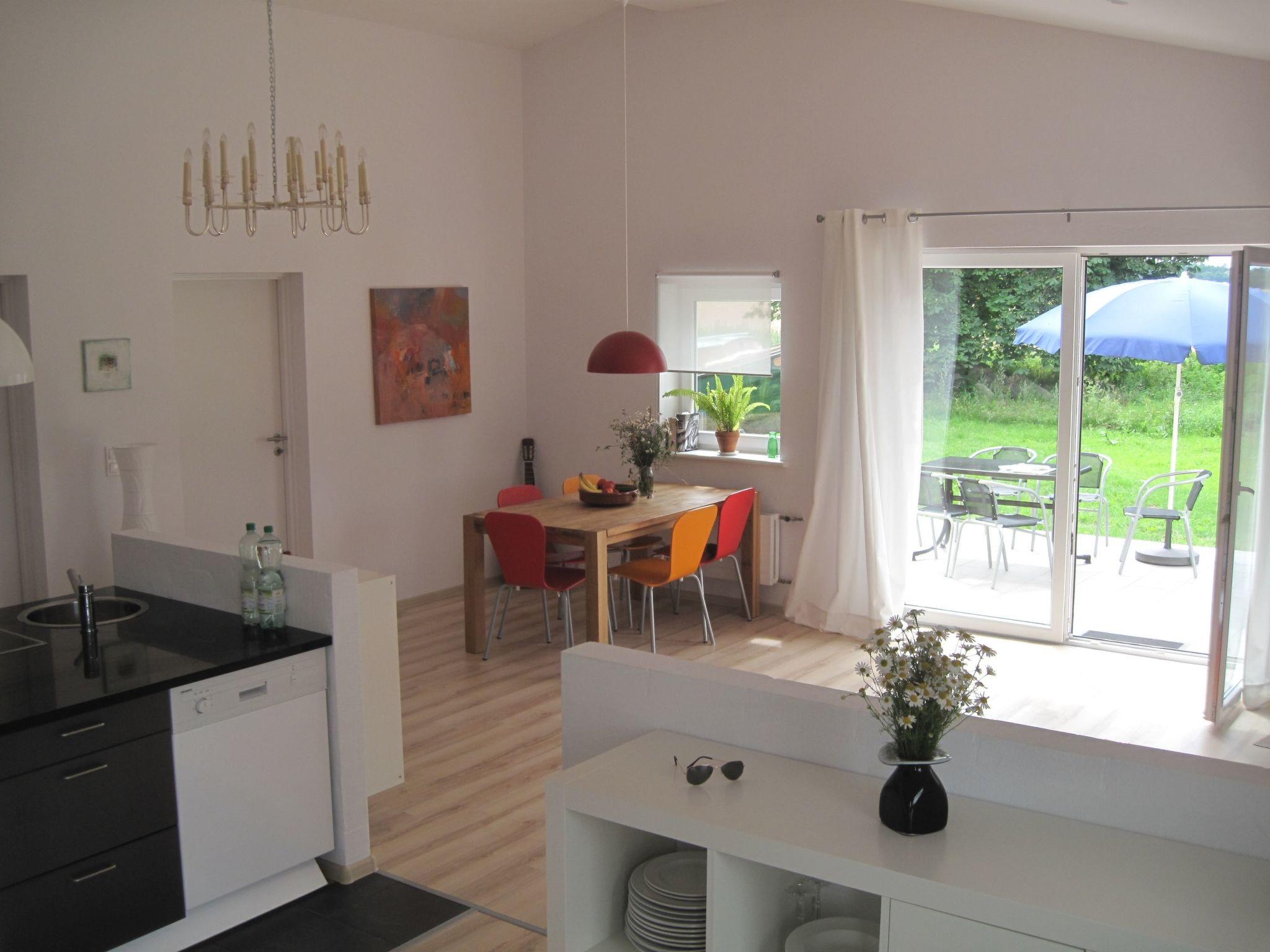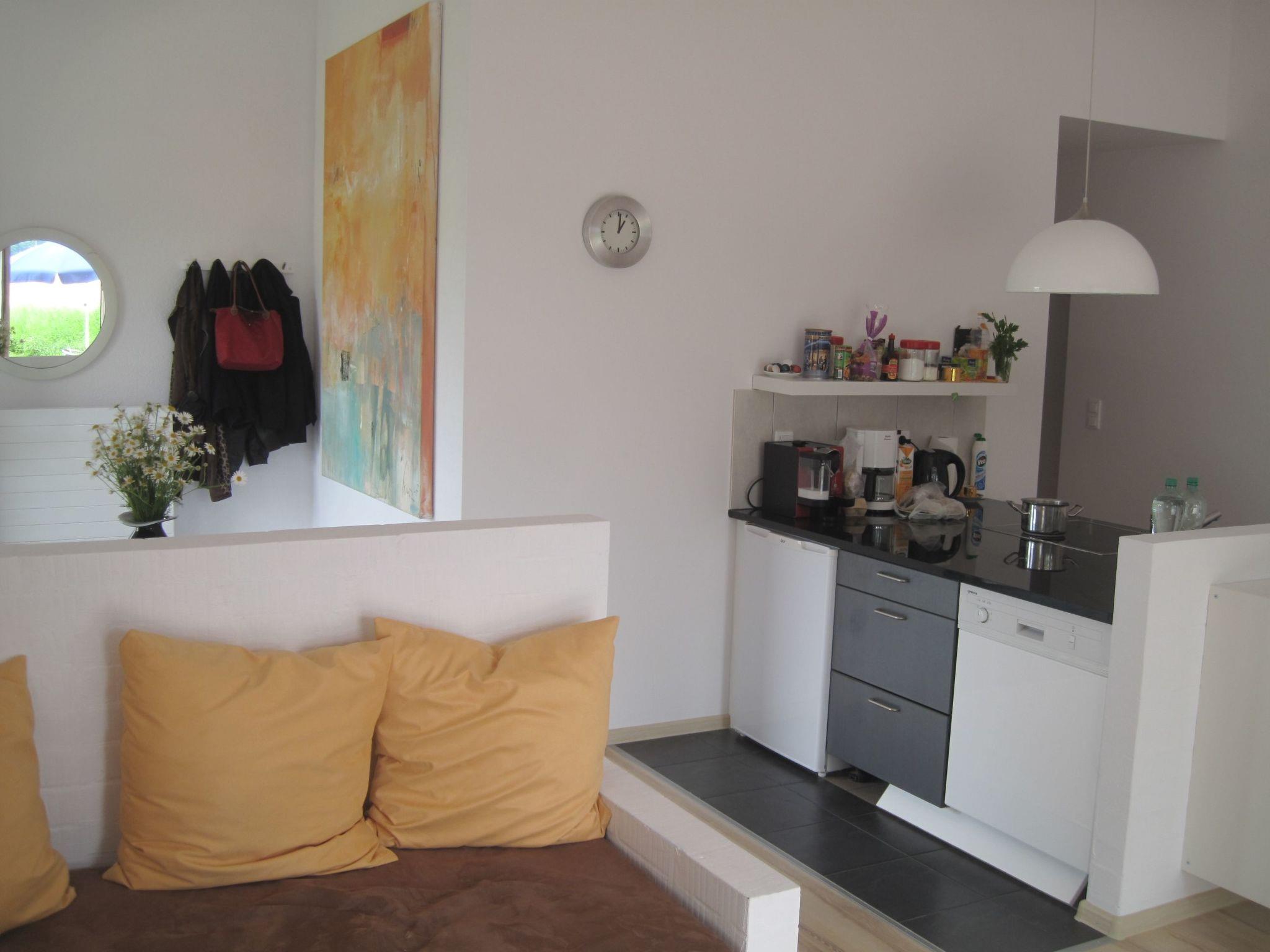 The modern, open-plan rooms are decorated with paintings by Berlin artist P. Lorenz and convey cosiness, warmth and a Mediterranean feel. The large living area with kitchen block and dining table opens out onto the terrace and the green surroundings, making you feel like you're in an oasis.