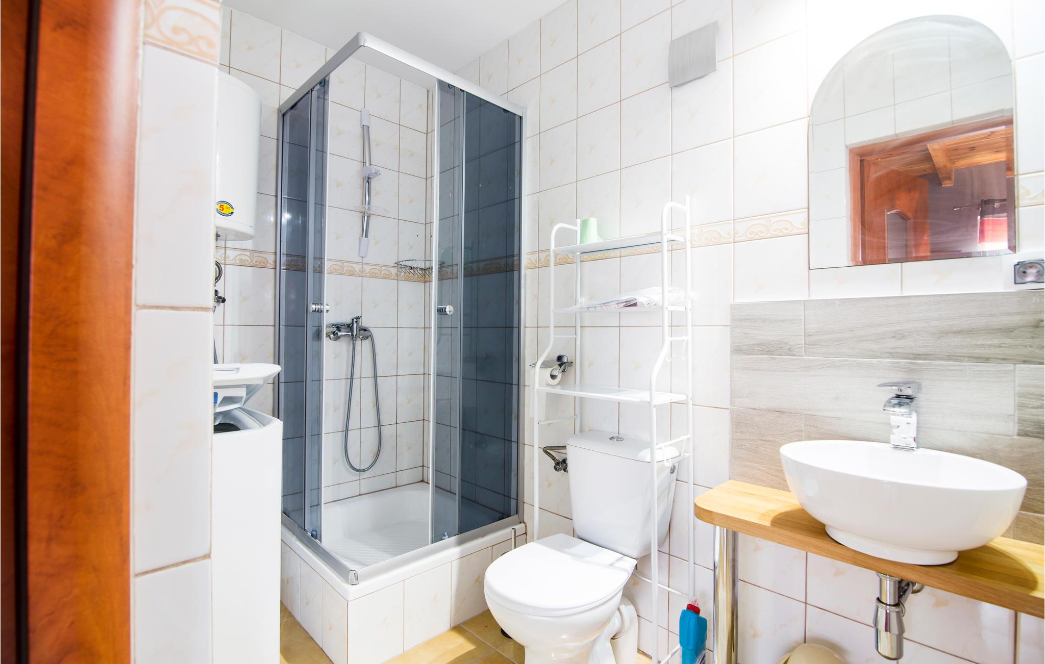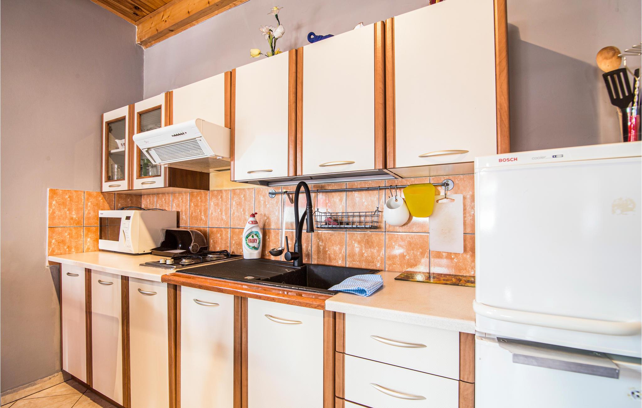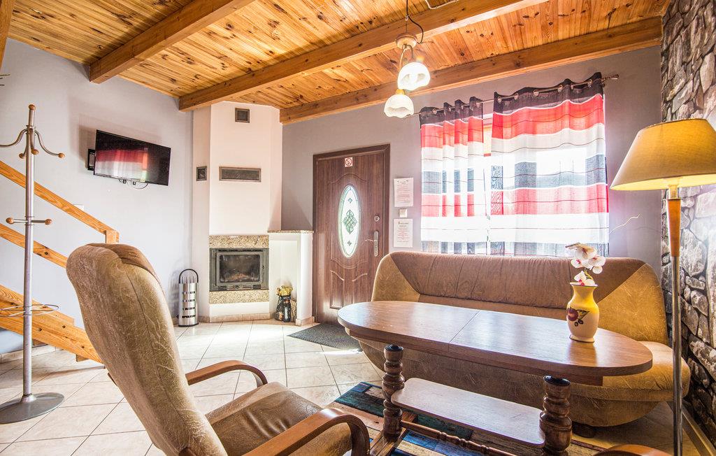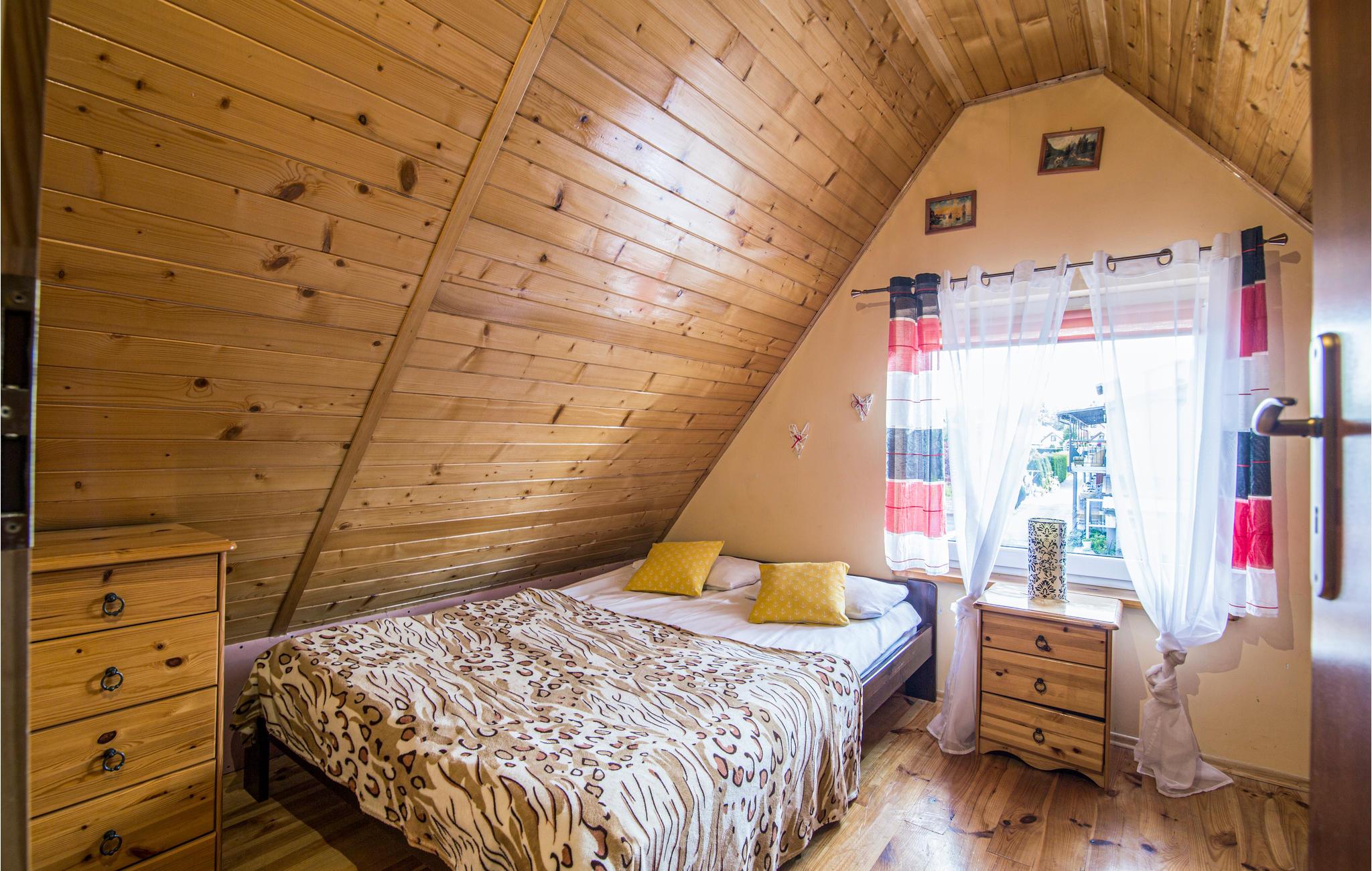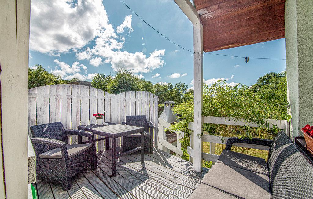 Huset ligger på en egen tomt som deles med andre bygninger. Gjestene har tilgang til en lekeplass, en sandkasse og en huske. På den grønne plenen kan du nyte solen eller slappe av på solsengene. Et eget gjerde sørger for sikkerheten til barn og kjæledyr som ønsker å leke ute. Ved siden av terrassen er det en grill, slik at du kan tilberede deilige grillretter. Feriehuset er praktisk innredet og godt utstyrt. Peisen inviterer deg til koselige kvelder på sofaen.