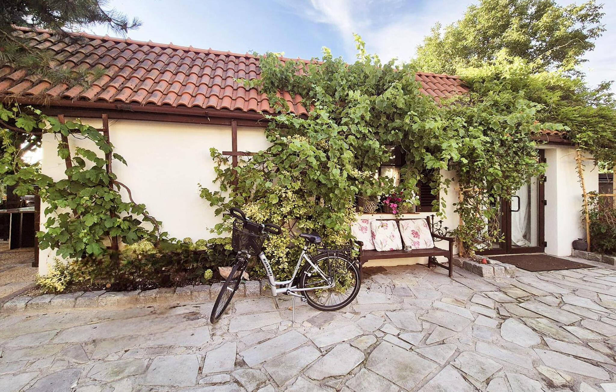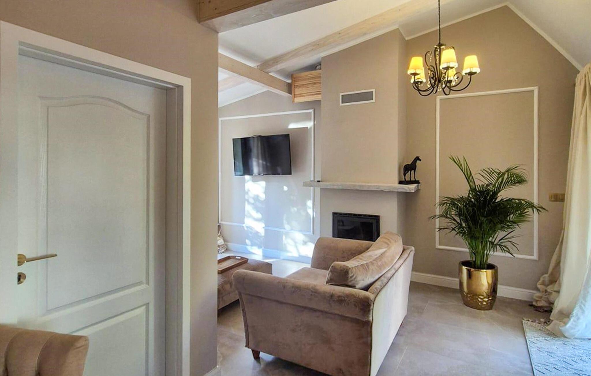 Oppdag dette spesielle tilfluktsstedet omgitt av frodig natur og kjærlig utformede detaljer. Det sjarmerende feriehuset utstråler sin helt egen magi med sine elegante møbler, vedovn og romantiske terrasser. Unn deg selv avslappende dager i denne ferieoasen. Den vakre stuen imponerer med komfortable polstrede møbler og stemningsfull belysning. Legg opp føttene og avrund dagen ved den knitrende vedovnen. Bruk kjøkkenet til å lage mat sammen, og nyt måltidene ved det rustikke spisebordet.