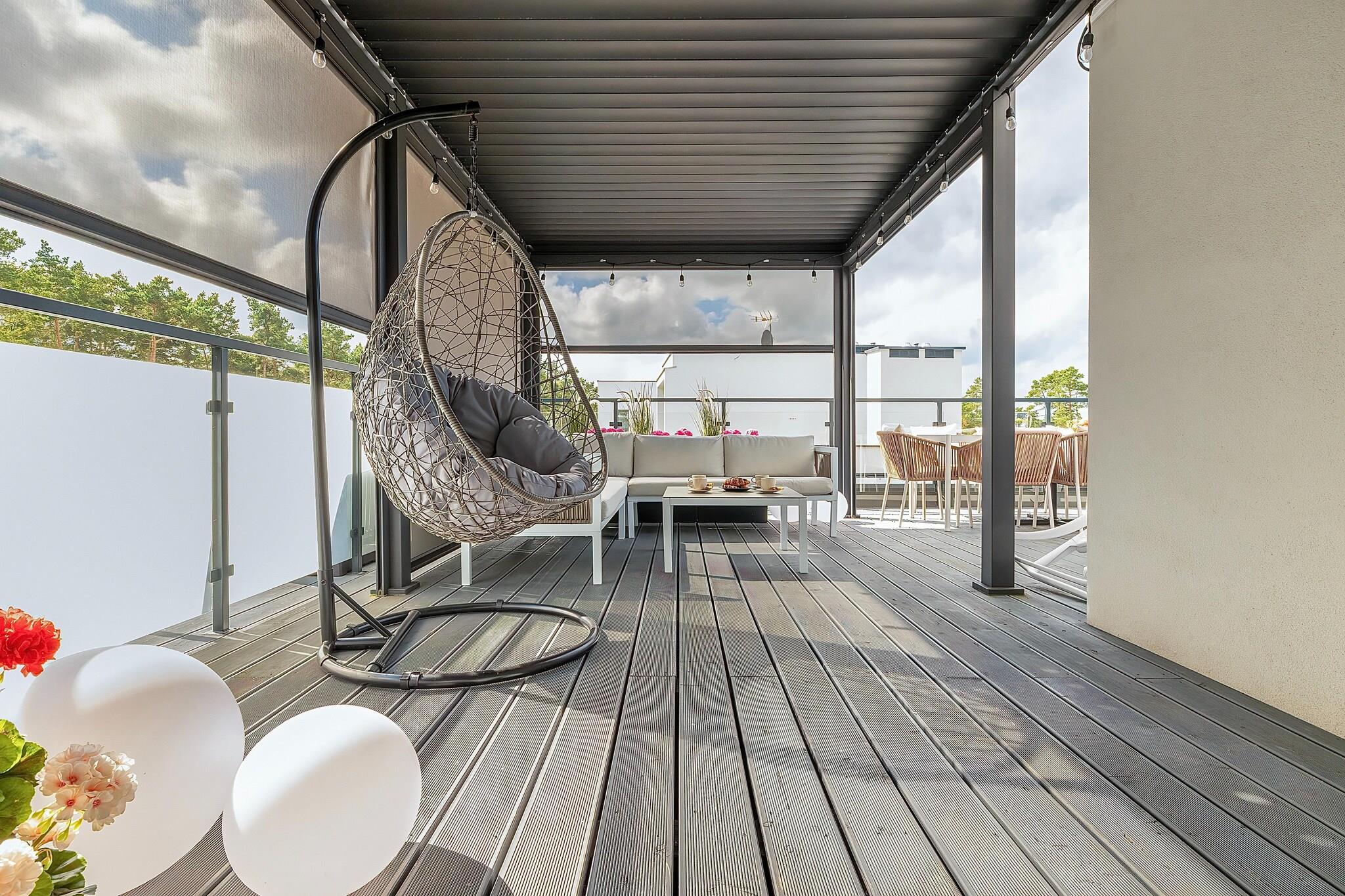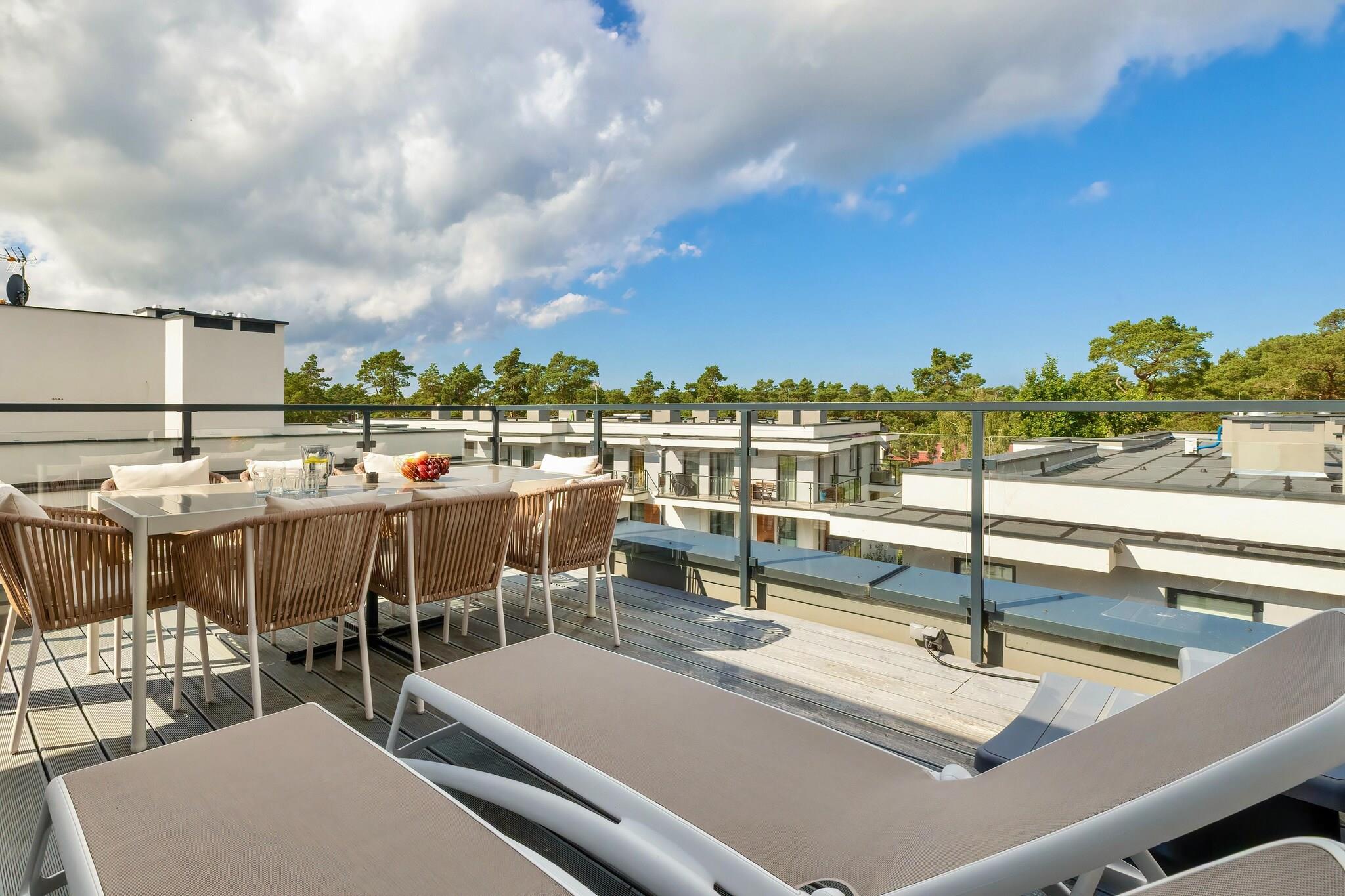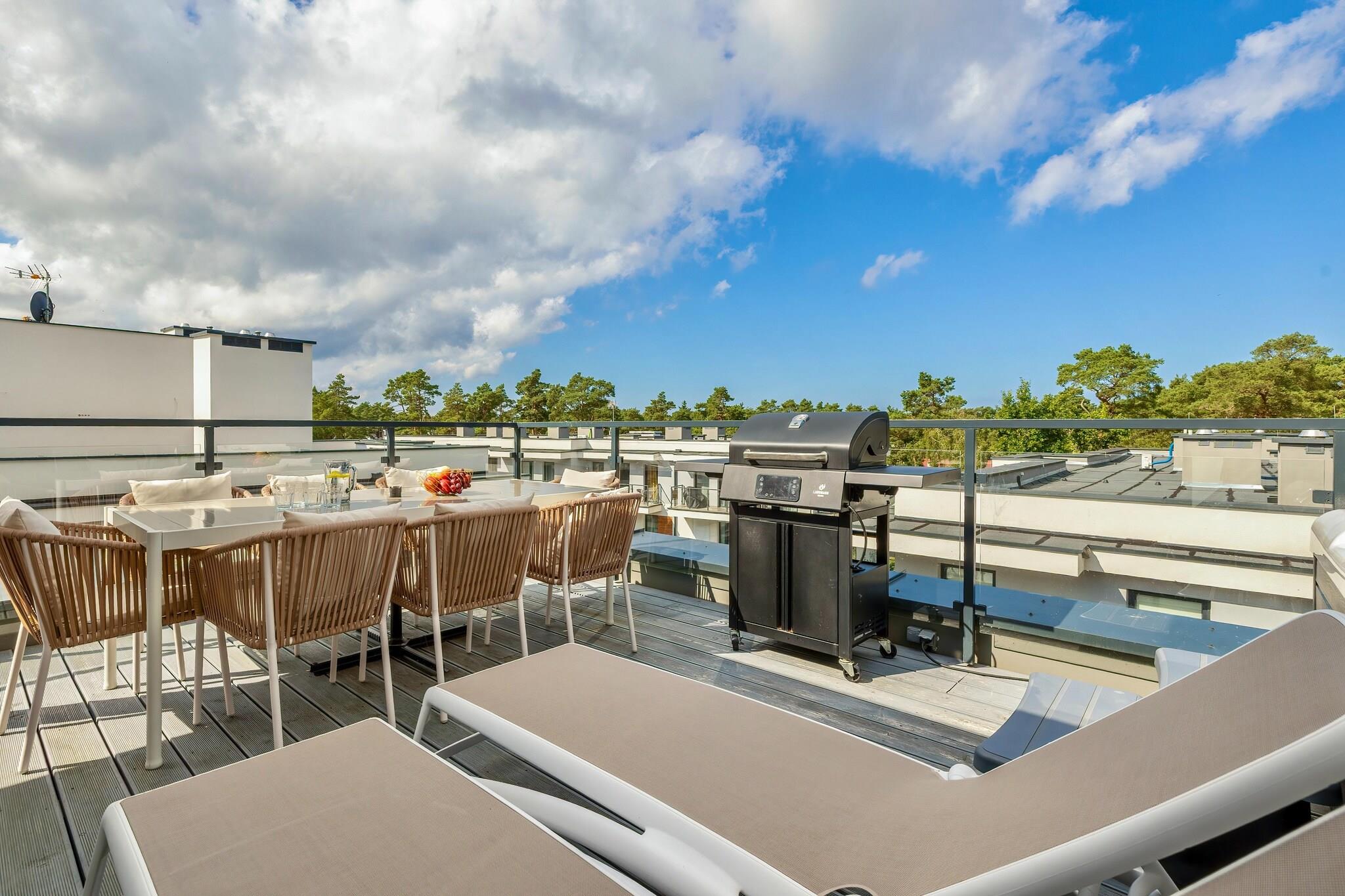 En drømmebeliggenhet i et rolig område, 450 meter fra havet. Sentrum av feriestedet ligger 500 meter unna. Dette moderne leilighetskomplekset er det perfekte feriestedet. Gjestene har tilgang til et innendørs svømmebasseng som er åpent året rundt. Denne usedvanlig luksuriøse og glamorøse leiligheten er fordelt over to etasjer (underetasjen er andre etasje, øvre etasje er tredje etasje). Bygningen har heis. Underetasjen har en svært romslig stue (med TV, et stort spisebord og en dobbel sovesofa), et velutstyrt kjøkken og et bad med dusj. Øvre etasje tilbyr tre separate soverom (to med TV) og noe spesielt – en stor, delvis overbygd takterrasse med boblebad, grill og et stort spisebord. Det er også lenestoler. Klimaanlegg med kjøle- og varmefunksjoner er tilgjengelig. Trådløst internett er tilgjengelig. Prisen inkluderer: strøm- og vannforbruk, privat boblebad på terrassen, et innendørs svømmebasseng som er åpent året rundt, internett og parkering. Barneseng og barnestol er tilgjengelig på forespørsel. Pobierowo er en feriested i Vestpommerske voivodskap. Den ligger ved bredden av Østersjøen. Pobierowo tilbyr en ren strand og et bevoktet badeområde. Det er et perfekt sted for barn, idrettsutøvere og elskere. Det finnes mange romantiske steder for par. Det finnes et papegøyehus, et akvarium og gigantiske oppblåsbare lekeplasser. Barn vil sette pris på et besøk til hvalparken i nærliggende Rewal (ca. 7 km), med sine ekte sjøgiganter, og eventyrhuset, hvor de vil komme ansikt til ansikt med eventyrfigurer. Byens og hele regionens stolthet er den renoverte smalsporede jernbanen, som tilbyr sjarmerende turer til nærliggende feriesteder.