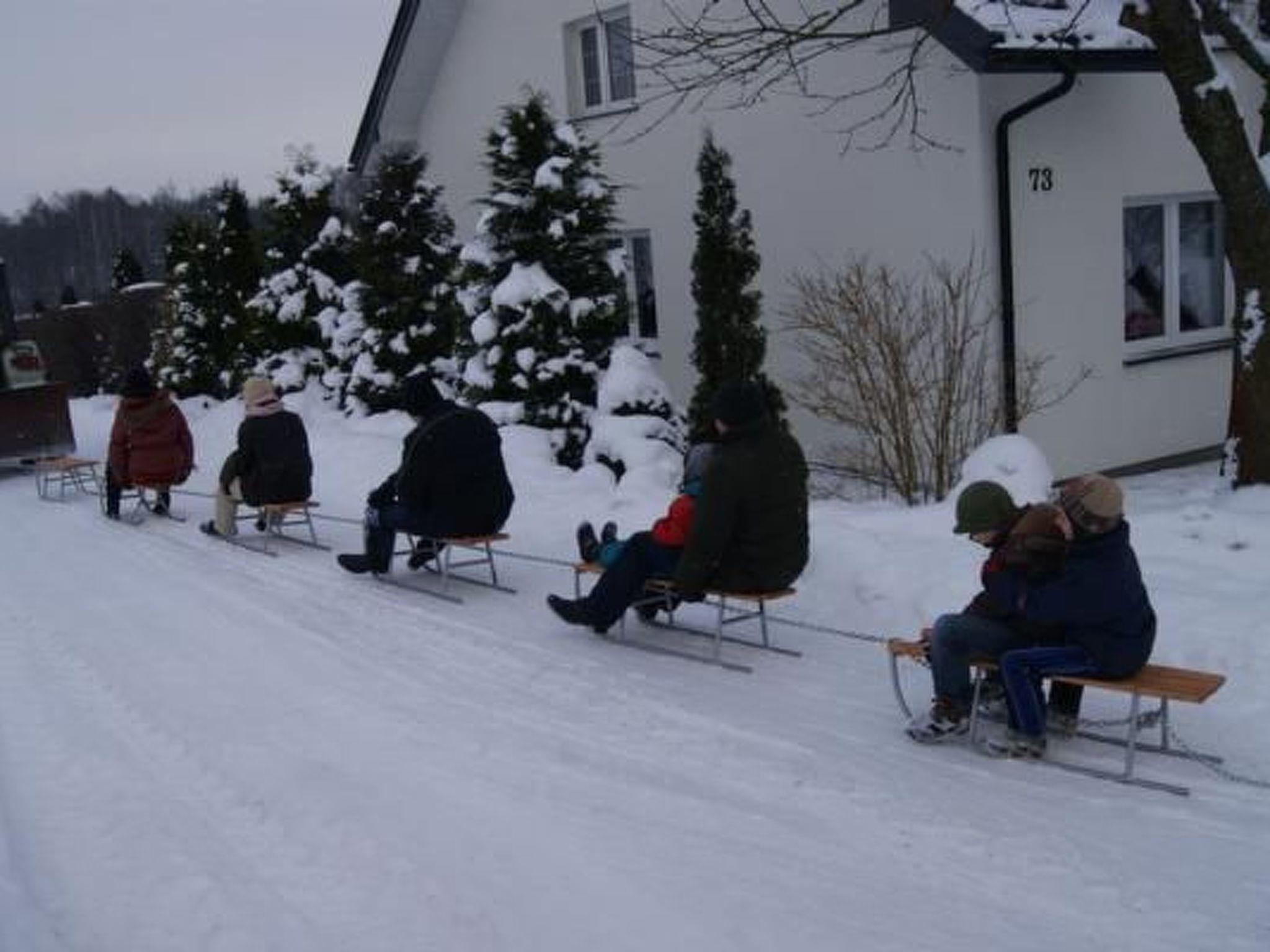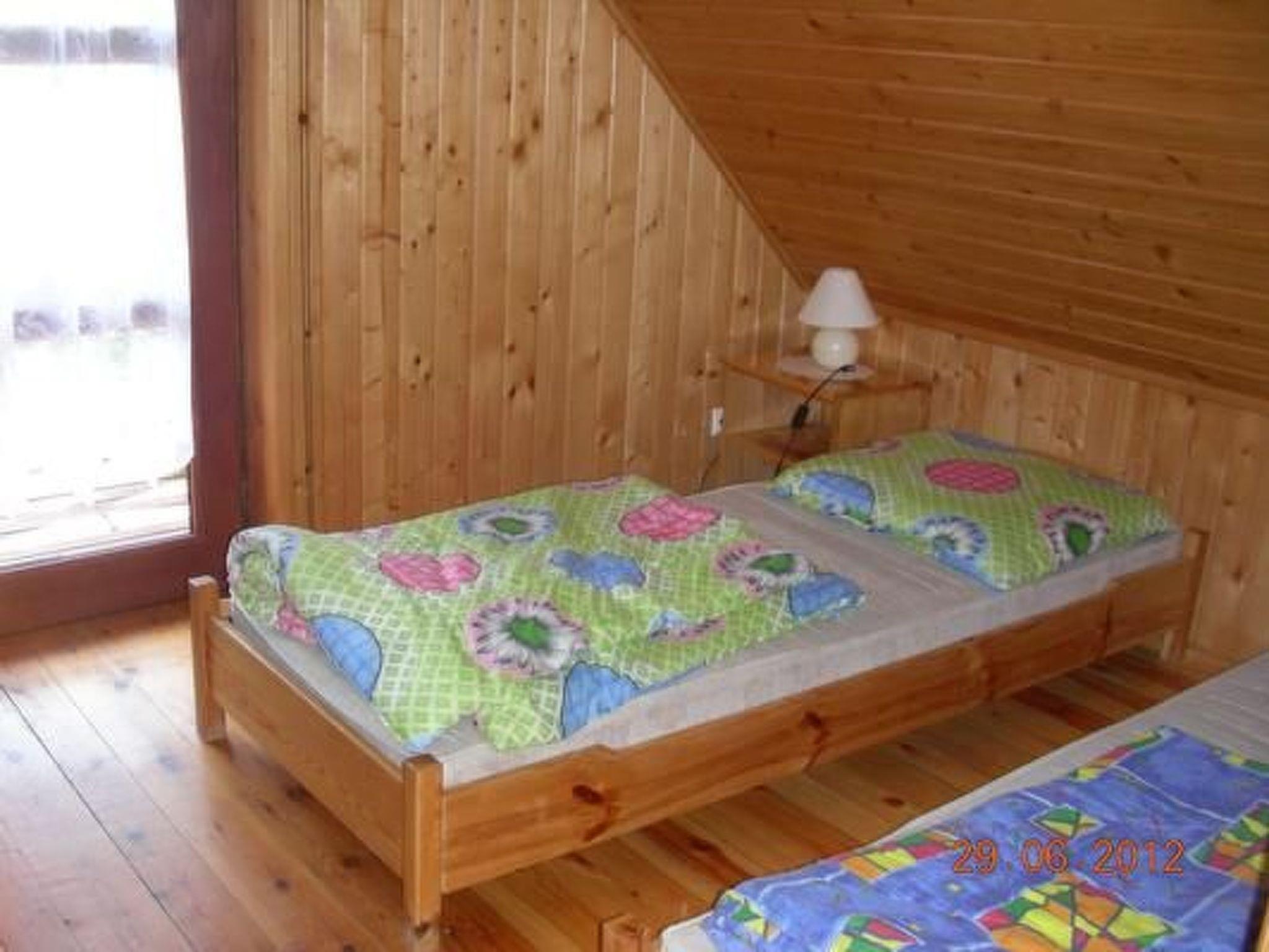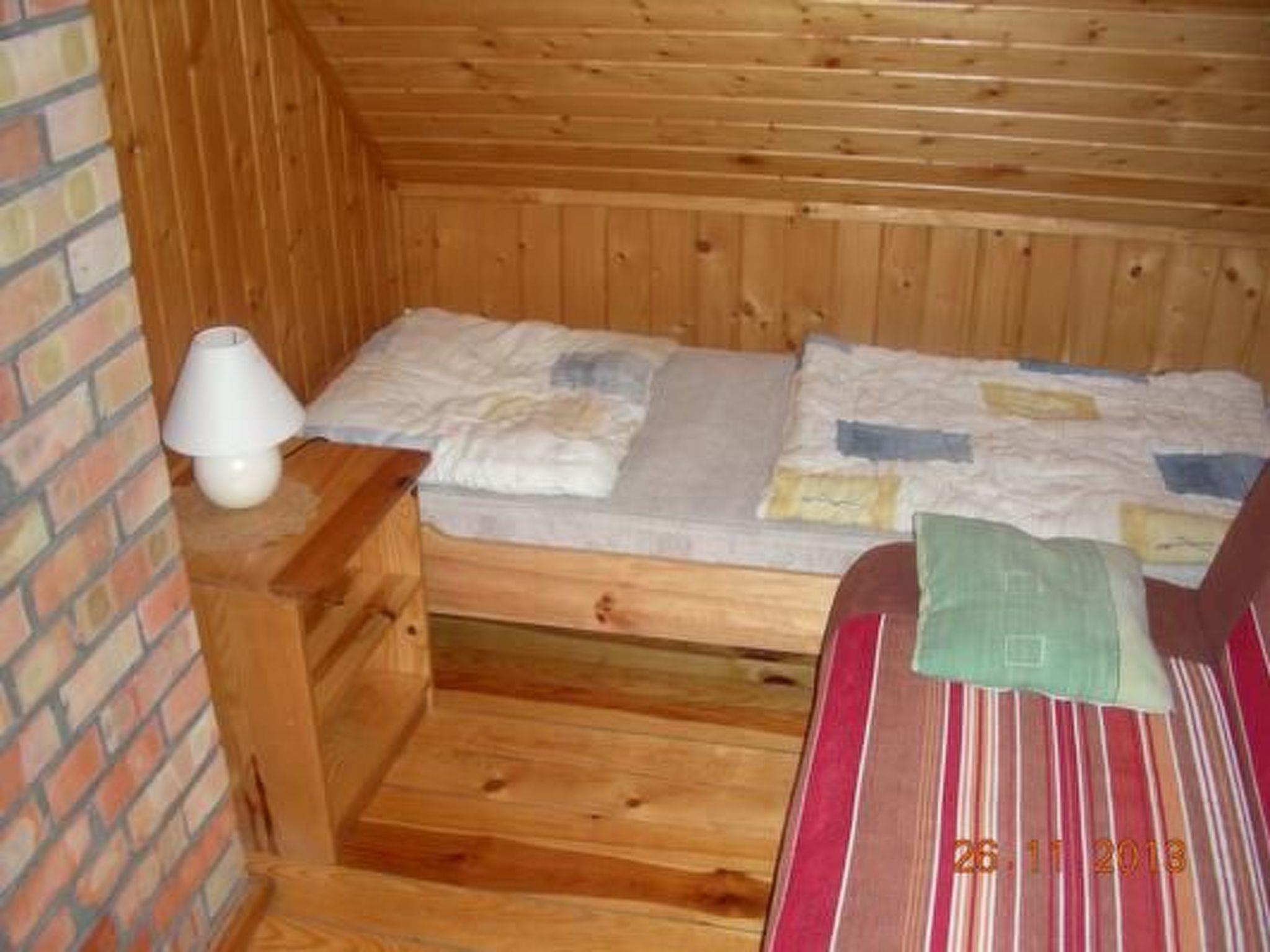 Beautiful and stylishly furnished wooden house, located near the lake and the forest. There are 6 beds in the house. On the ground floor there is a living room with fireplace (32" TV), fully equipped kitchenette (fridge, gas cooker with oven, dishes), shower/WC. On the first floor there are 2 separate bedrooms and a balcony overlooking the lake. The property has a garden house, barbecue, swing, table, sandpit, children's playground, trampolines, volleyball court, fireplace, garden, pond with pier, parking. Very nice beach with a pier, good possibilities for swimming and fishing. At guests' disposal: boats, canoes, bicycles. Meals are optional (breakfast, lunch, dinner). Local products such as ham, pork tenderloin, bacon, sausage, turkey can be purchased on site. Fish can be smoked on request. Zalakowo is 70 km from Gdansk, 40 km from Koscierzyna, 30 km from Kartuzy and 8 km from Sierakowice. Leba - 55 km.
