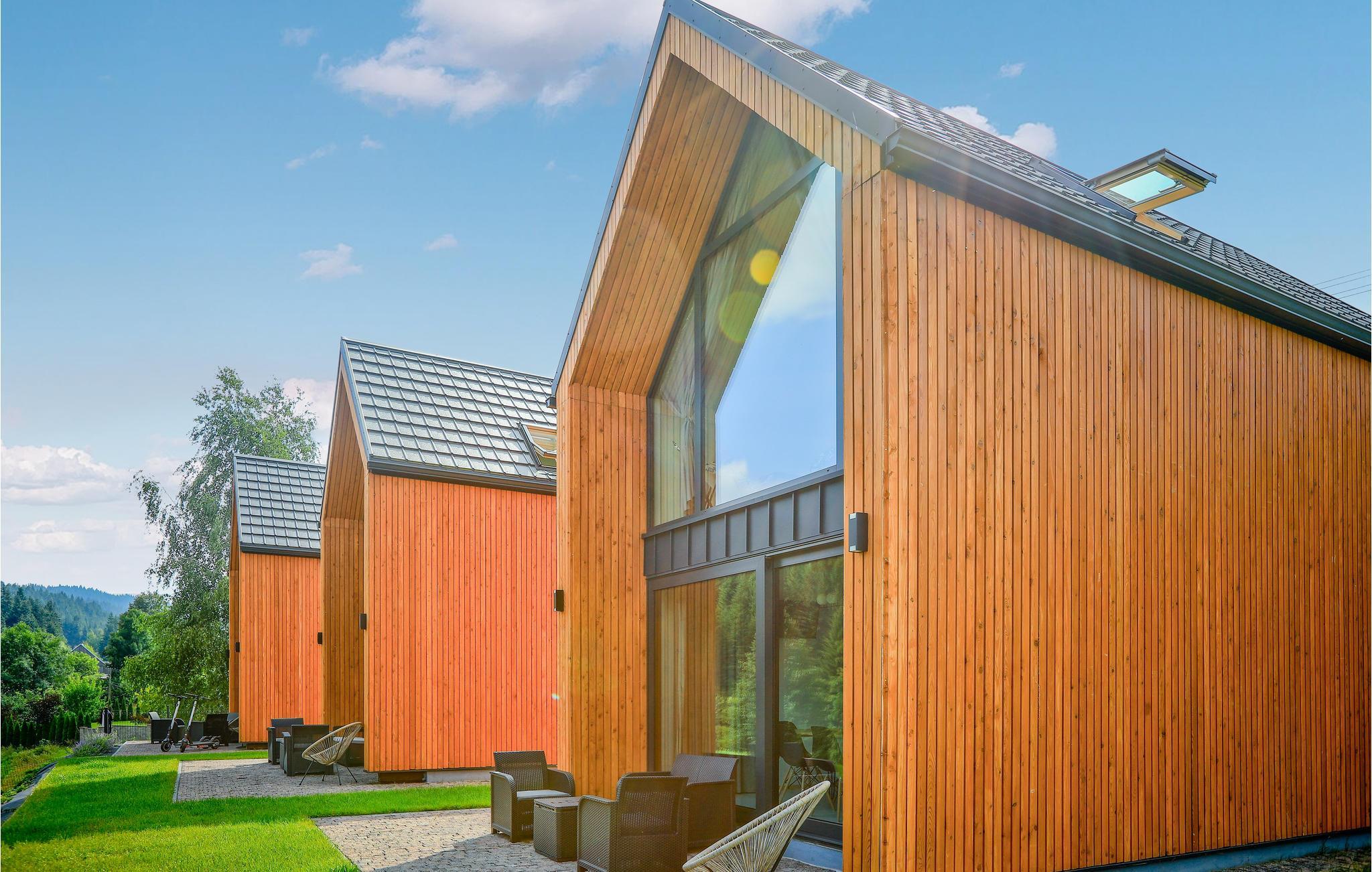 Moderne trehus med panoramautsikt over fjellandskapet og felles svømmebasseng.