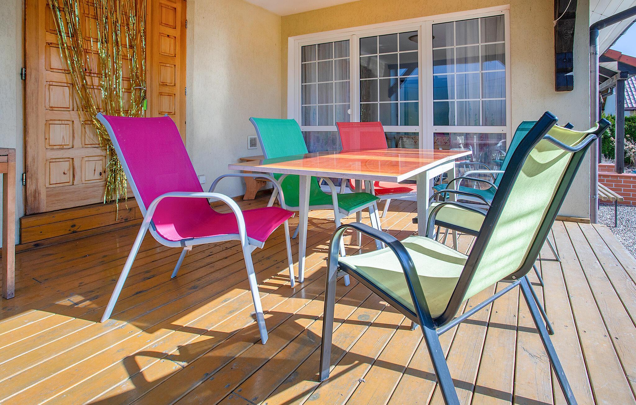 Utenfor inviterer en velstelt felles hage til avslappende timer. Slapp av på den overbygde terrassen med fargerike hagemøbler, eller slå dere sammen rundt den åpne peisen om kvelden. Barna vil elske den store trehusken og trampolinen, mens de voksne kan nyte roen i omgivelsene på en av hagebenkene. Du kan også utforske dammen på eiendommen og nyte en aktiv ferie.
