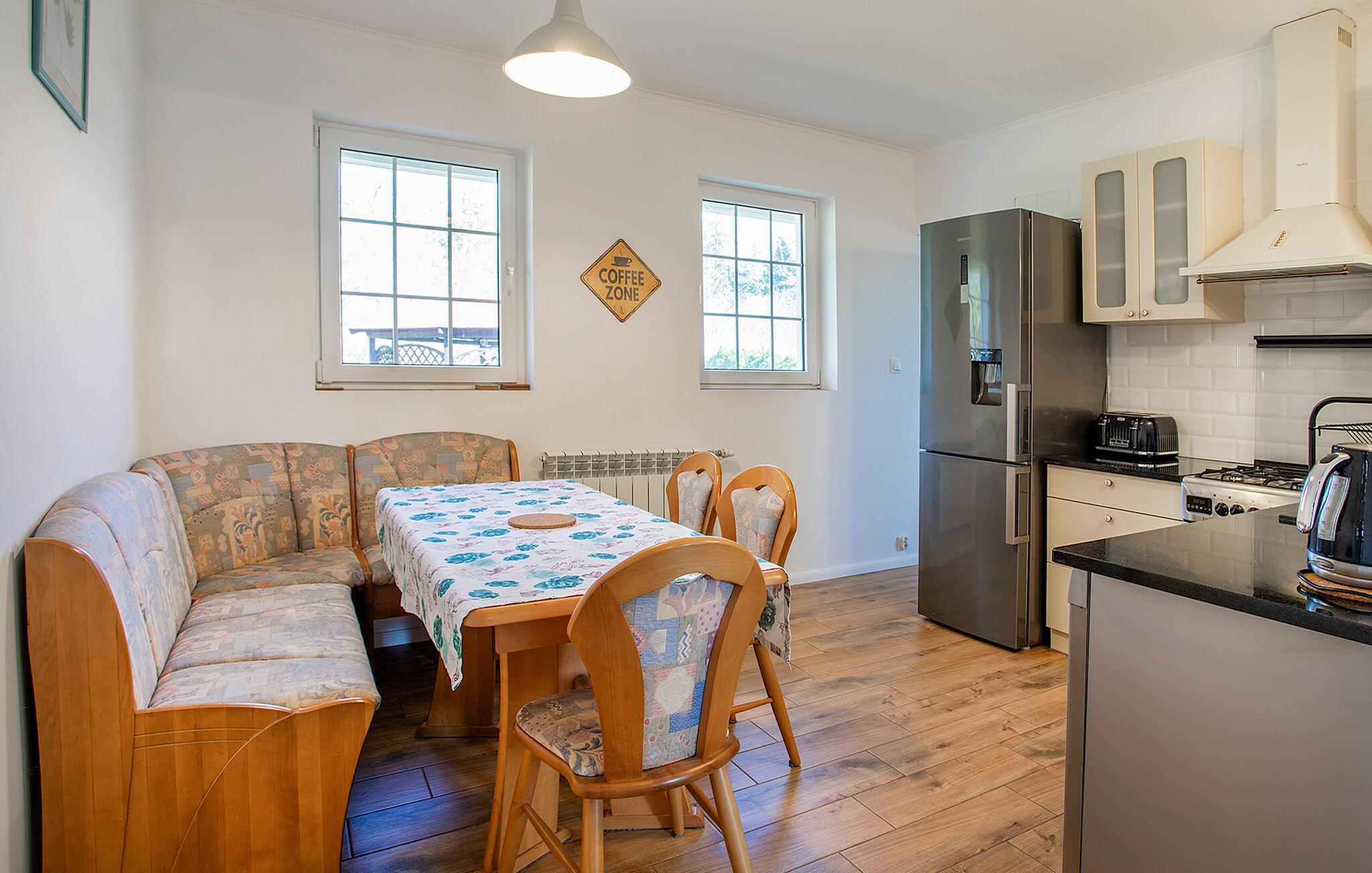 Se frem til en idyllisk ferie i dette koselige og rolig beliggende feriehuset. Huset ønsker deg velkommen med et innbydende oppholdsrom som er lyst, vennlig og praktisk innredet. Slapp av sammen i de komfortable sofaene på koselige kvelder, eller nyt måltidene ved det store spisebordet. Du kan også tilbringe hyggelige timer med å lage mat og spise sammen med familie eller venner.