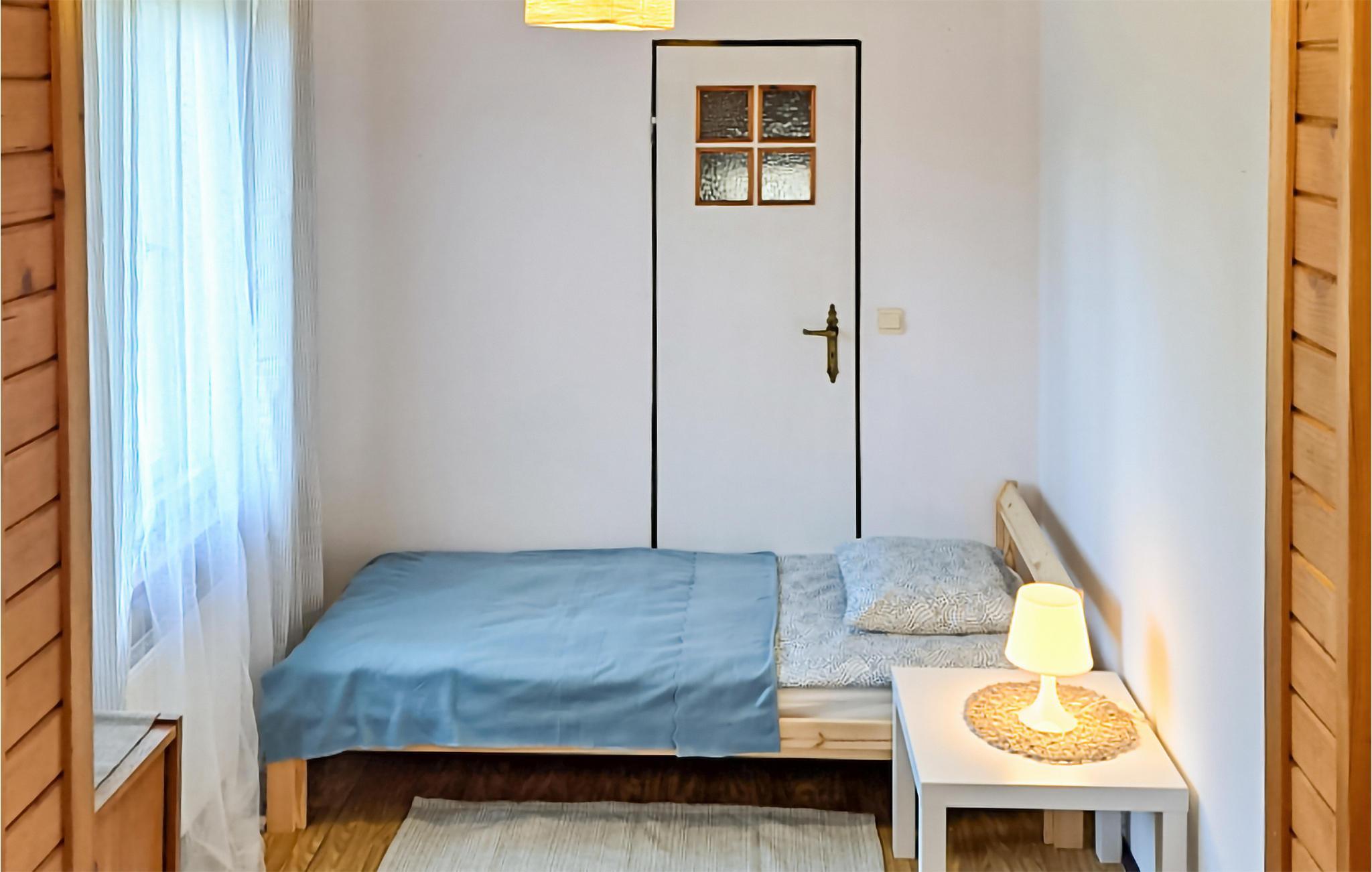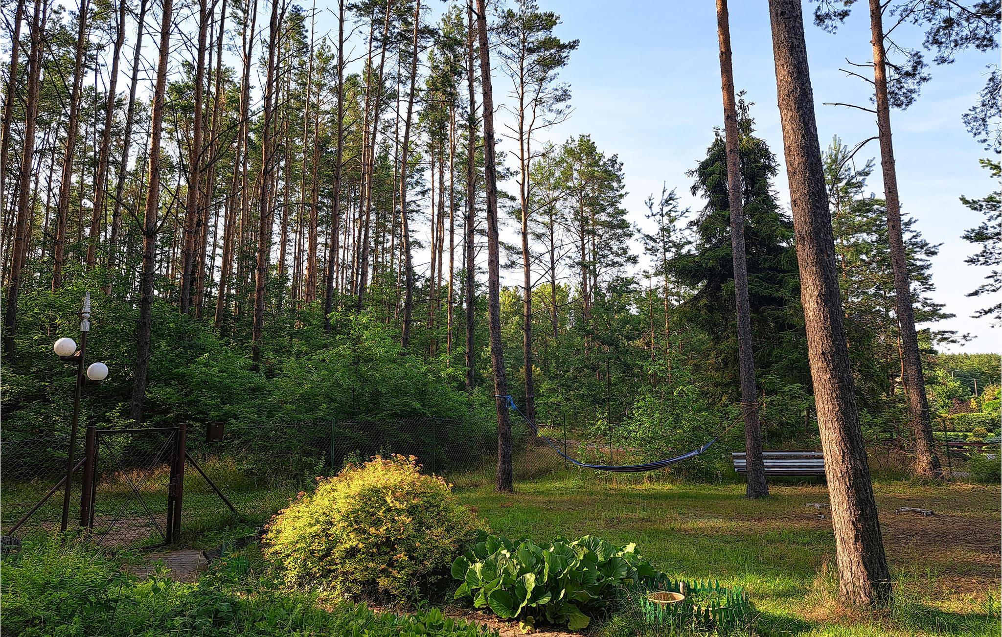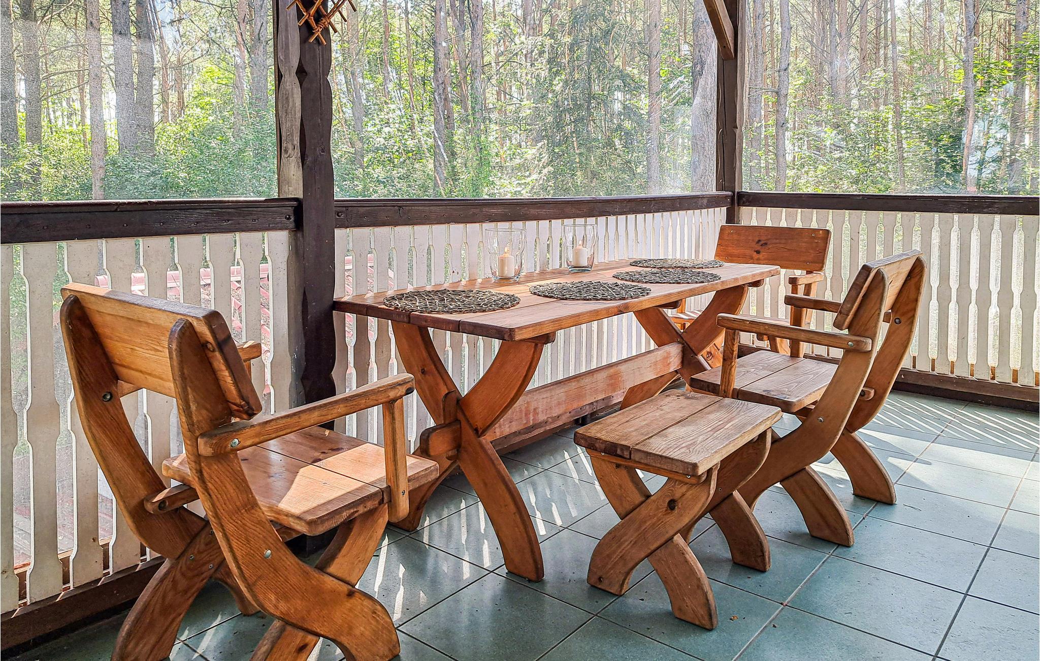 Dette rustikke feriehuset ligger i skogen og tilbyr deg absolutt stillhet og fantastisk natur. I hagen med de høye trærne kan du slappe av i hengekøyen eller bake brød på bålet. Fra den overbygde terrassen har du en fantastisk utsikt over skogen og den nærliggende innsjøen.