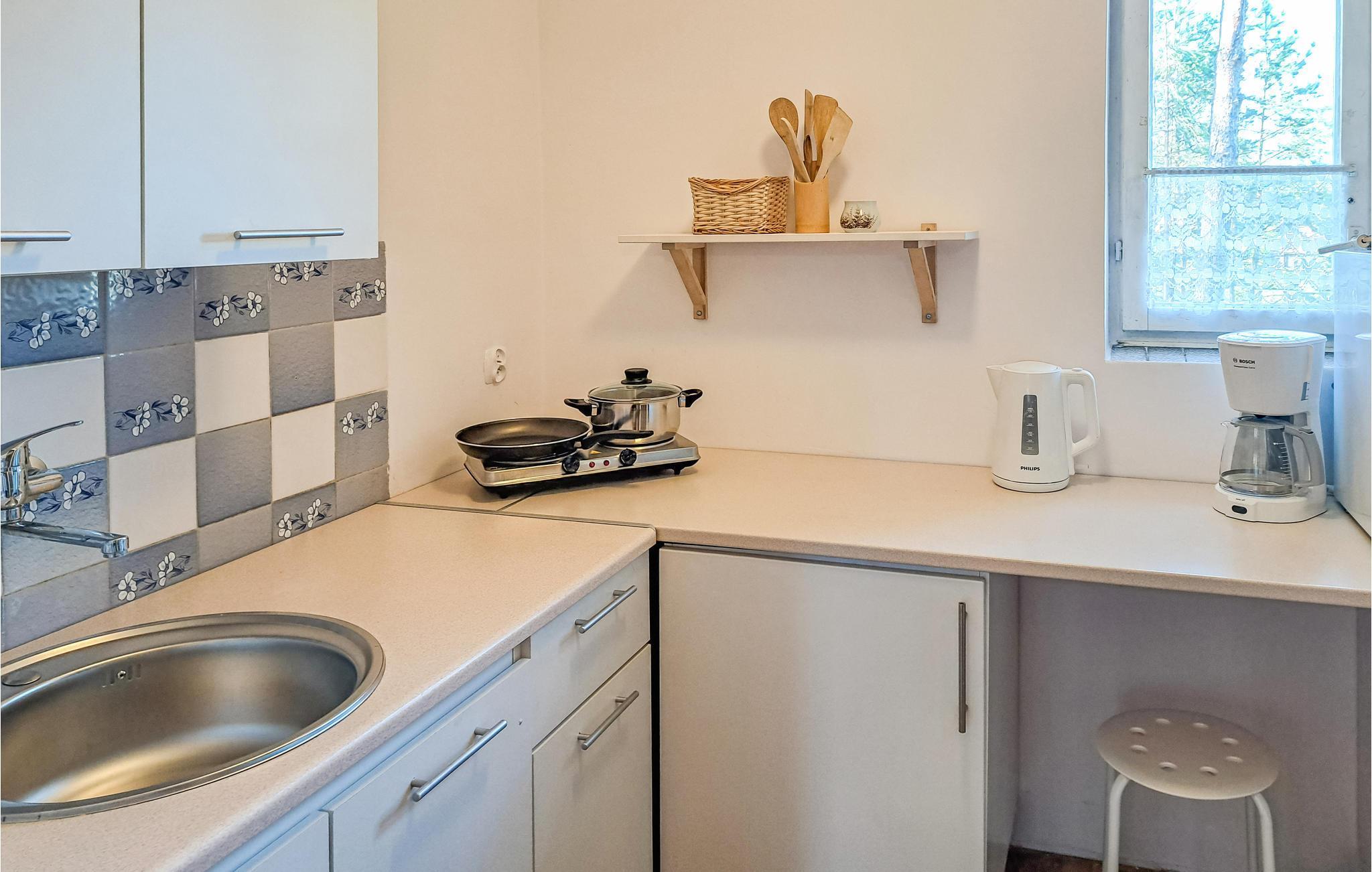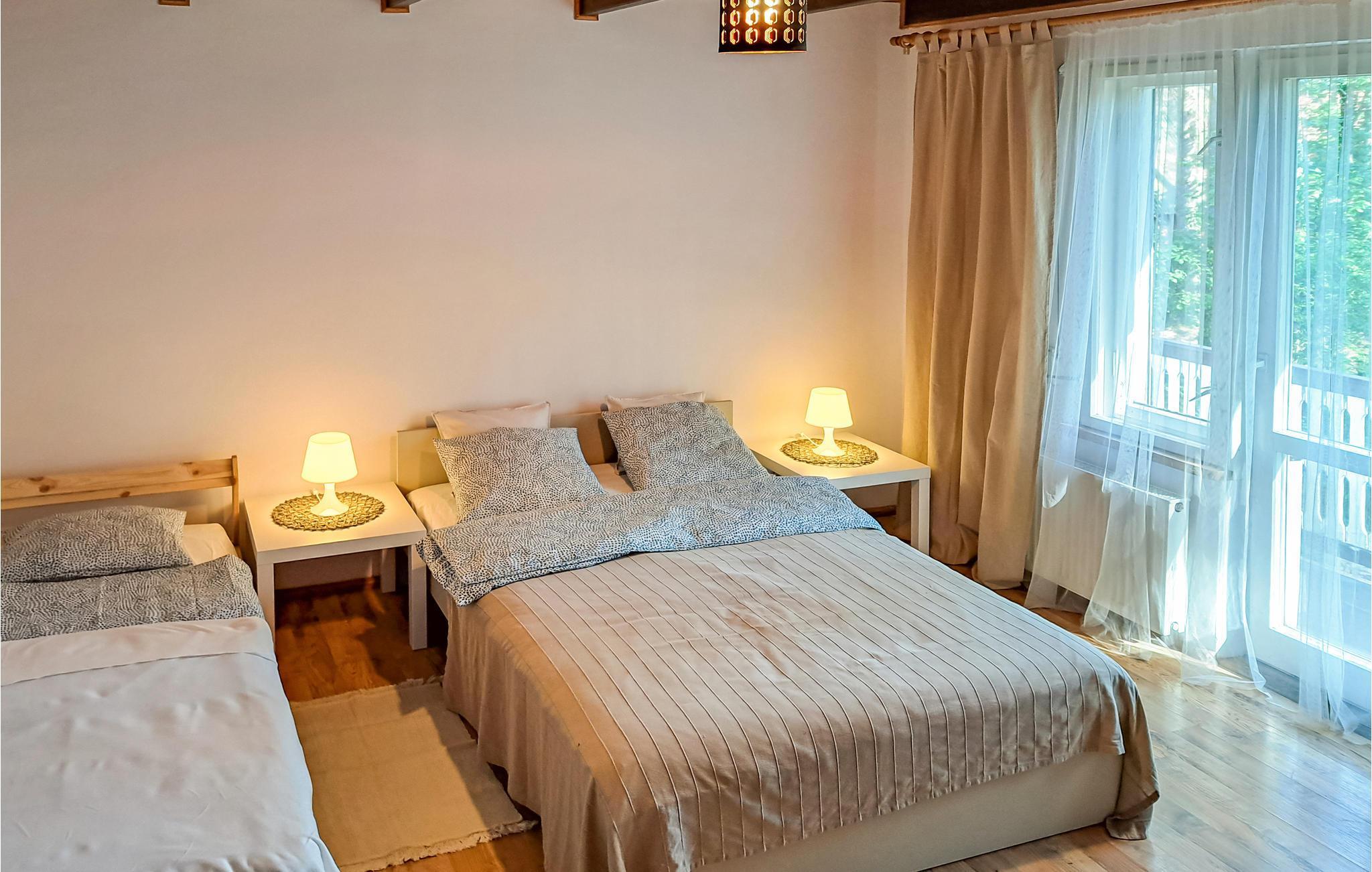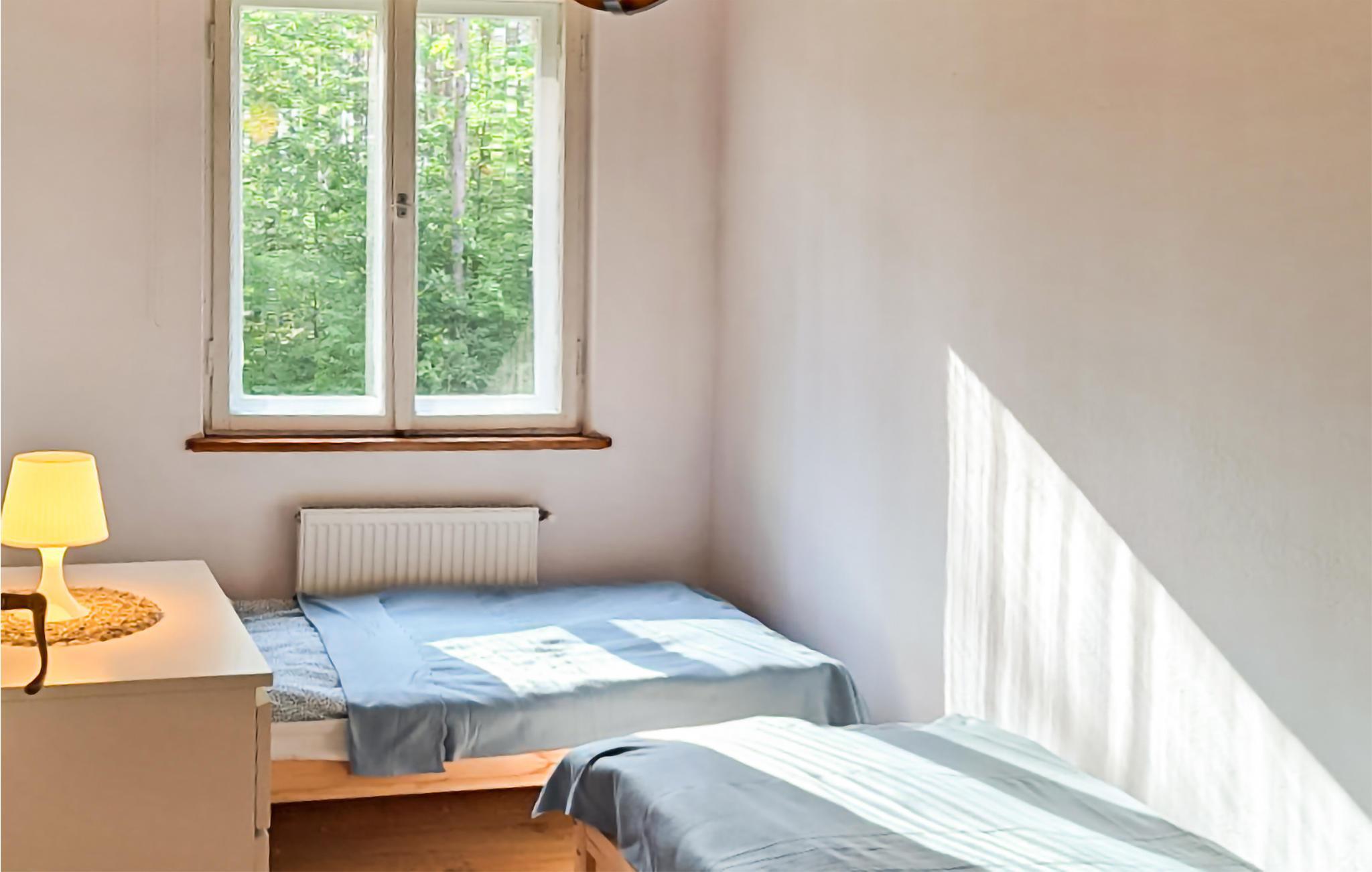 Dette rustikke feriehuset ligger i skogen og tilbyr deg absolutt stillhet og fantastisk natur. I hagen med de høye trærne kan du slappe av i hengekøyen eller bake brød på bålet. Fra den overbygde terrassen har du en fantastisk utsikt over skogen og den nærliggende innsjøen.