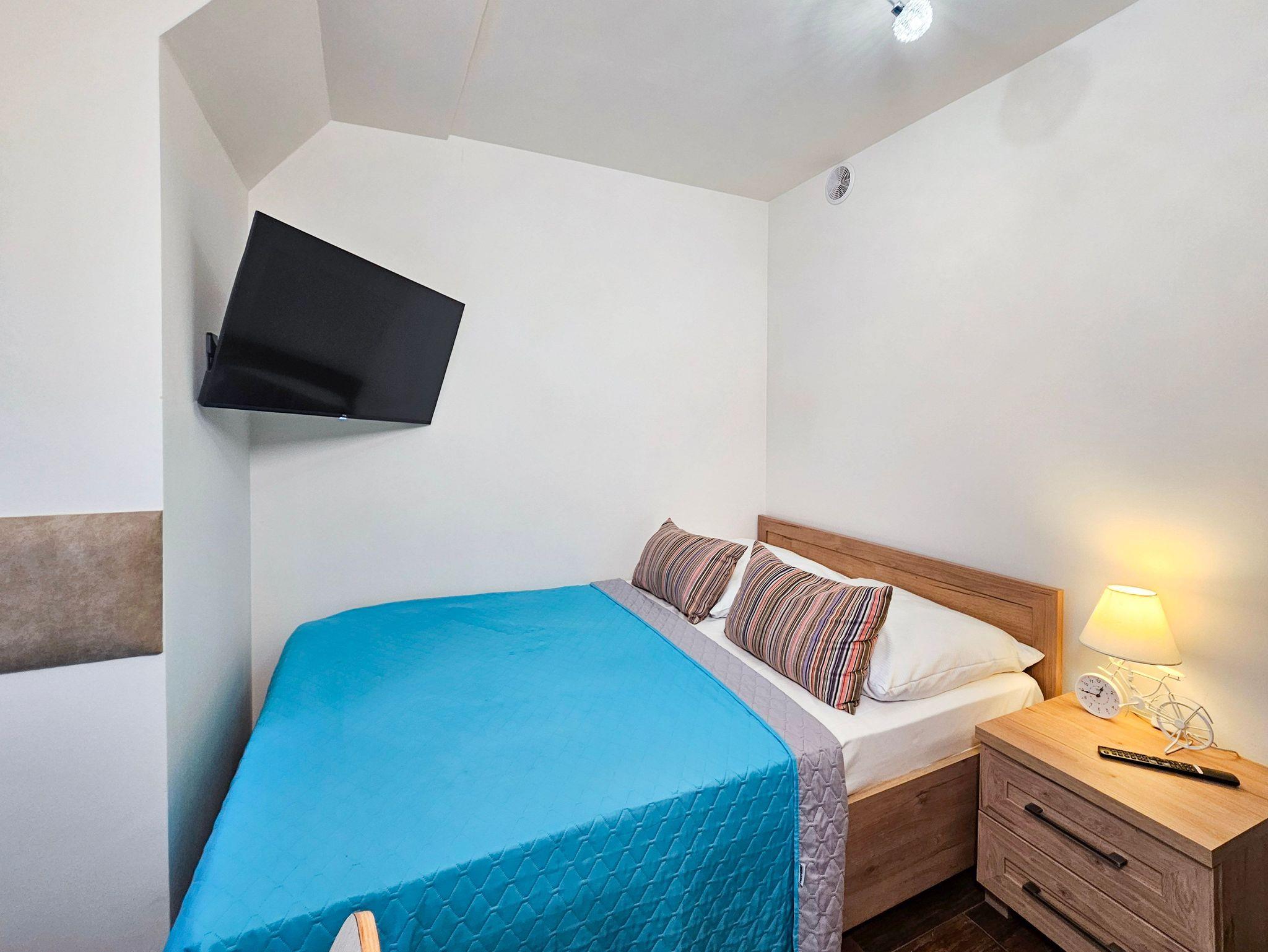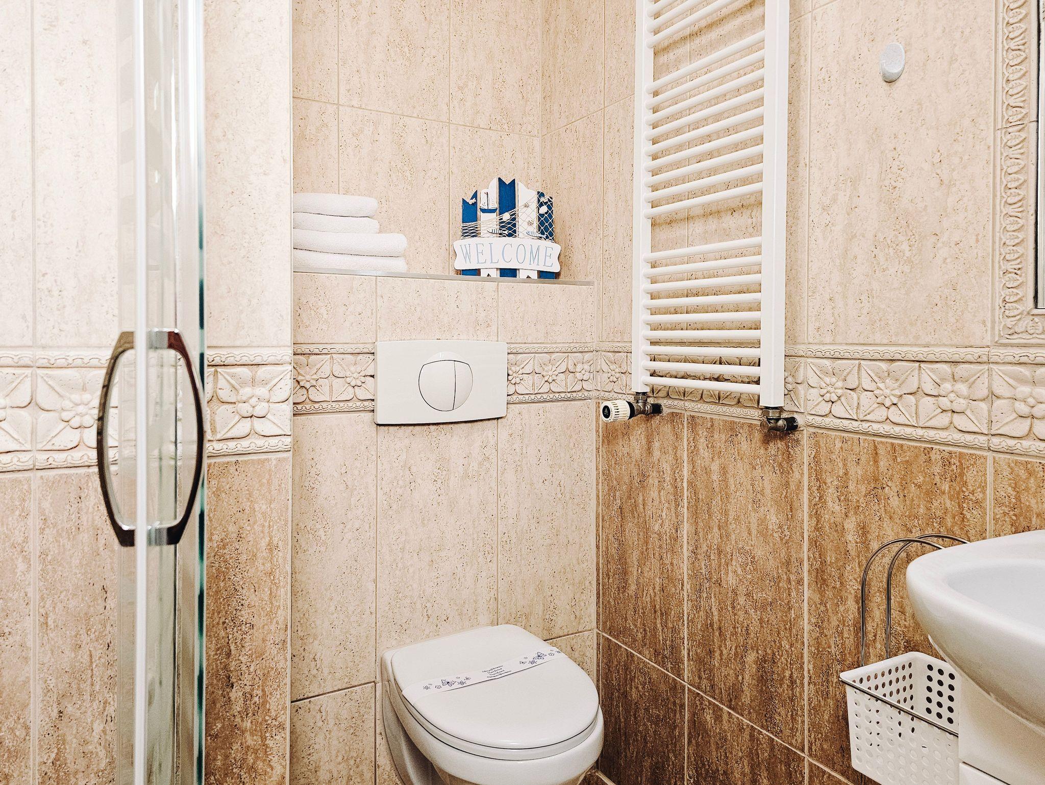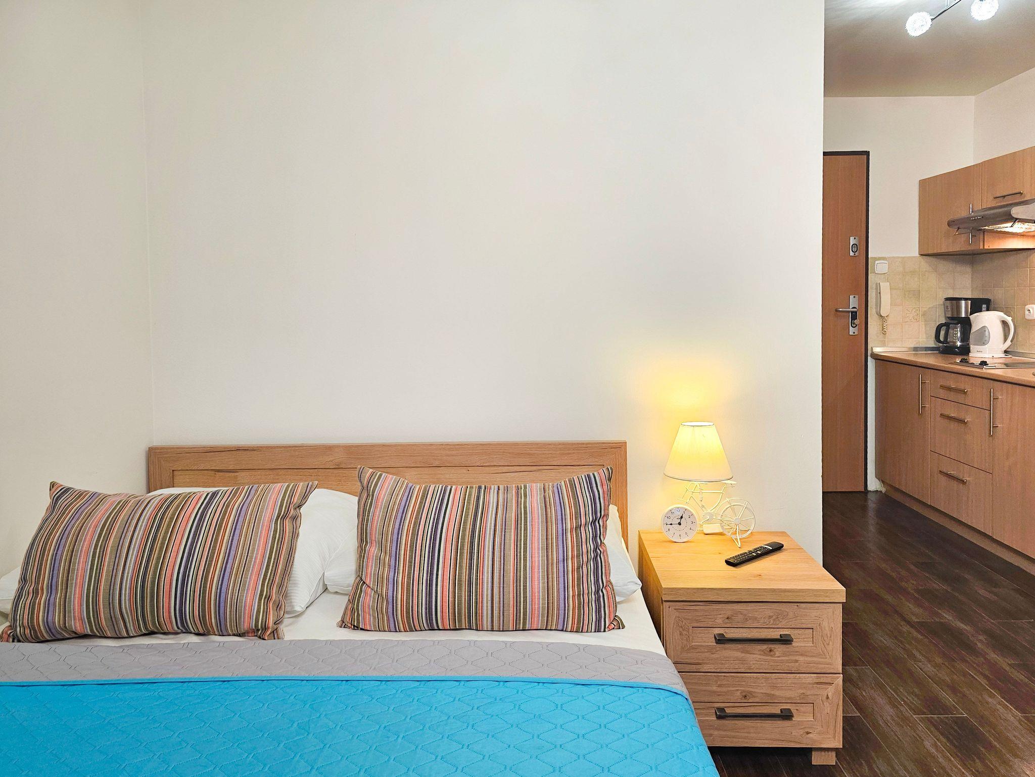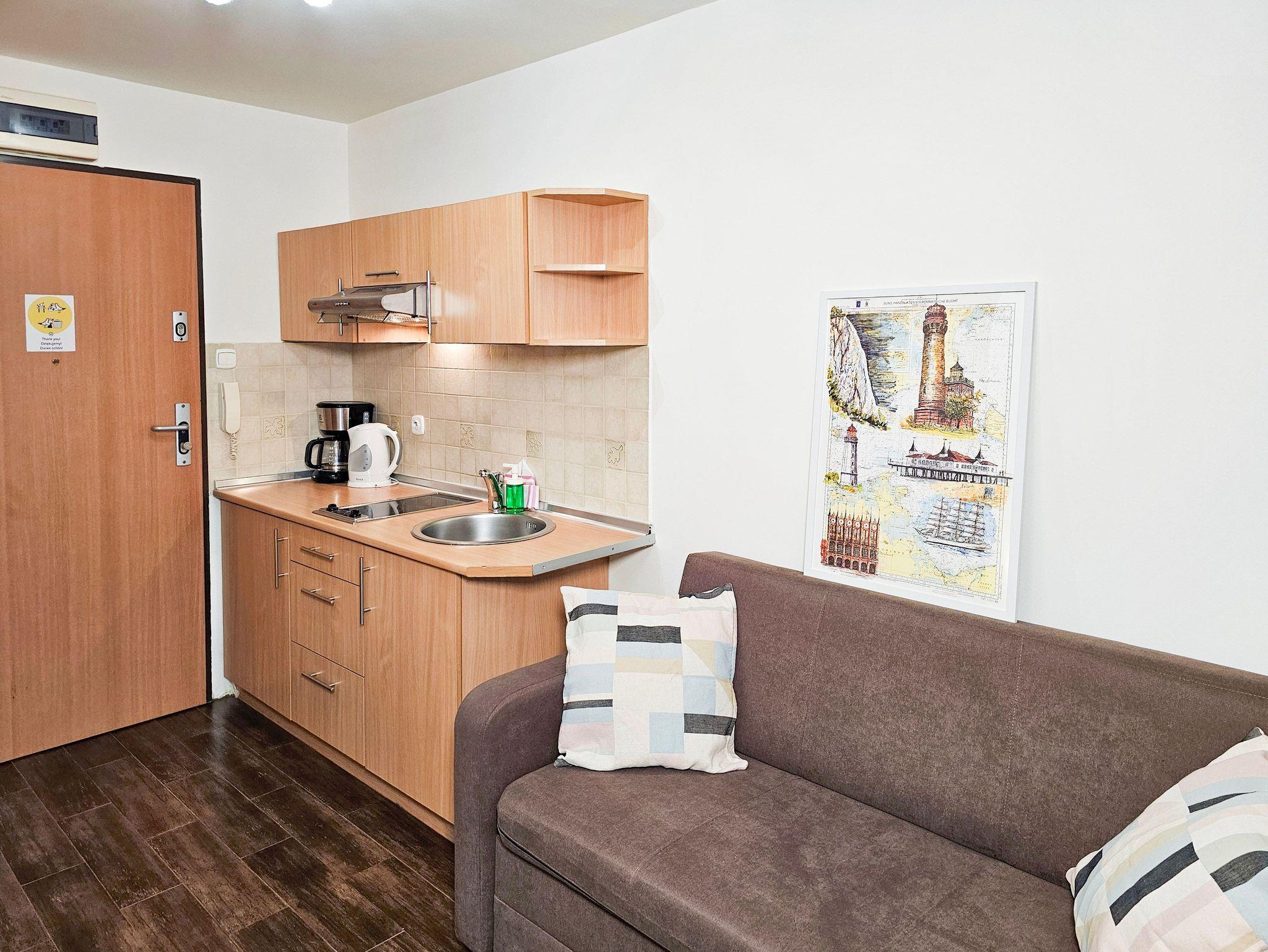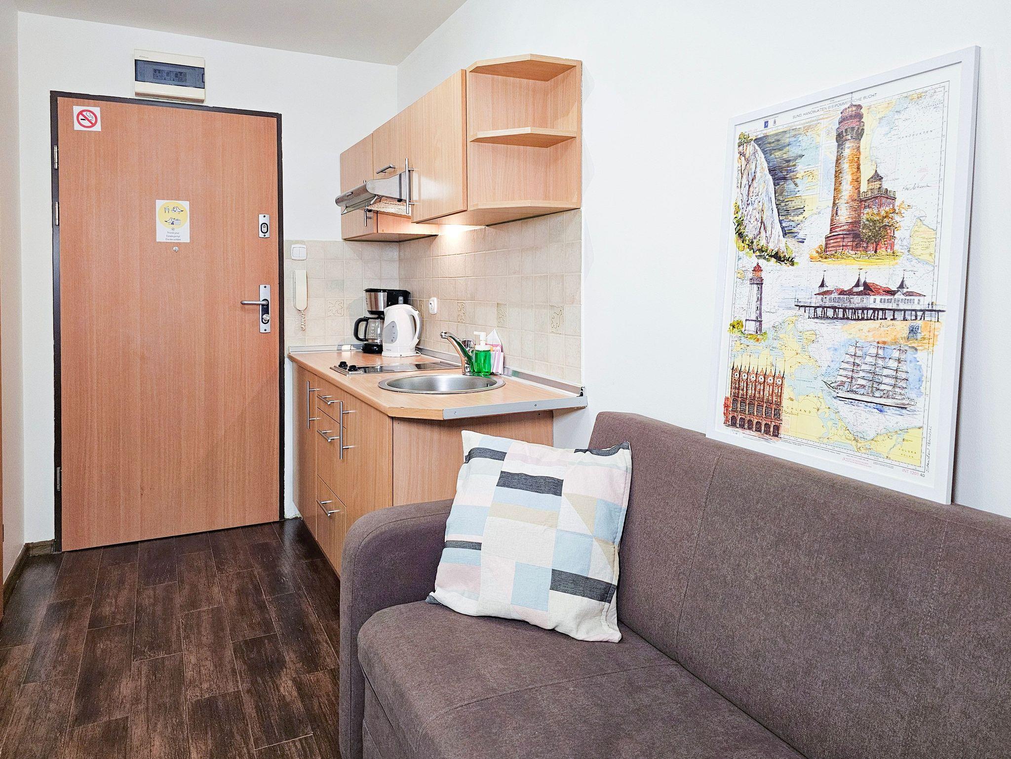 Die 1-Zimmer-Ferienwohnung mit einer Fläche von 20m2 befindet sich im 3. Stock eines mit einem Fahrstuhl ausgestatteten historischen Gebäudes an der Promenade. Sie ist für den Aufenthalt von zwei Personen und eines Kindes vorbereitet. Die Wohnung besteht aus einem Raum mit Küchenzeile und einem Badezimmer mit Dusche und einer Toilette. Sie ist mit ein Doppelbett (140x200cm), einem Esstisch, 2 Stühlenund einem Fernseher ausgestattet. Die Fenster der Wohnung sind nach Westen gerichtet.