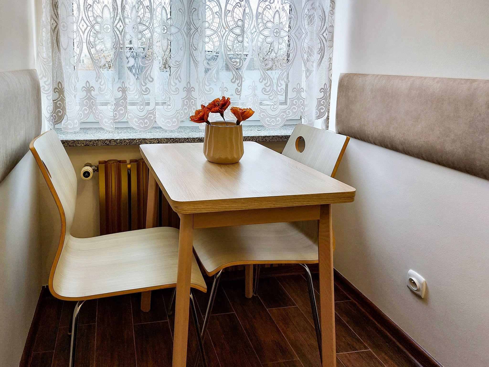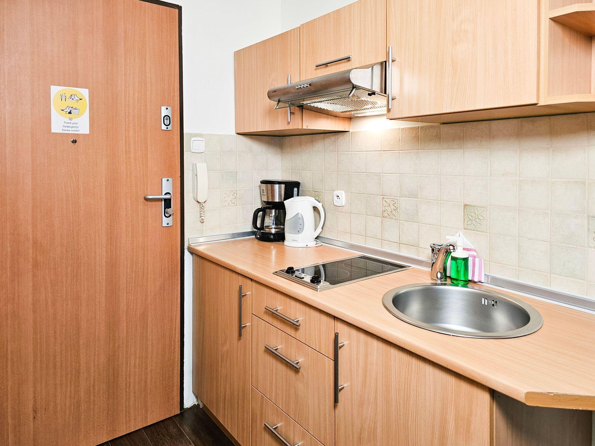 Die Küchenausstattung umfasst einen Unterbaukühlschrank, ein elektrisches Kochfeld mit zwei Heizflächen, Wasserkocher, notwendiges Geschirr und Besteck. WLAN ist verfügbar. Der Parkplatz ist nicht garantiert. Das Auto kann man auf der Straße parken, gebührenpflichtig (ganzjährig kostenpflichtige Parkzone). Ein bewachter, kostenpflichtiger Parkplatz ist etwa 350m von der Wohnung entfernt. Haustiere sind nicht erlaubt.