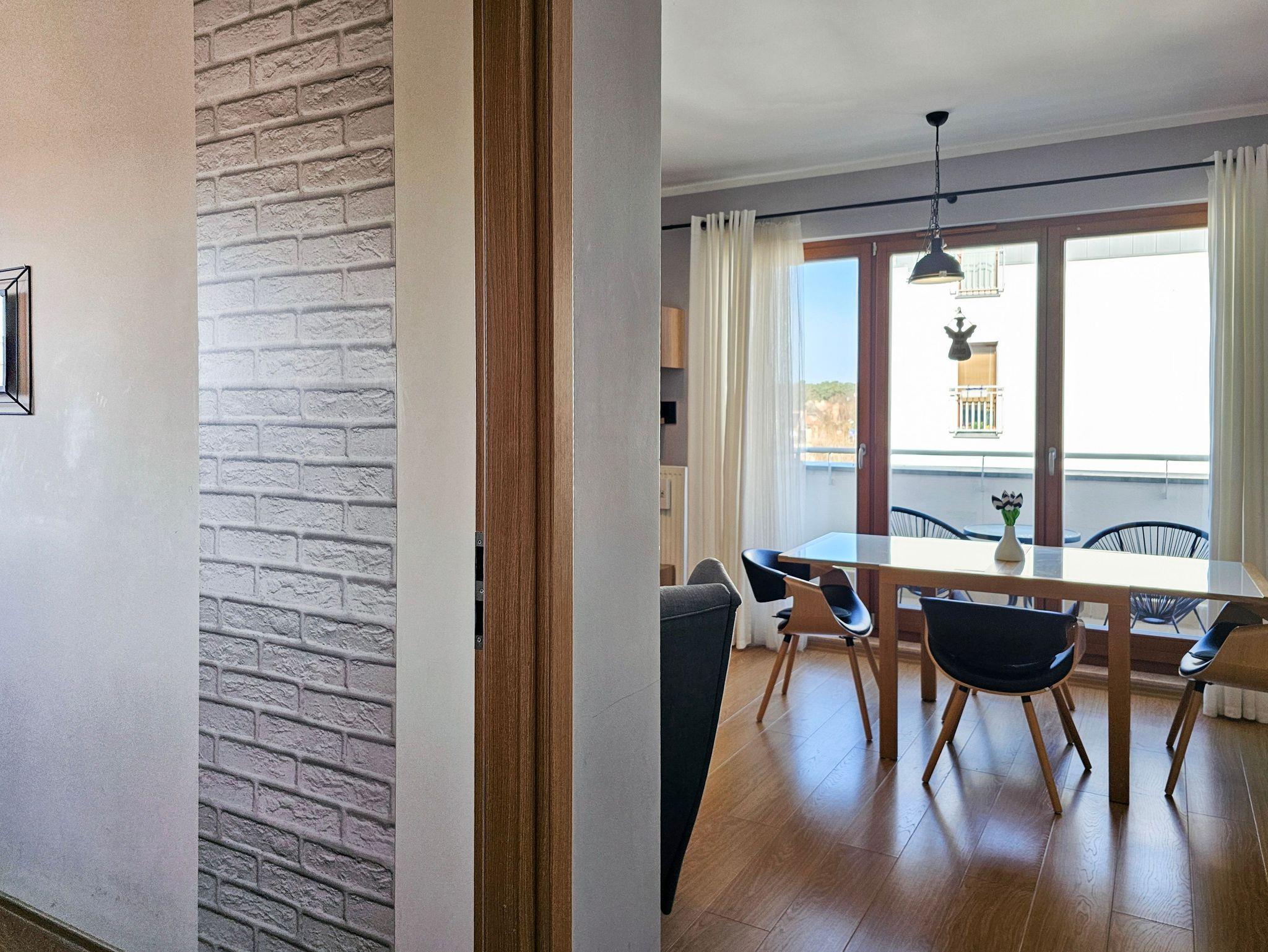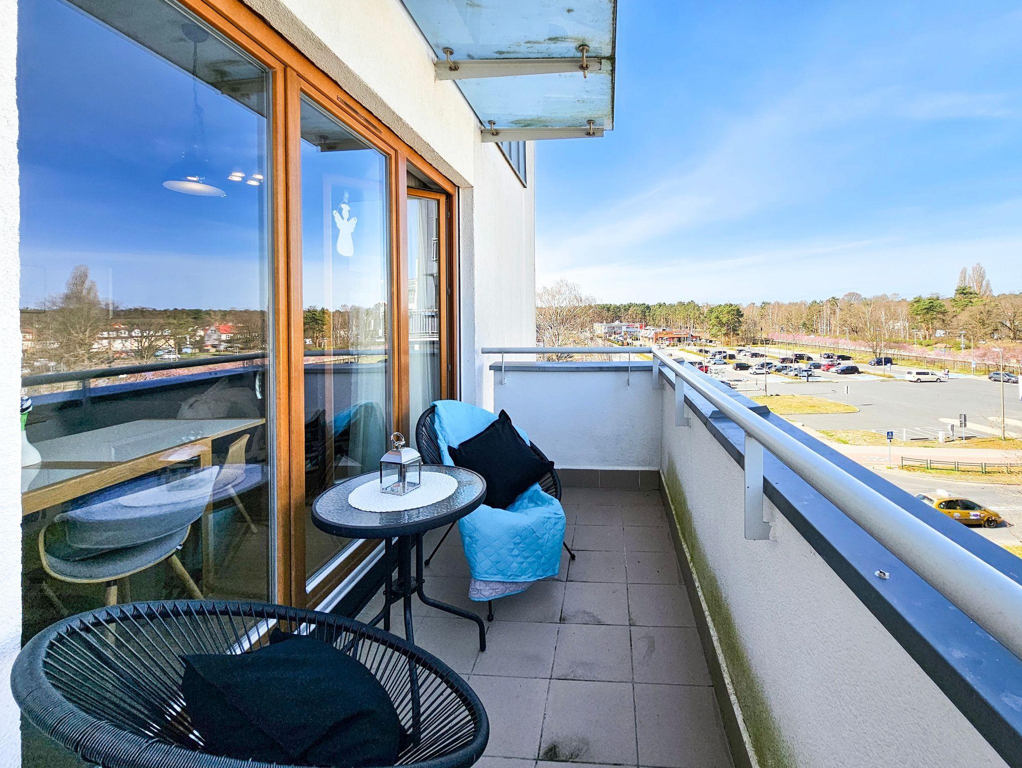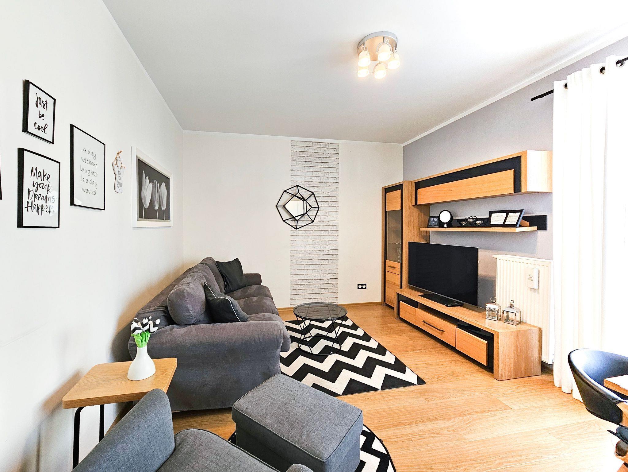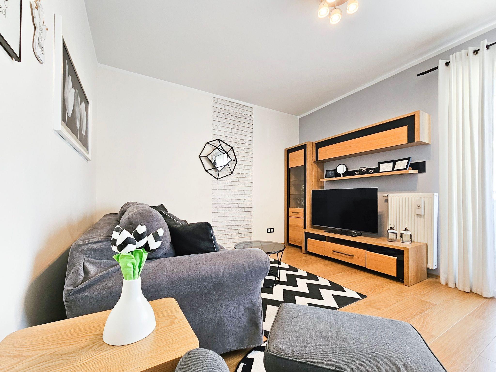 Die geräumige (44m2) 2-Zimmer-Ferienwohnung mit Balkon ist im 3. Stock eines Gebäudes mit Aufzug. Das Wohnzimmer besteht aus einem Erholungsbereich und einer Küchenzeile. Im Wohnzimmer, mit Balkonausgang, steht ein großes Ecksofa mit Schlaffunktion (Schlaffläche 140x200cm), eine Kommode mit einem TV - Kabelanschluss (deutschsprachige Sender sind zugänglich).
