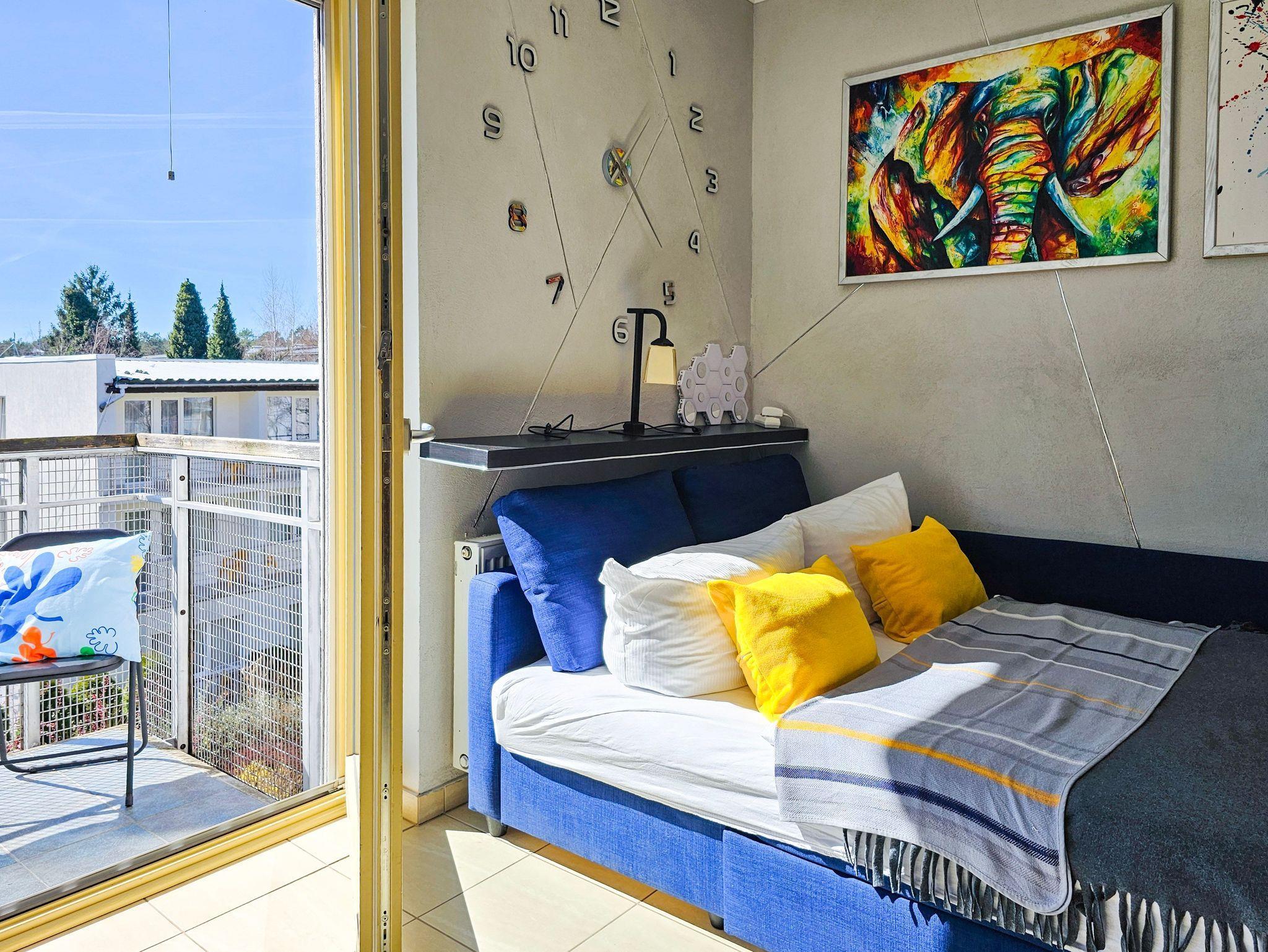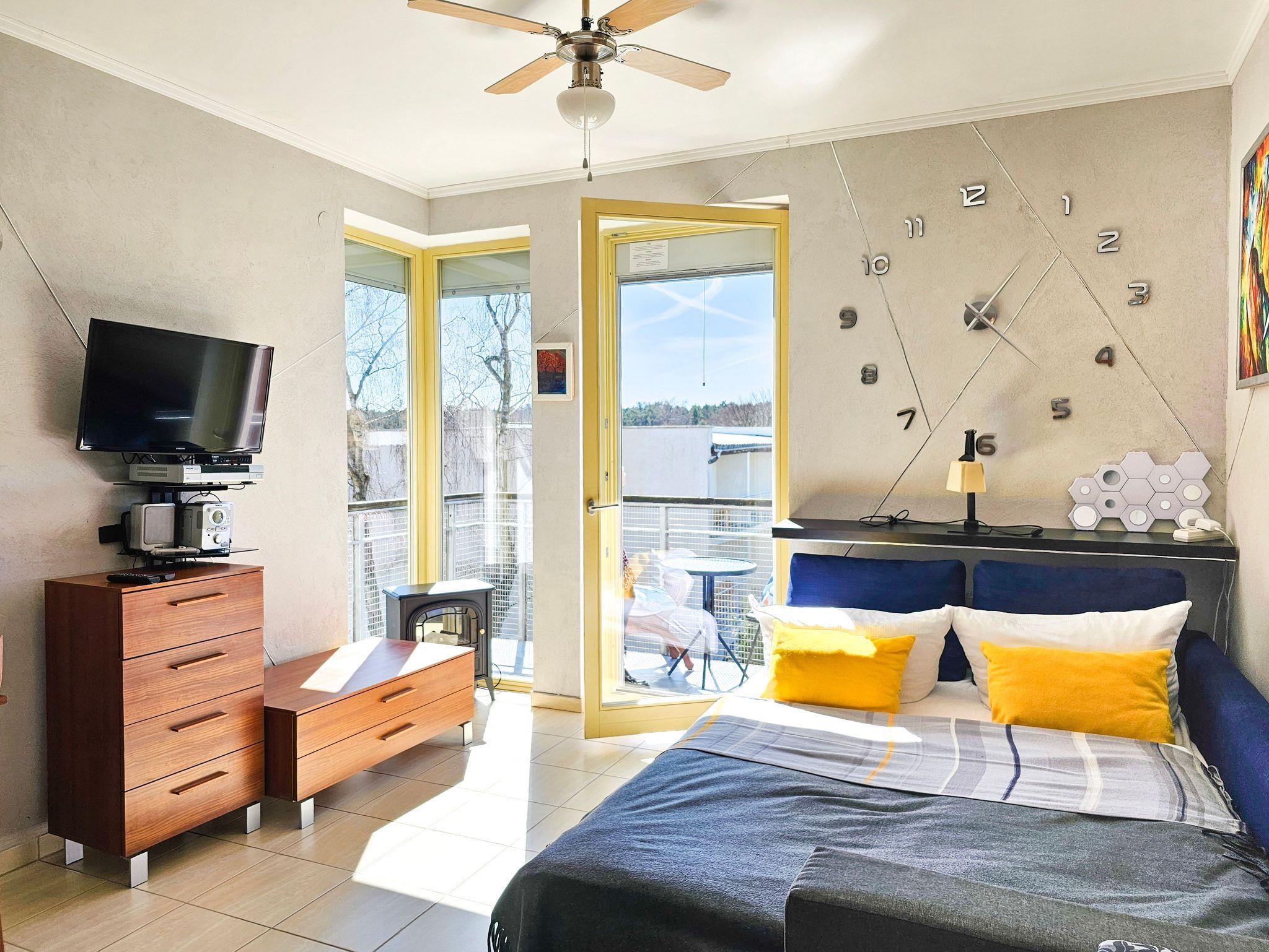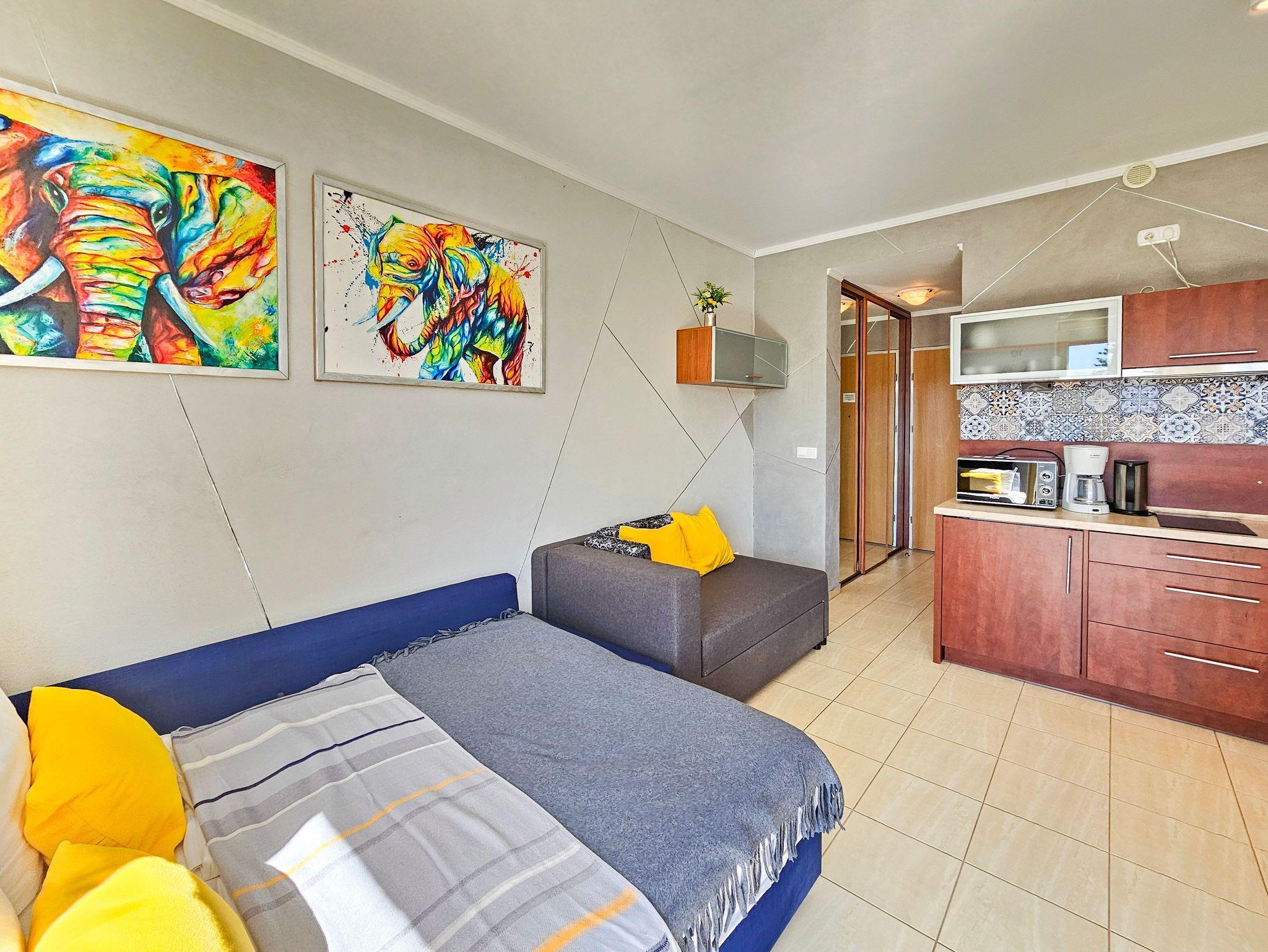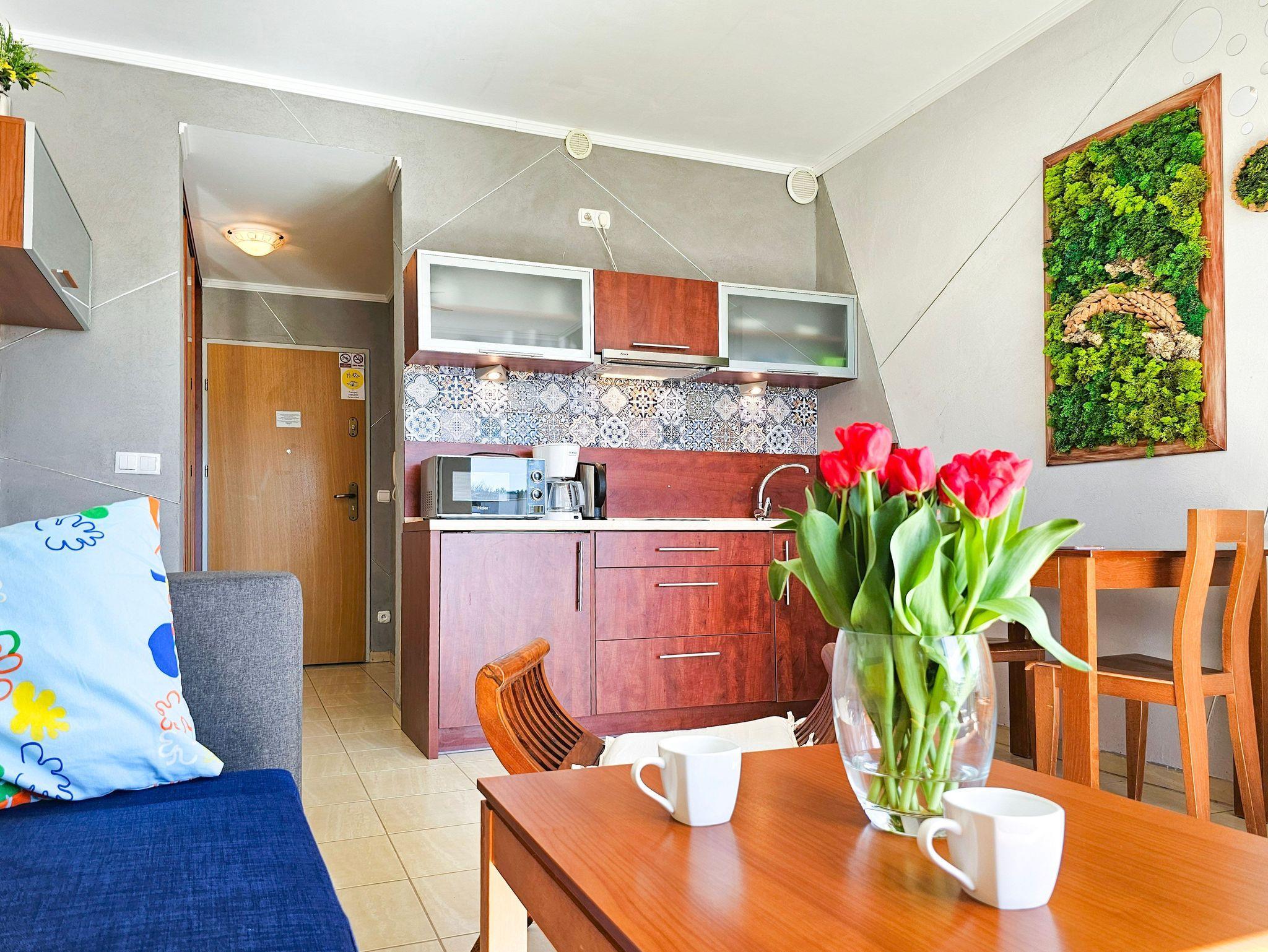 Das Studio-Apartment mit einem Raum und Balkon hat eine Fläche von 30 m². Der Balkon und die Fenster sind nach Süden ausgerichtet. Den Gästen stehen ein Ecksofa (Schlafbereich 140x200 cm) und ein ausziehbares Einzelsofa, ein Esstisch mit Stühlen und ein Couchtisch zur Verfügung. Die Kochnische ist mit einem Unterschrankkühlschrank, einer Elektroplatte mit 2 Kochfeldern, einer Mikrowelle, einem Wasserkocher und einer Filterkaffeemaschine ausgestattet. Es gibt einen Fernseher mit polnischen und deutschen terrestrischen Programmen. Kostenloser WLAN-Internetzugang ist verfügbar. Das Badezimmer verfügt über ein Waschbecken, eine Duschkabine und eine Toilette. Im Flur befindet sich ein großer Schrank. Bügeleisen und Bügelbrett sind vorhanden. Haustiere sind willkommen. Der Balkon und die Fenster des Apartments sind nach Süden ausgerichtet. Die Fenster sind mit Außenrollos ausgestattet.