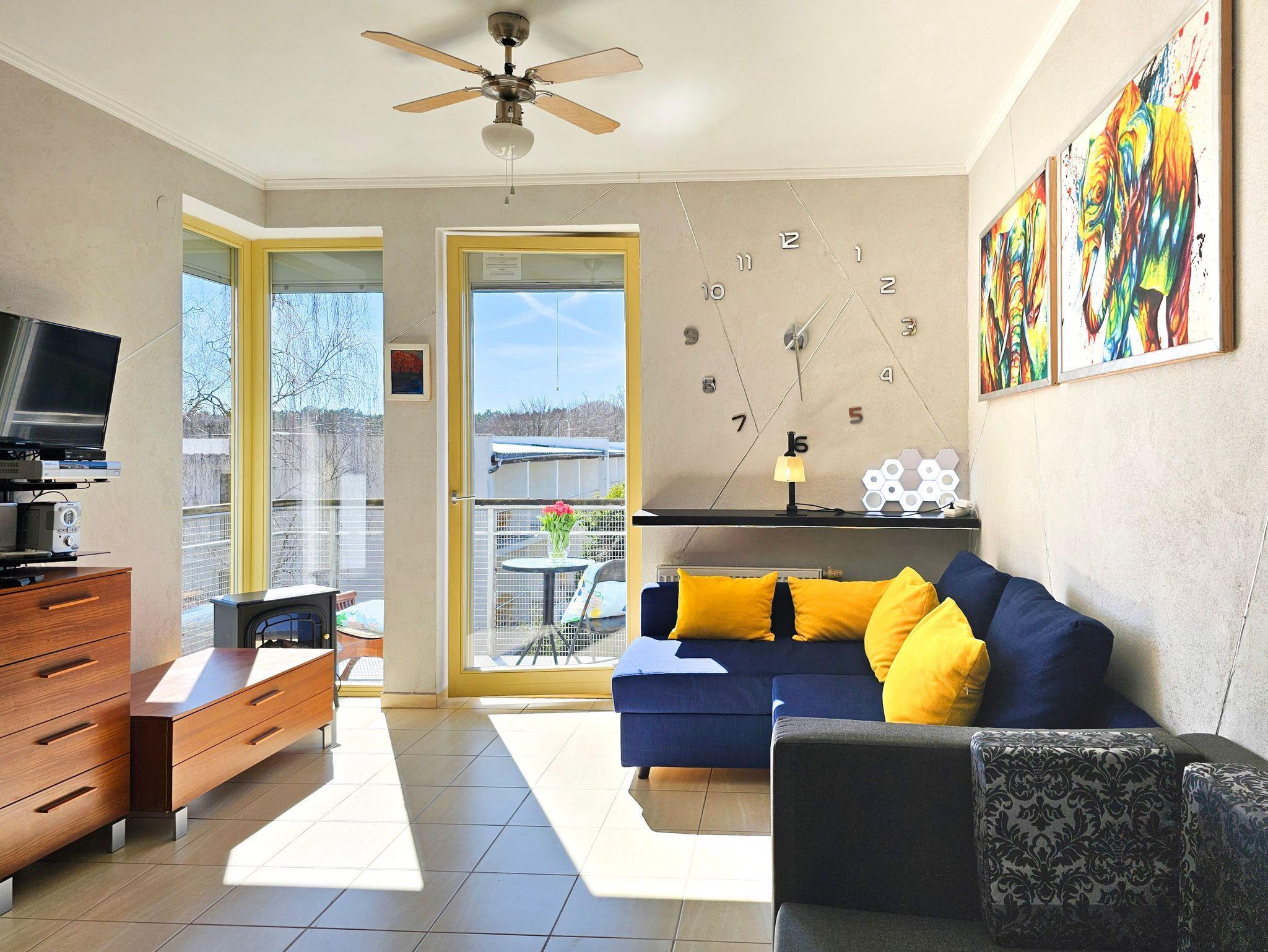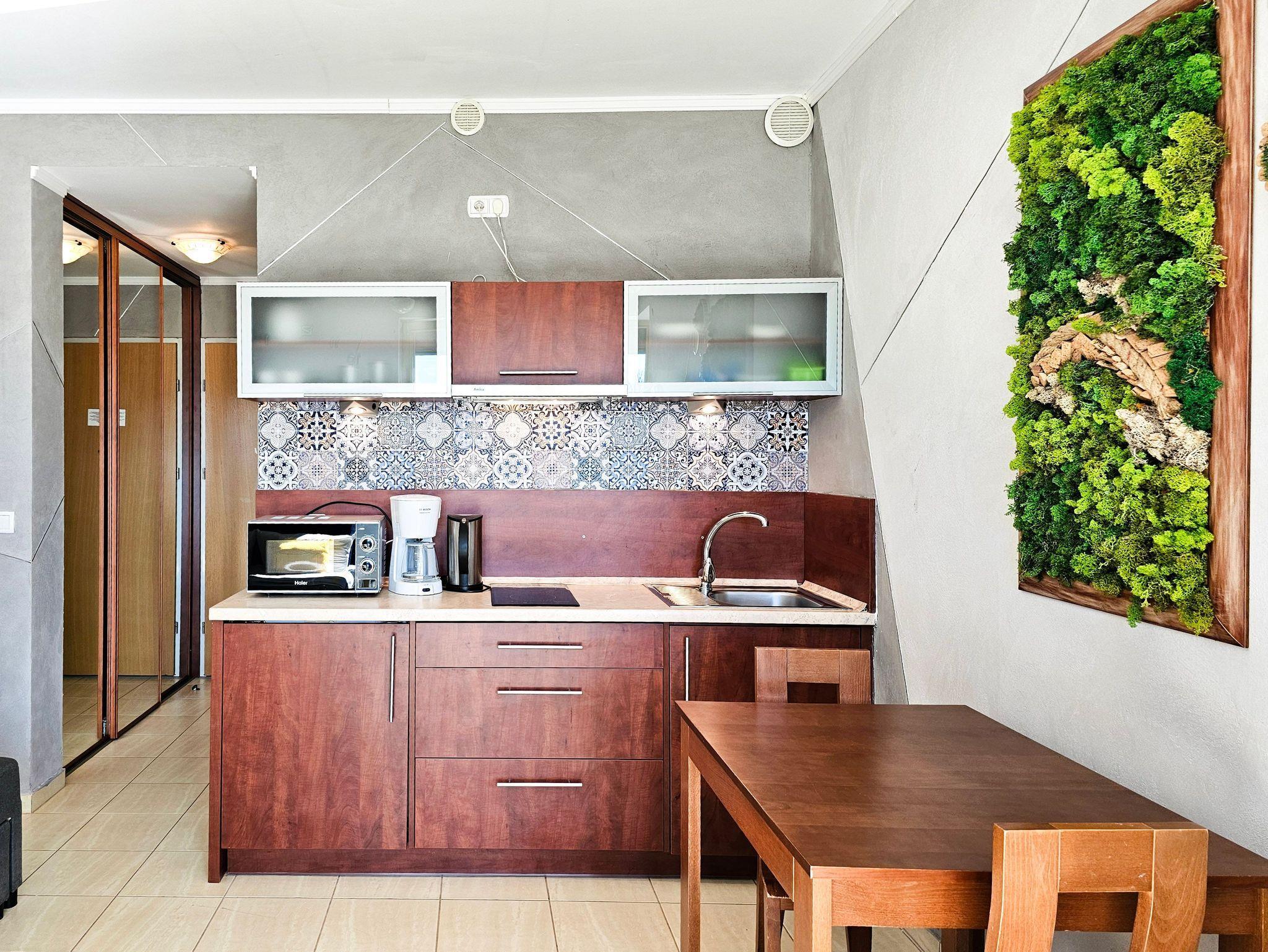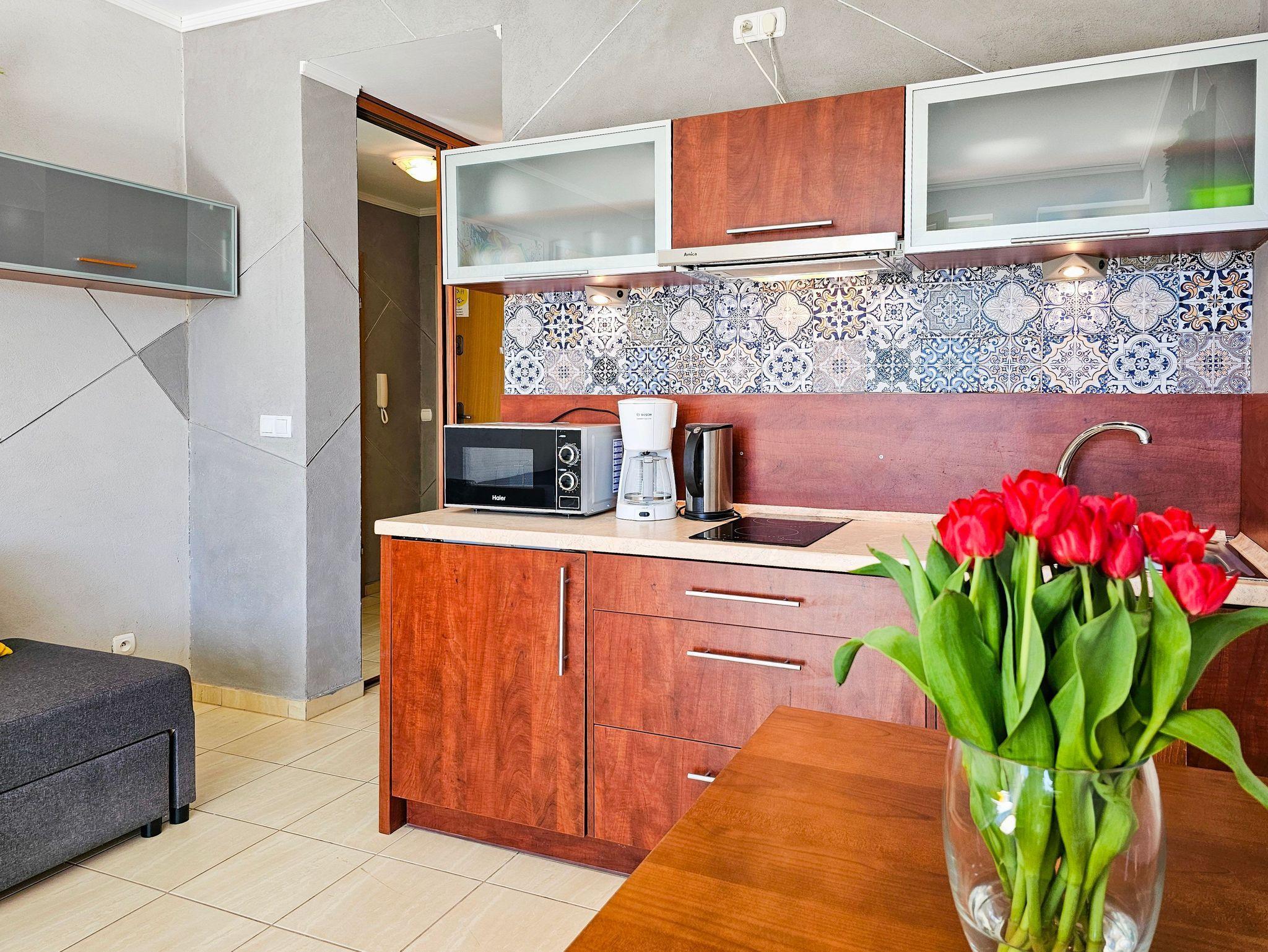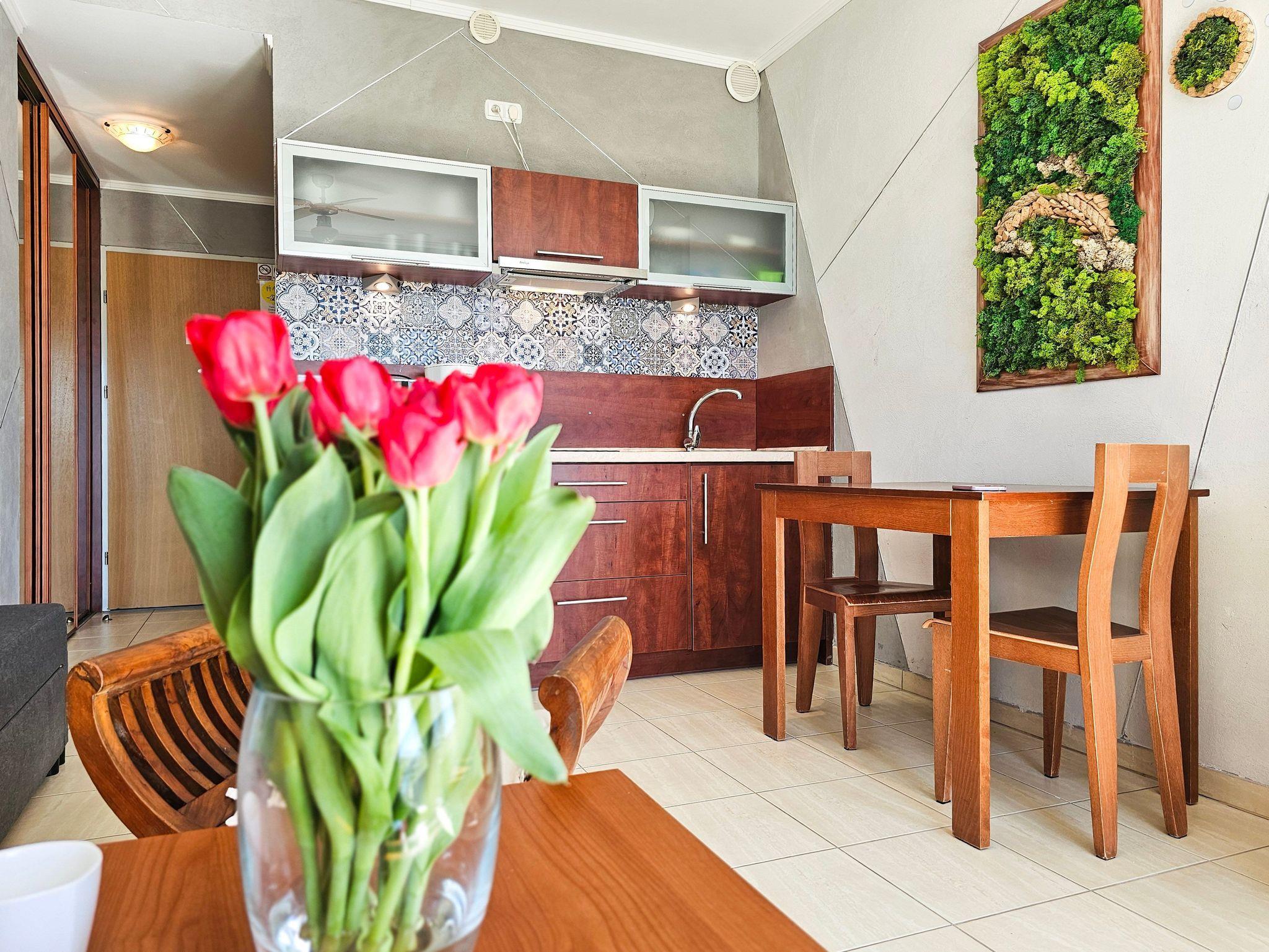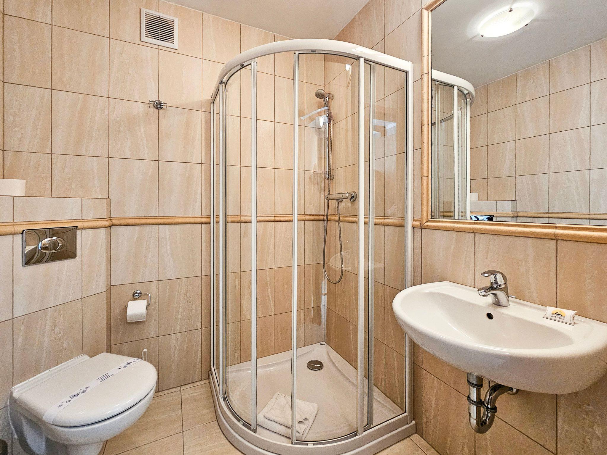 Das Studio-Apartment mit einem Raum und Balkon hat eine Fläche von 30 m². Der Balkon und die Fenster sind nach Süden ausgerichtet. Den Gästen stehen ein Ecksofa (Schlafbereich 140x200 cm) und ein ausziehbares Einzelsofa, ein Esstisch mit Stühlen und ein Couchtisch zur Verfügung. Die Kochnische ist mit einem Unterschrankkühlschrank, einer Elektroplatte mit 2 Kochfeldern, einer Mikrowelle, einem Wasserkocher und einer Filterkaffeemaschine ausgestattet. Es gibt einen Fernseher mit polnischen und deutschen terrestrischen Programmen. Kostenloser WLAN-Internetzugang ist verfügbar. Das Badezimmer verfügt über ein Waschbecken, eine Duschkabine und eine Toilette. Im Flur befindet sich ein großer Schrank. Bügeleisen und Bügelbrett sind vorhanden. Haustiere sind willkommen. Der Balkon und die Fenster des Apartments sind nach Süden ausgerichtet. Die Fenster sind mit Außenrollos ausgestattet.