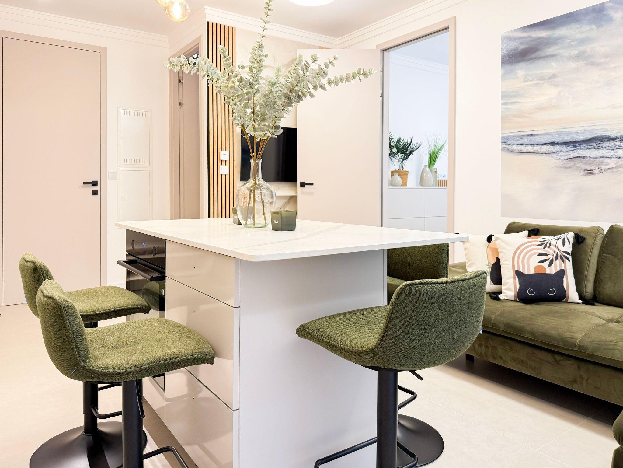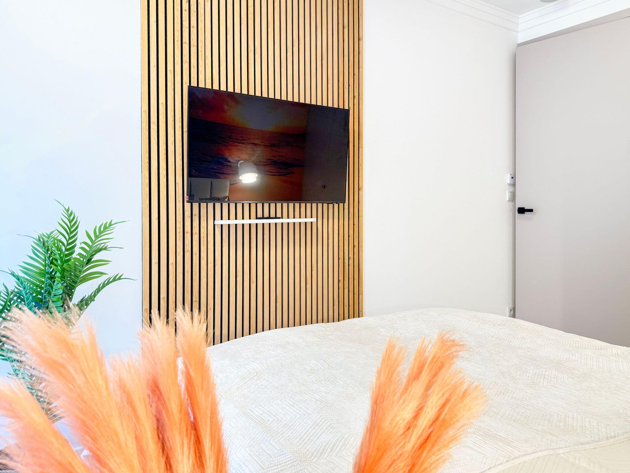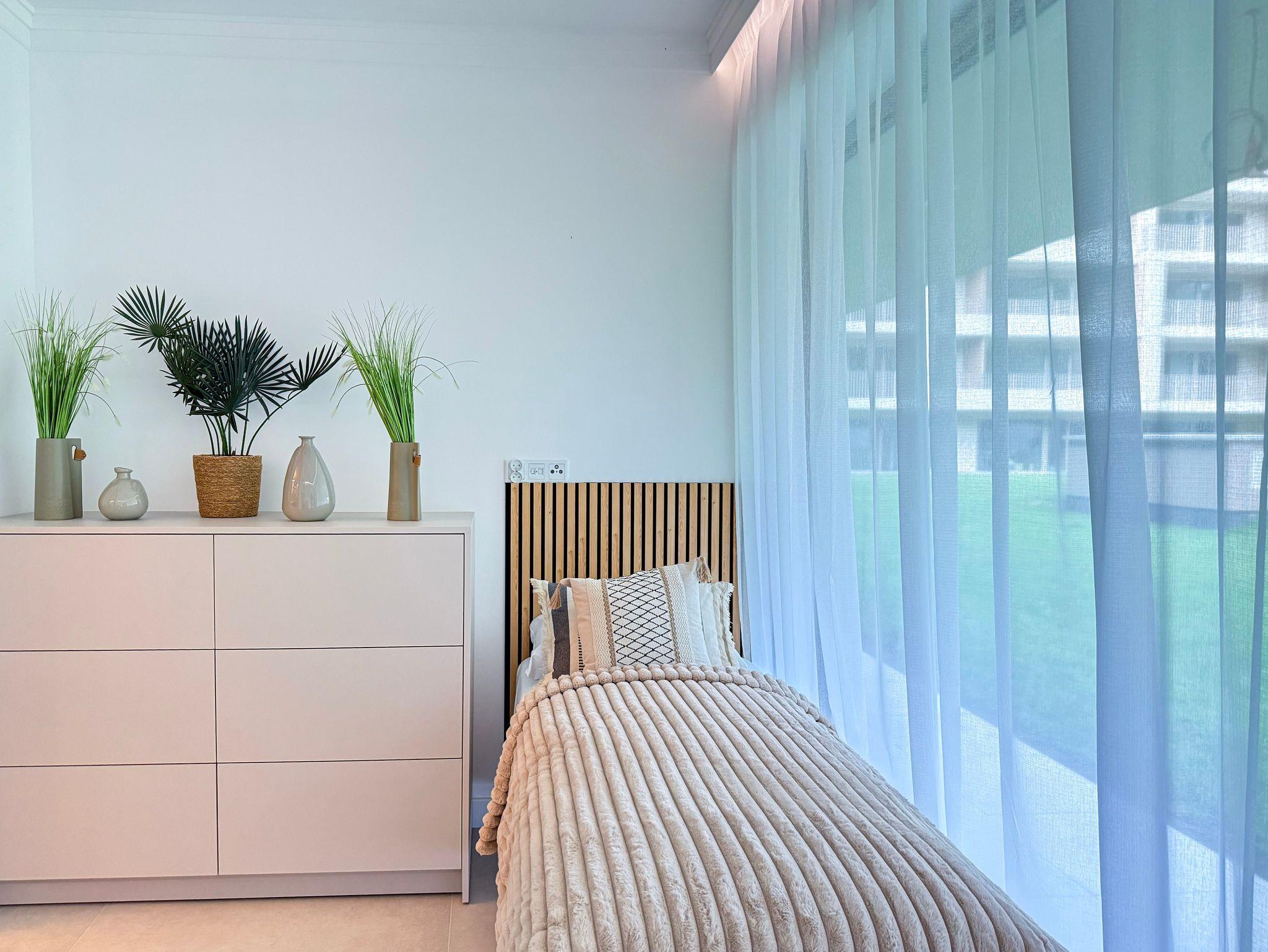 Das 46 m² große Apartment besteht aus zwei Schlafzimmern, einem Wohnzimmer und einer Terrasse. Es ist modern eingerichtet und wurde kürzlich zur Nutzung freigegeben. Im Wohnzimmer befinden sich ein Schlafsofa, ein Fernseher und eine gut ausgestattete Küchenzeile. Den Gästen stehen Geschirr, eine Spülmaschine, ein Backofen, ein Kochfeld, ein Kühlschrank, eine Filterkaffeemaschine, ein Toaster und ein Wasserkocher zur Verfügung.