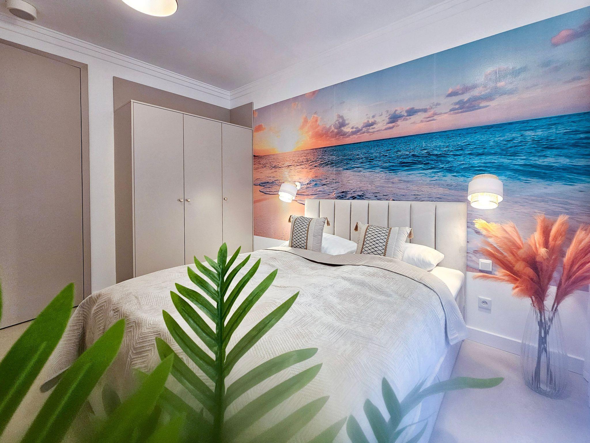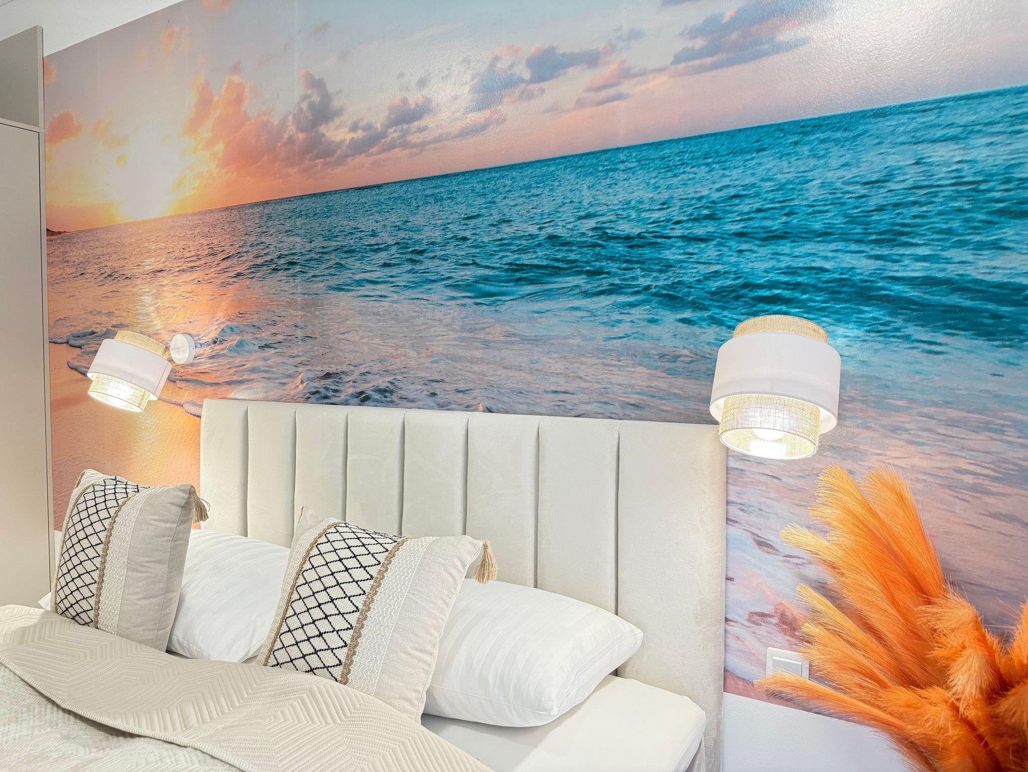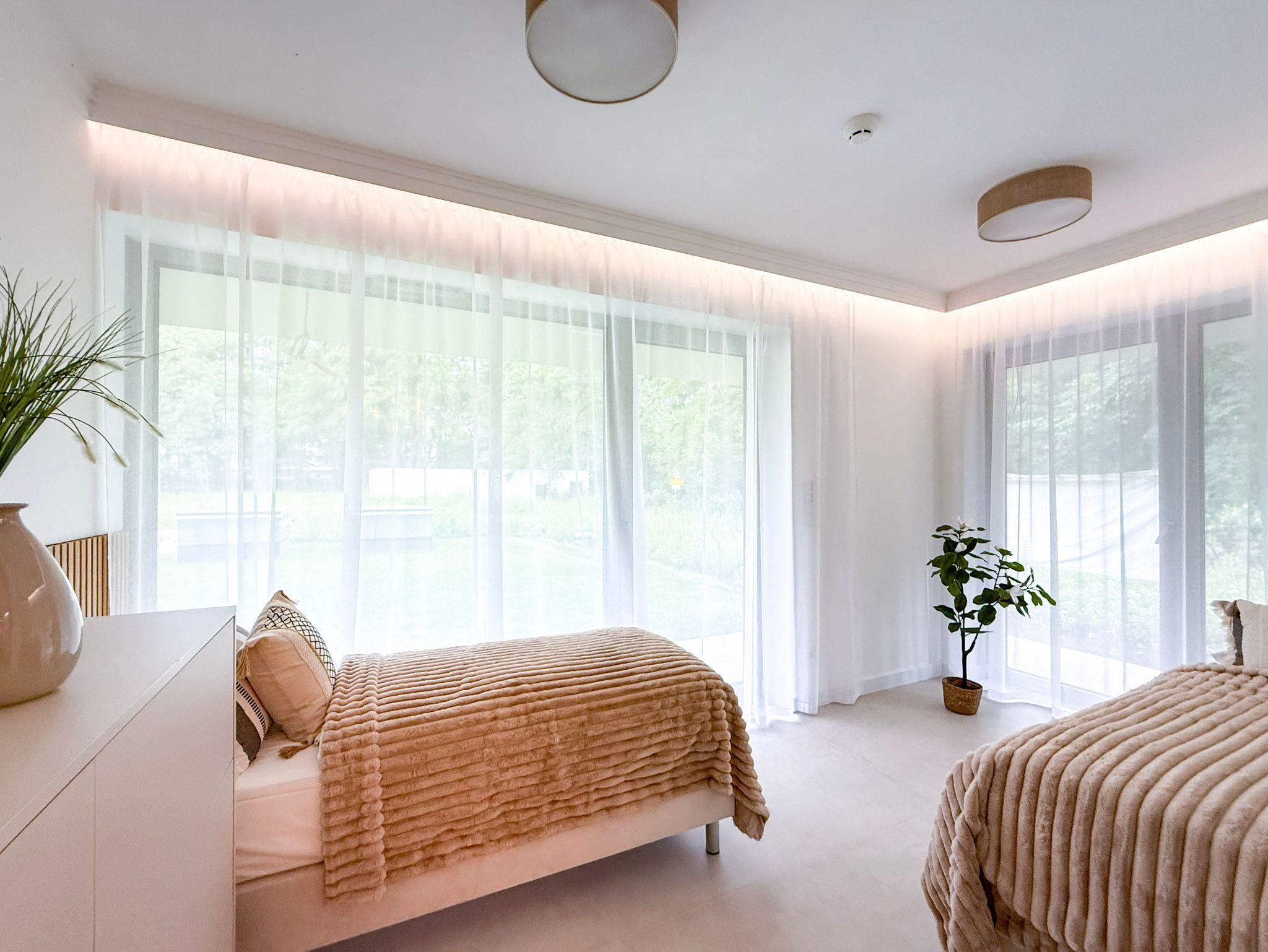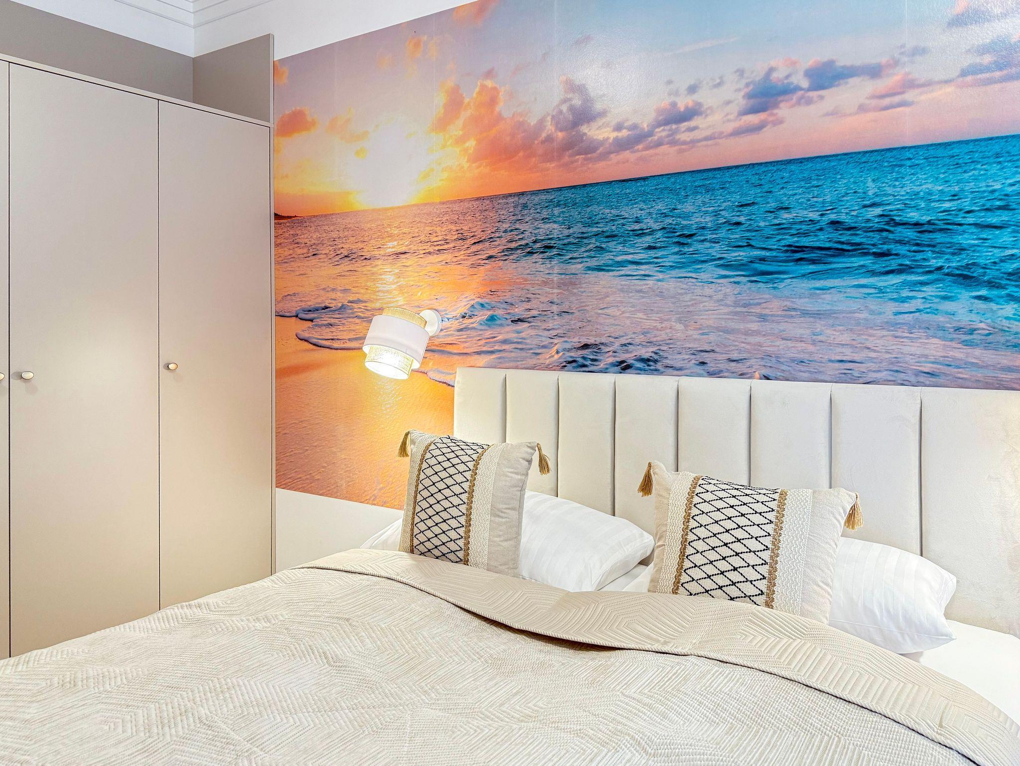 Das 46 m² große Apartment besteht aus zwei Schlafzimmern, einem Wohnzimmer und einer Terrasse. Es ist modern eingerichtet und wurde kürzlich zur Nutzung freigegeben. Im Wohnzimmer befinden sich ein Schlafsofa, ein Fernseher und eine gut ausgestattete Küchenzeile. Den Gästen stehen Geschirr, eine Spülmaschine, ein Backofen, ein Kochfeld, ein Kühlschrank, eine Filterkaffeemaschine, ein Toaster und ein Wasserkocher zur Verfügung.
