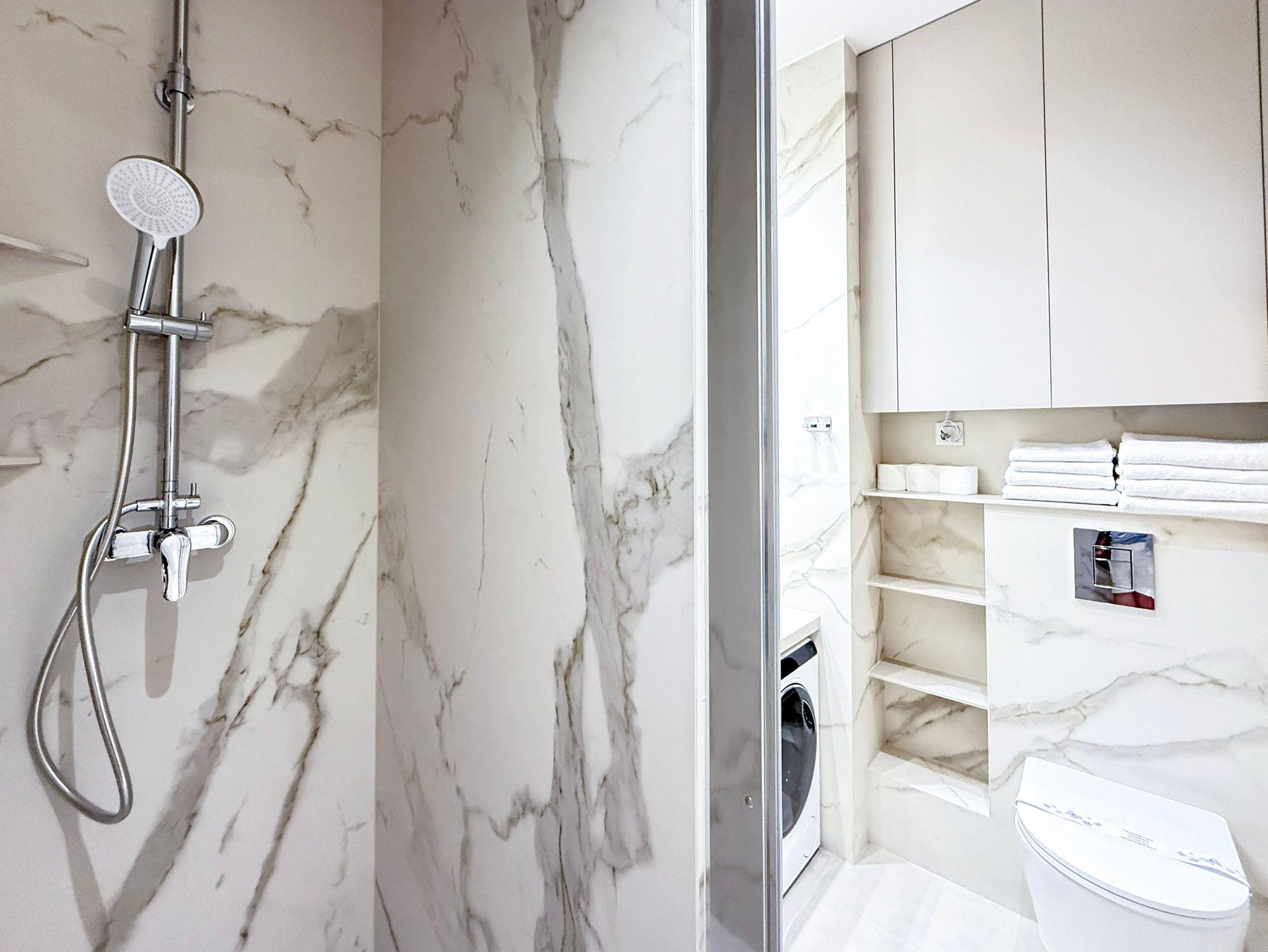 Das Badezimmer ist mit einer ebenerdigen Dusche, einem Waschbecken, einem WC und einer Waschmaschine ausgestattet. Zum Apartment gehört ein Stellplatz in der Tiefgarage. Hunde sind wilkommen.
