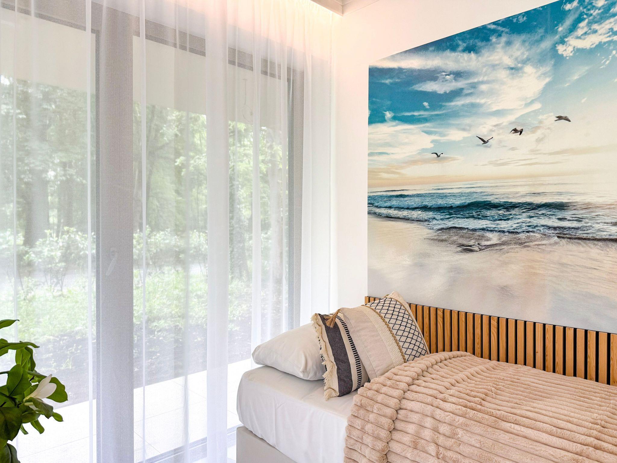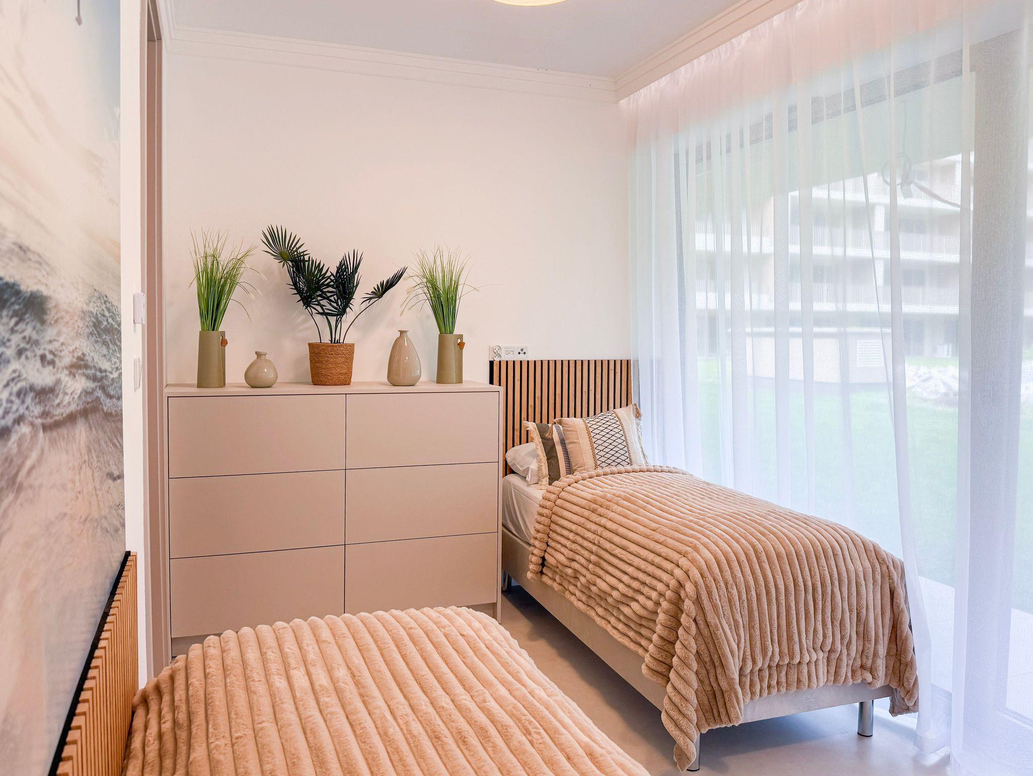Eines der Schlafzimmer ist mit einem Doppelbett (160x200 cm), einem Kleiderschrank und einem Fernseher ausgestattet. Das zweite Schlafzimmer verfügt über zwei Einzelbetten (80x200 cm) und eine Kommode. Von allen Zimmern aus gelangt man auf die Terrasse.