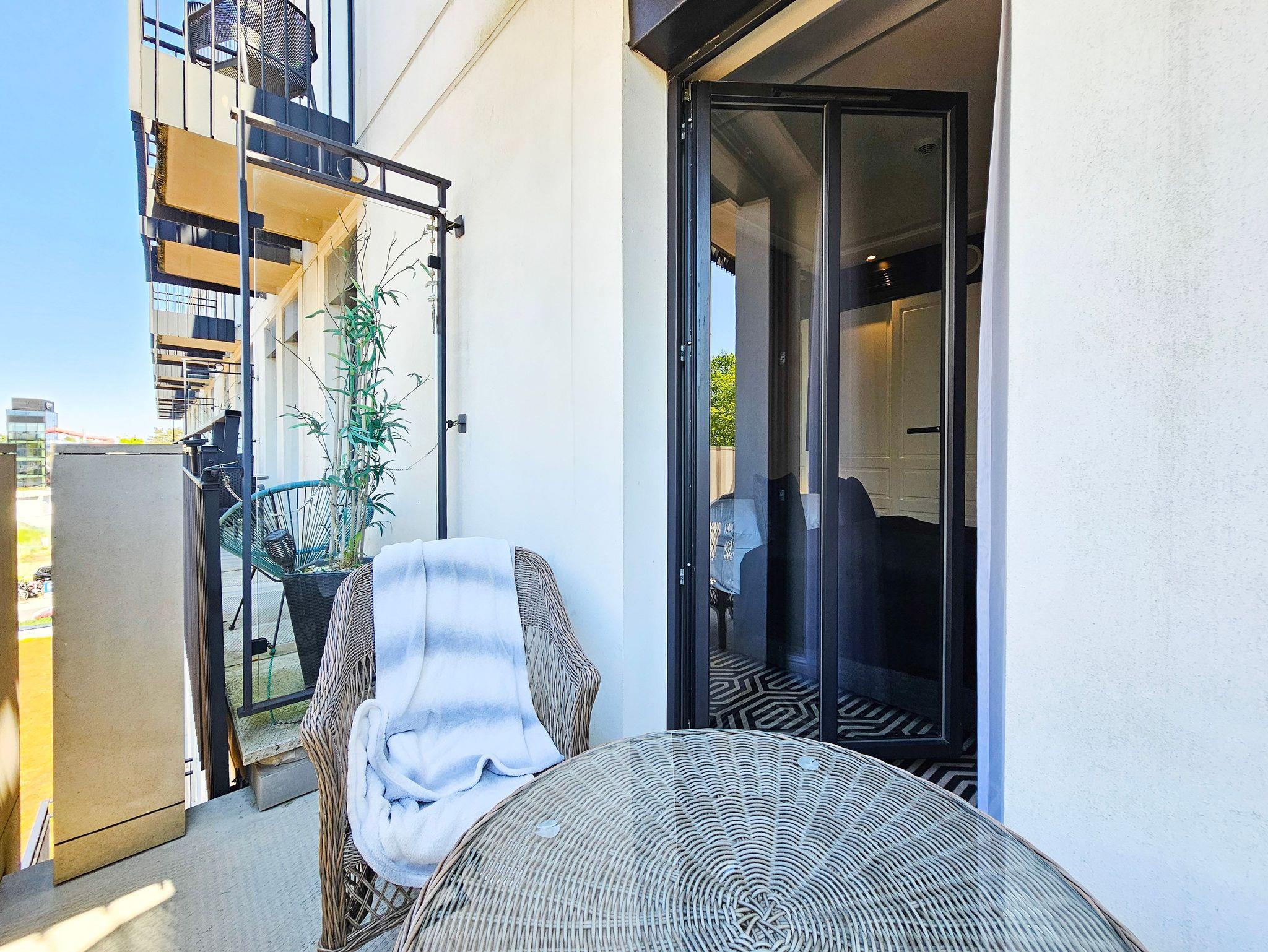 Das Schlafzimmer verfügt über ein Doppelbett (140x200 cm), einen Fernseher und einen Kleiderschrank. Im Badezimmer gibt es eine ebenerdige Dusche, ein Waschbecken, eine Toilette und einen Haartrockner. Sowohl vom Wohnzimmer als auch vom Schlafzimmer hat man Zugang zum Balkon. Fenster und Balkon sind nach Westen ausgerichtet. Der Balkon ist mit zwei Sesseln und einem Tisch ausgestattet und bietet in nördlicher Richtung einen Blick auf die Ostsee.