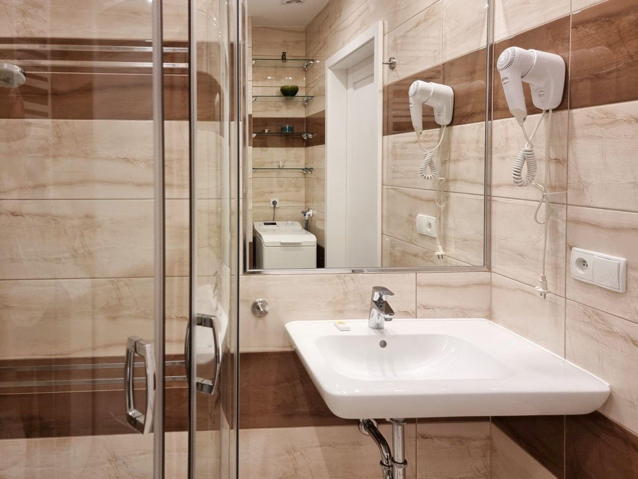 Im Badezimmer befindet sich eine Dusche, ein Waschbecken, eine Toilette und Waschmaschine.