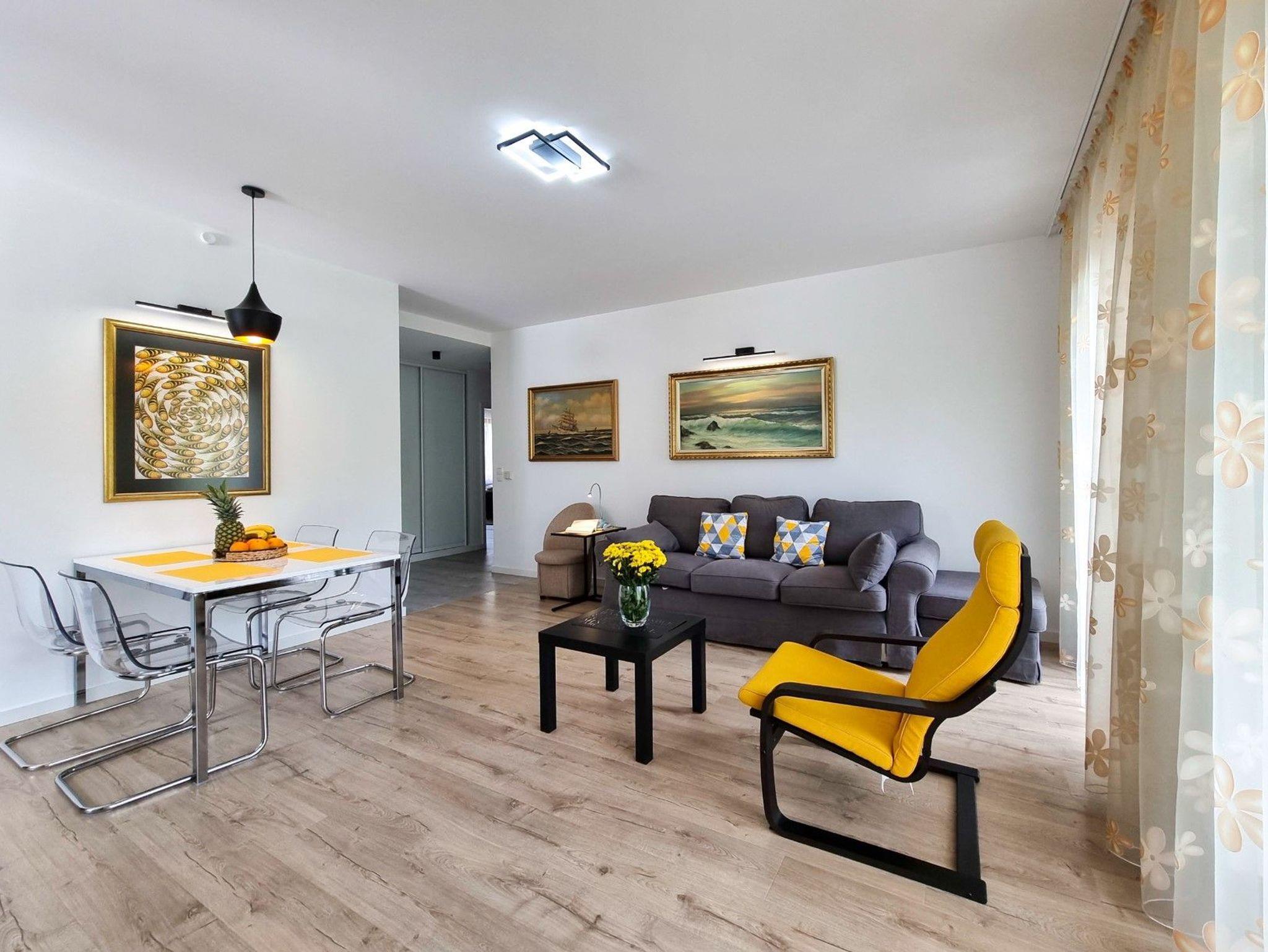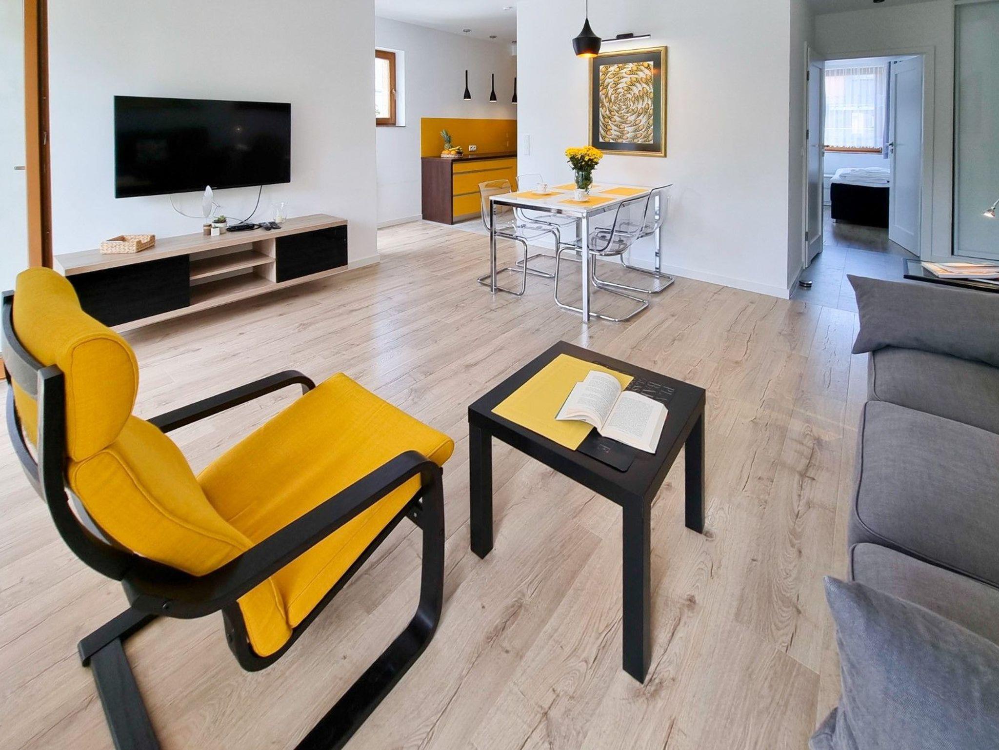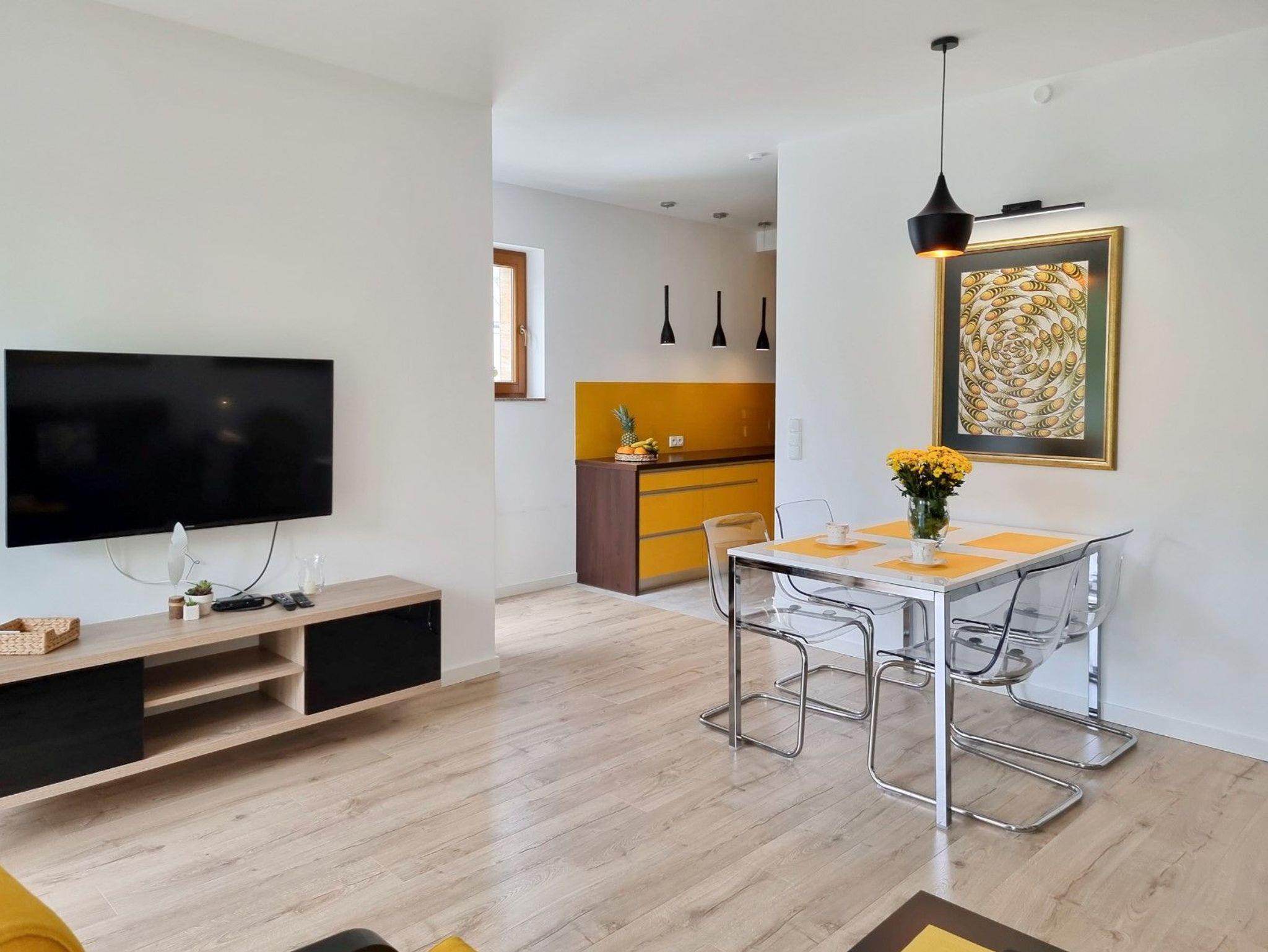 Das Wohnzimmer besteht aus einem ausklappbaren Ecksofa (Fläche nach dem Ausklappen 140x200cm), welches man ebenfalls zum Schlafen nutzen kann, einem Couchtisch, einem Esstisch mit 4 Stühlen und einem Fernseher, der den Empfang polnischer und deutscher Sender ermöglicht.