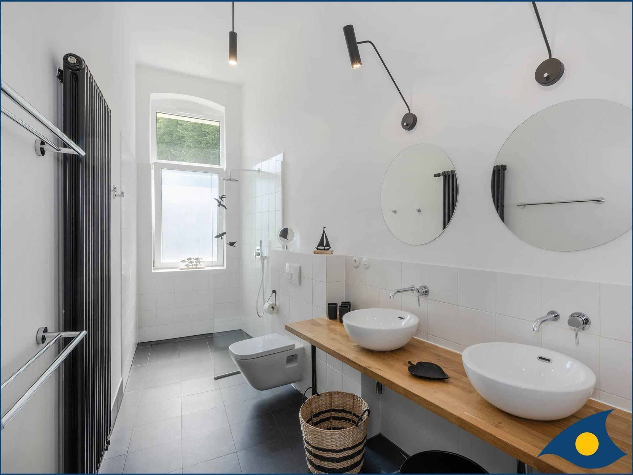 Das Wohnzimmer ist mit zwei bequemen Ledercouchen von Rolf Benz ausgestattet, in allen Zimmern und im Flur sind aufwendig die alten Dielenböden restauriert und erhalten worden. In der Küche ist ebenfalls ein geölter neuer Dielenboden verlegt, die Bäder sind gefliest, die Duschbereiche sind als offene bodengleiche Wohlfühlzonen gestaltet.
