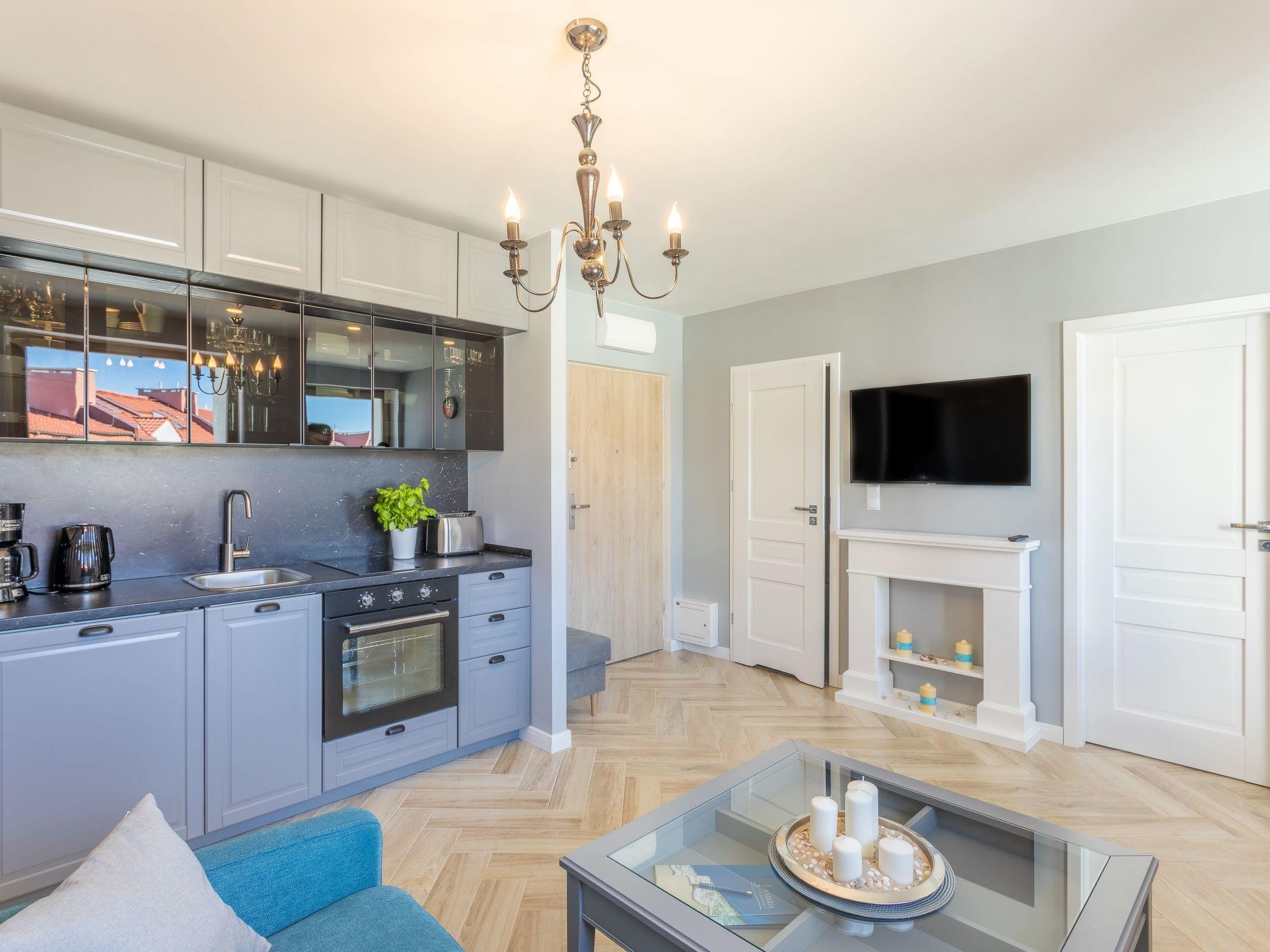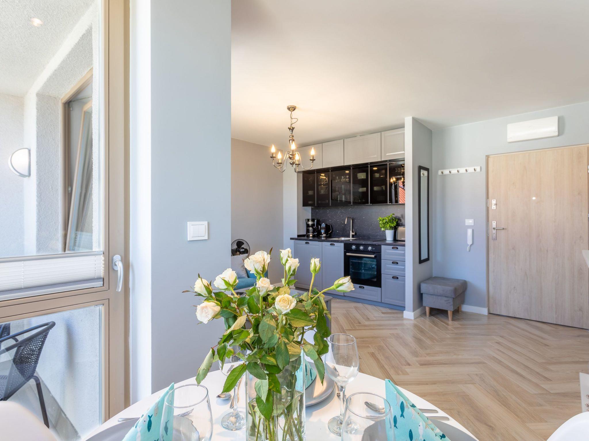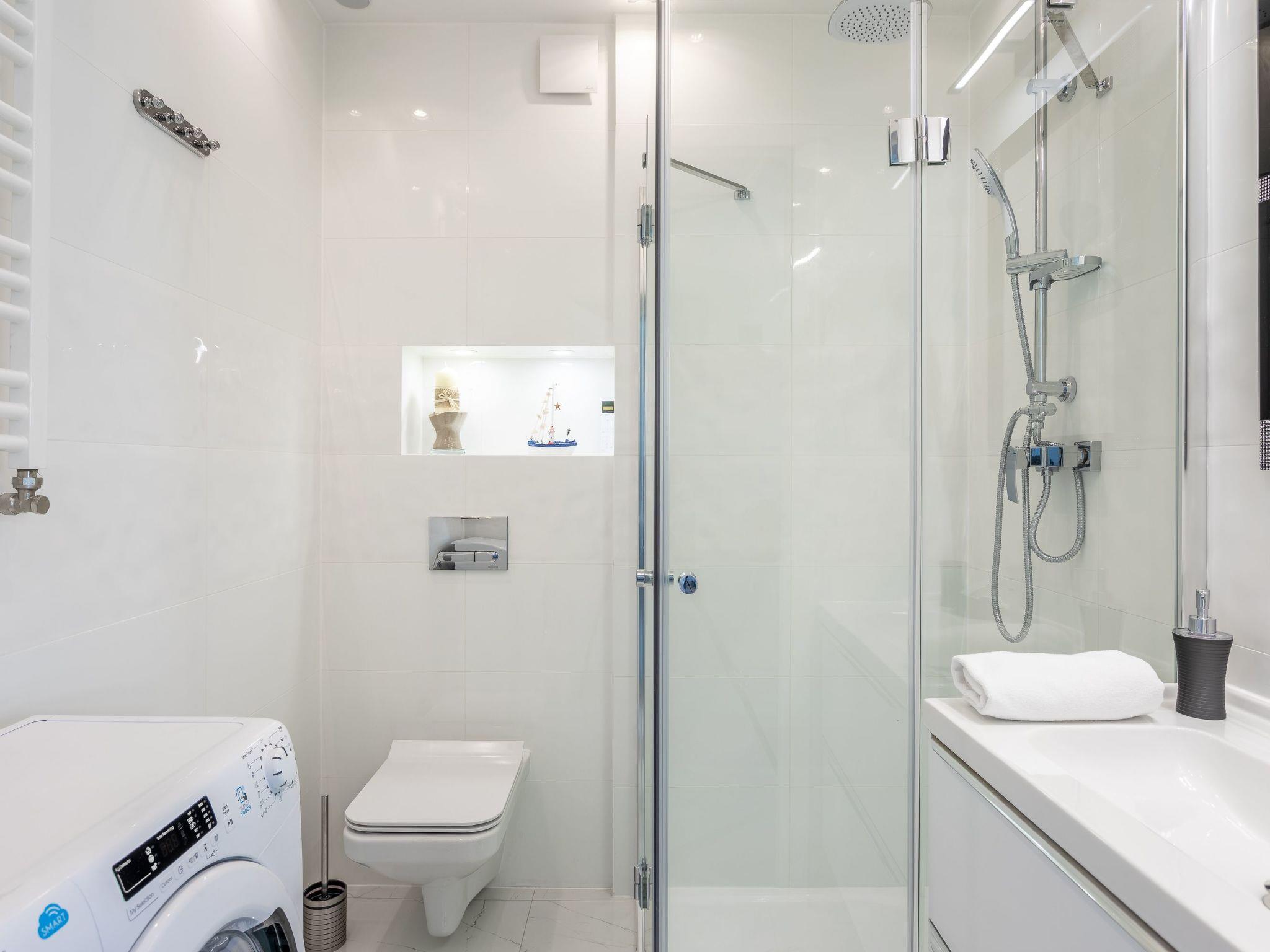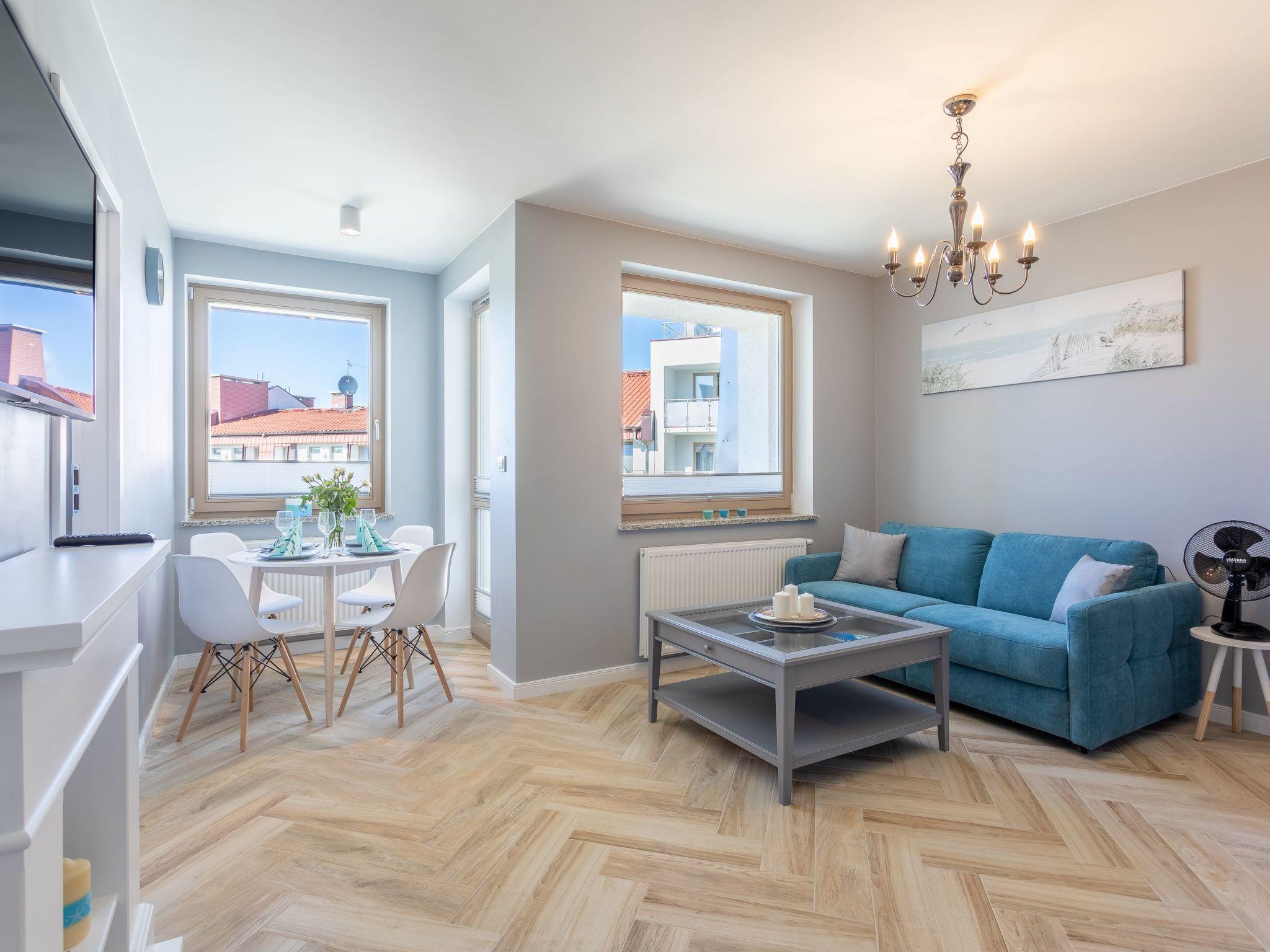 It is a flat with a very spacious bedroom, living room with a well-equipped kitchenette, dining area and modern bathroom with a total area of 29 m2 and a balcony. A comfortable double bed in the bedroom and a sofa with sleeping function and Italian folding frame ensure a good night's sleep. "Maritime" is a stylish, classic interior in shades of white, grey and blue. They are characterised above all by elegance, comfort and good taste as well as dimensional accuracy and symmetry, which form a harmonious whole. Since no equipment has been placed there by mistake, the room is primarily functional and offers comfort for guests who value peace, harmony, minimalism and aesthetics in the furnishings. Perhaps a nap after dinner on a super-comfortable sofa with an additional sleeping function? Why not, especially when the colour blue is so vibrant and soothes the senses like wind, sky and sea ...