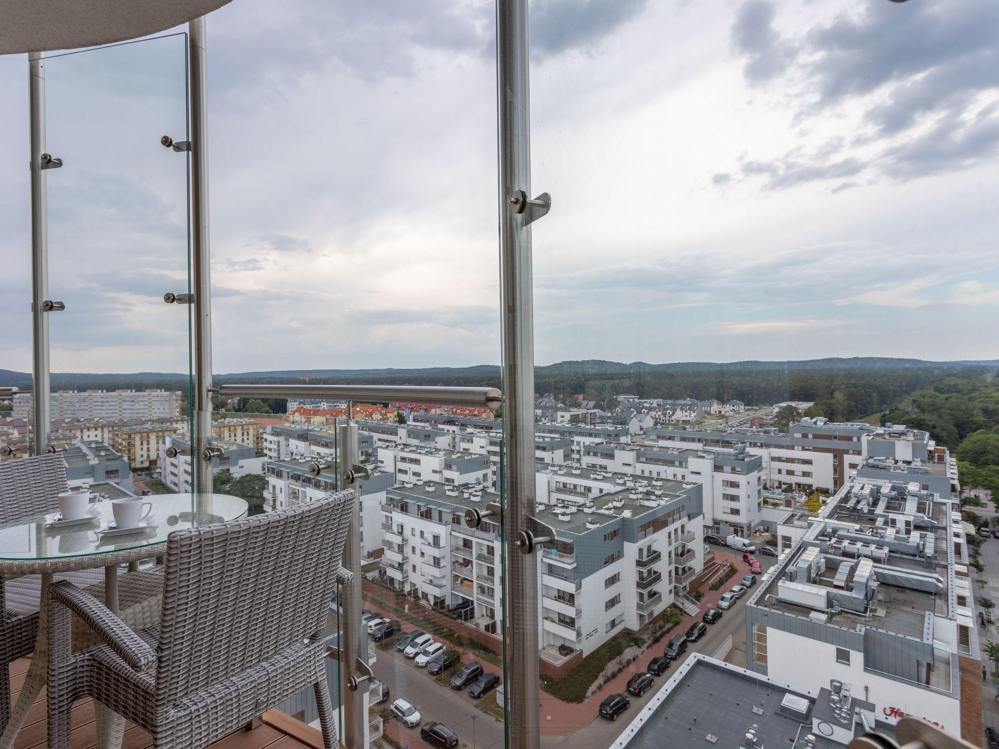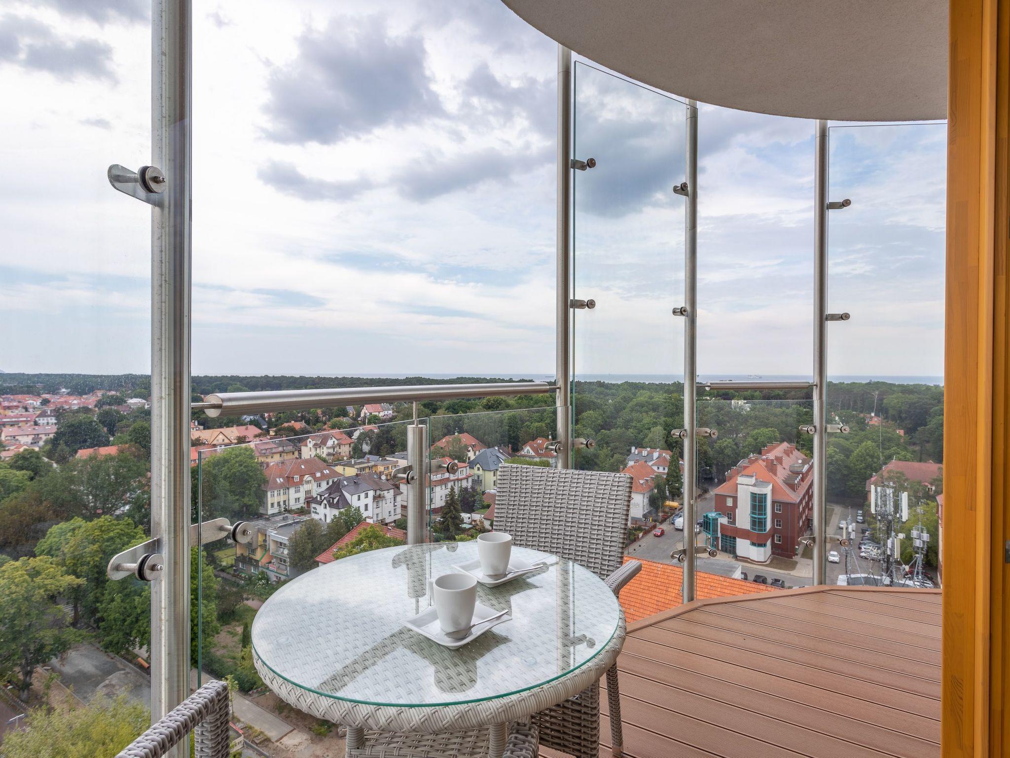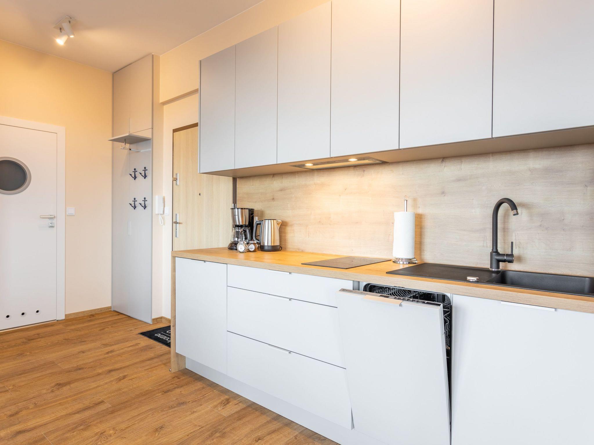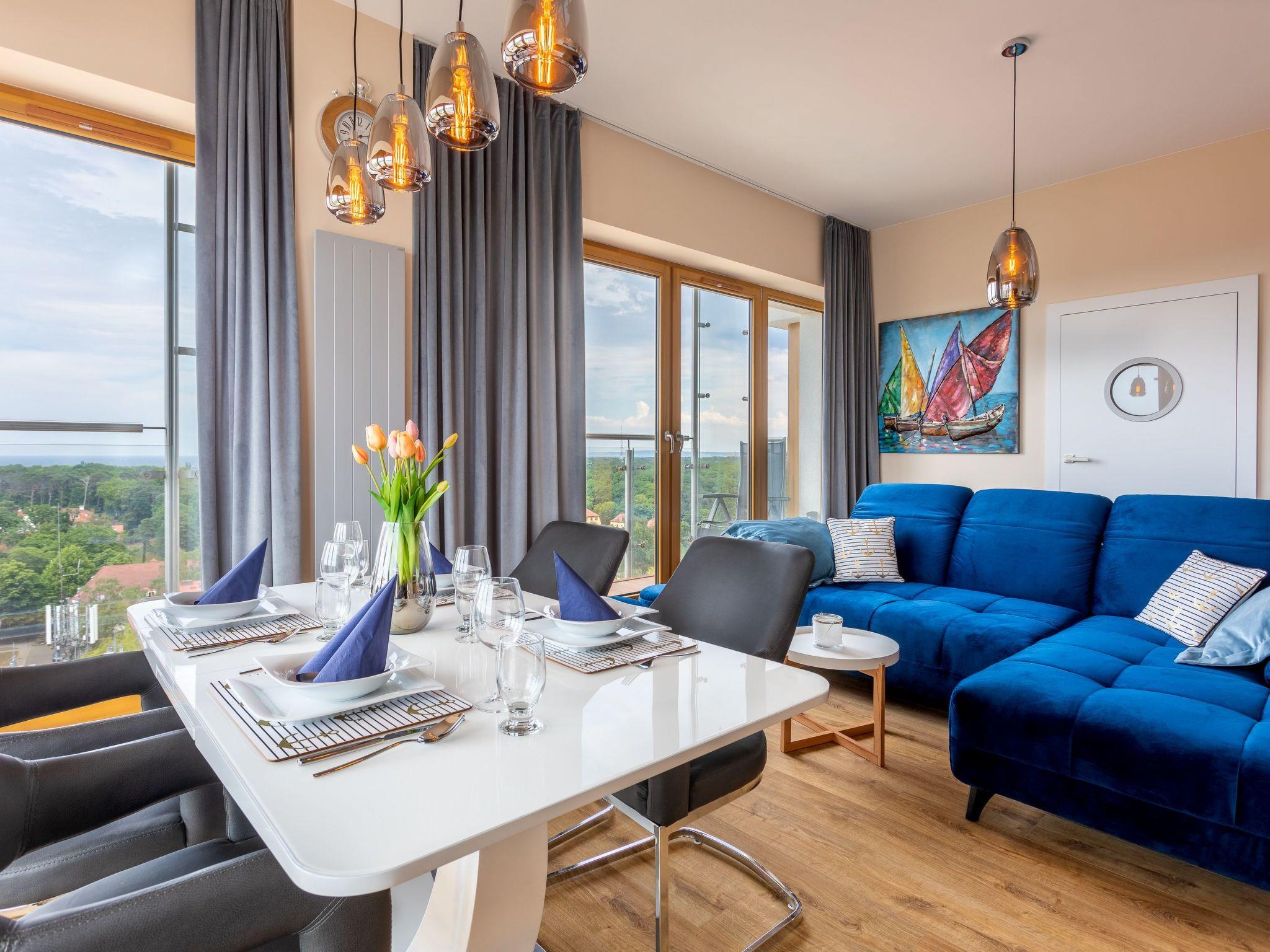 The "Tower 102" flat in Swinoujscie is particularly appreciated by our guests for its excellent location, the highest quality of equipment and a breathtaking view of the Baltic Sea and the panorama of Swinoujscie from the windows. It is an air-conditioned flat on the eleventh floor with one bedroom, a living room with a well-equipped kitchenette and a modern bathroom with a total area of 49 m2, as well as a large balcony, which is especially appreciated by guests because it allows moments of relaxation in the fresh air and at the same time in a quiet place. The interior is very bright, white, grey and beige dominate, evoking associations with sand, beach and sun, broken with a deep blue tone. In addition, thanks to the large and numerous glazed areas, a lot of daylight enters the interior, which also visually enlarges the space and gives it momentum. Attention is also drawn to expressive and very modern accessories as well as interesting shapes and textures - all with delicate and original marine motifs. The glazed doors, which echo the style of the windows in the ship's cabins, seem to be an extremely interesting solution. Without a doubt, you must go on board this deck!