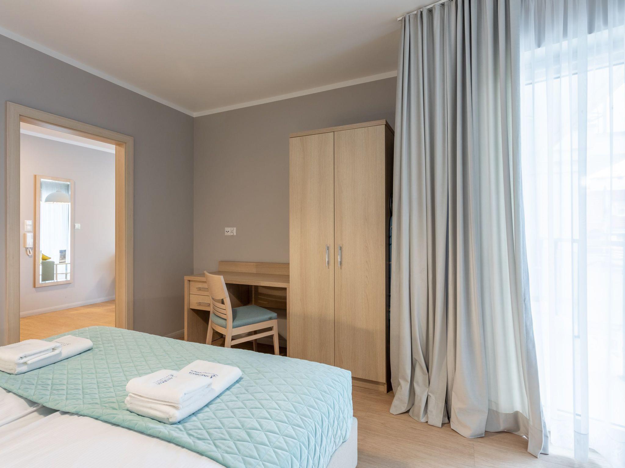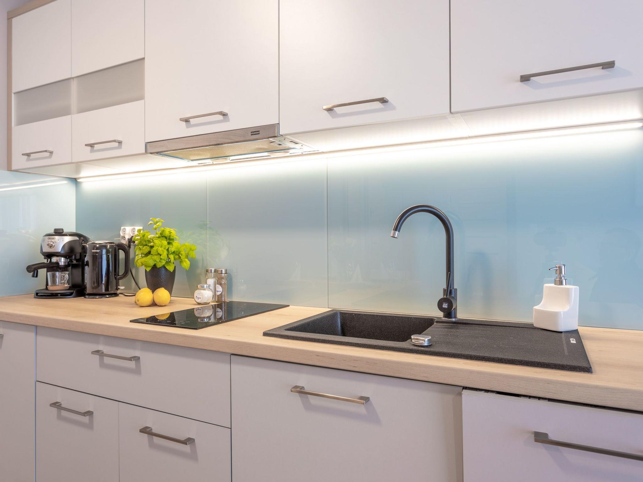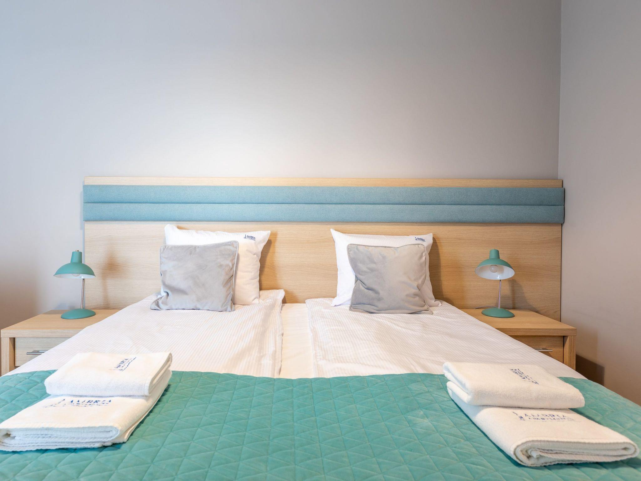 It is a flat with a very spacious bedroom, a living room with a well-equipped kitchenette and a modern bathroom with a total area of 41 m2, as well as a large south-east facing balcony, very well lit, where you can enjoy hours of sunlight. The interior is dominated by light, extremely soft colours: Blue, grey and beige. Numerous textile and decorative accessories complement the space and make you feel at home. It is an ideal offer for people who want to spend some time on the couch, read a book or have breakfast in an extremely comfortable bed and enjoy the aesthetics of an elegant interior.